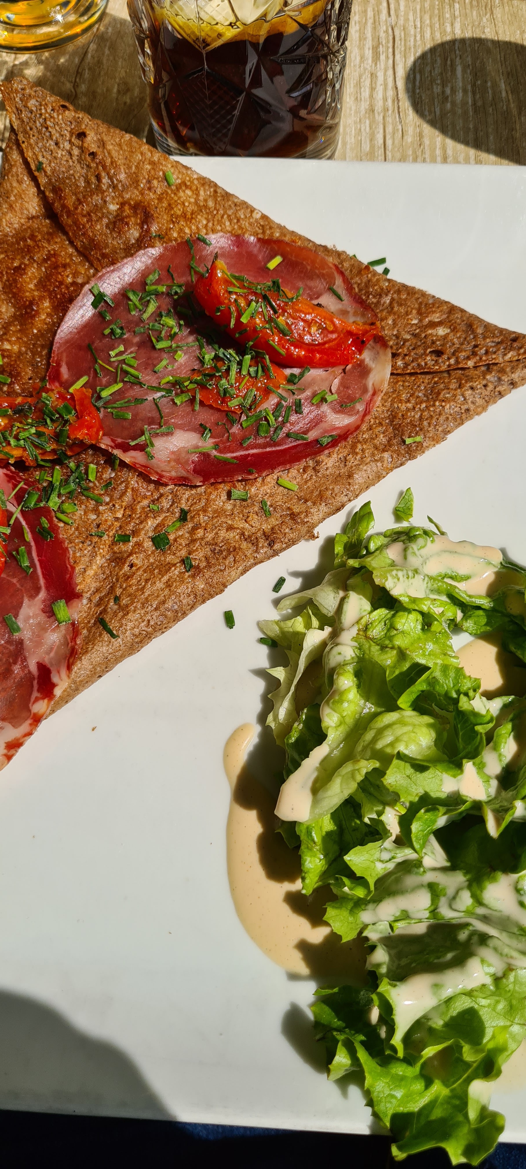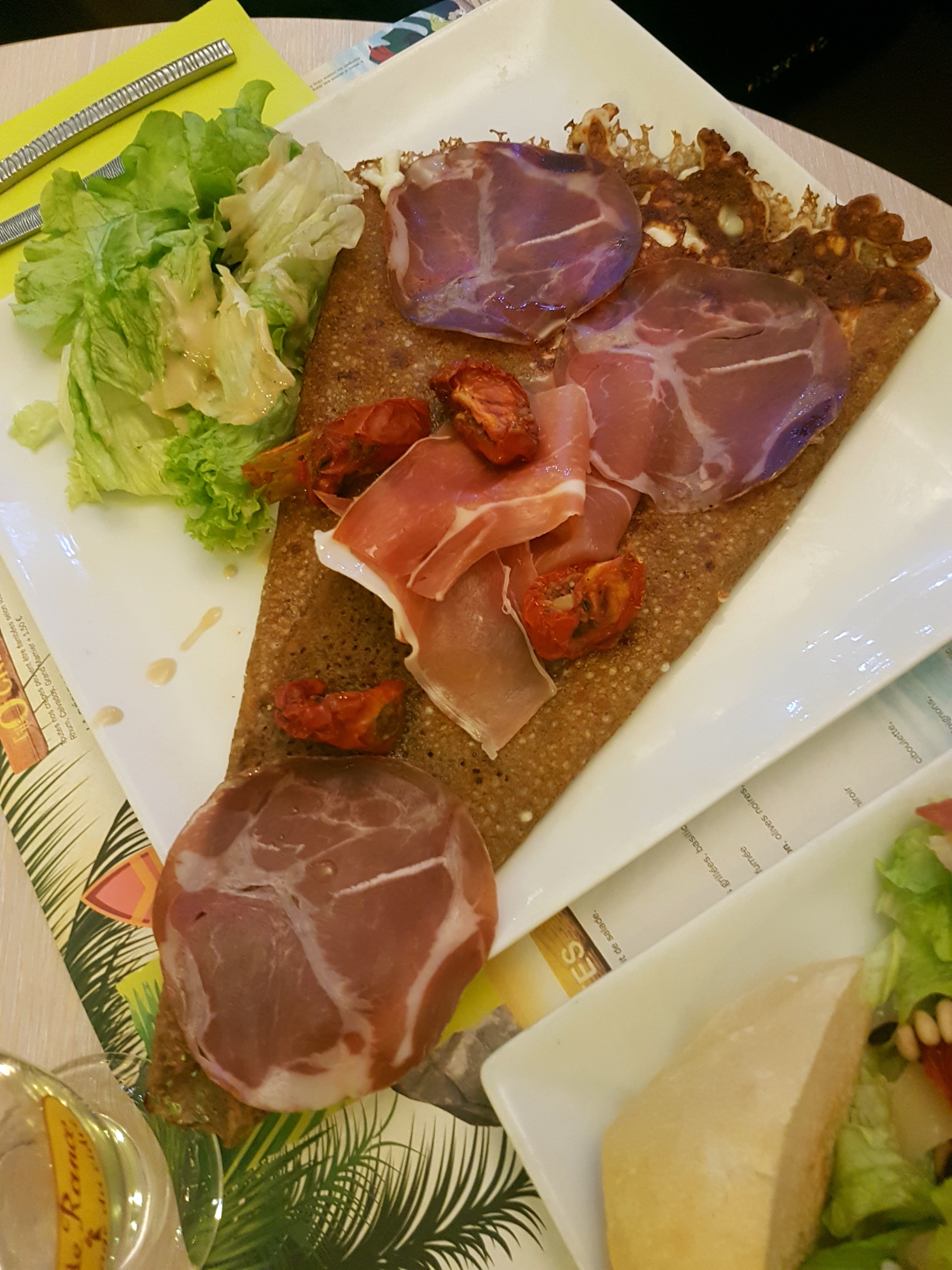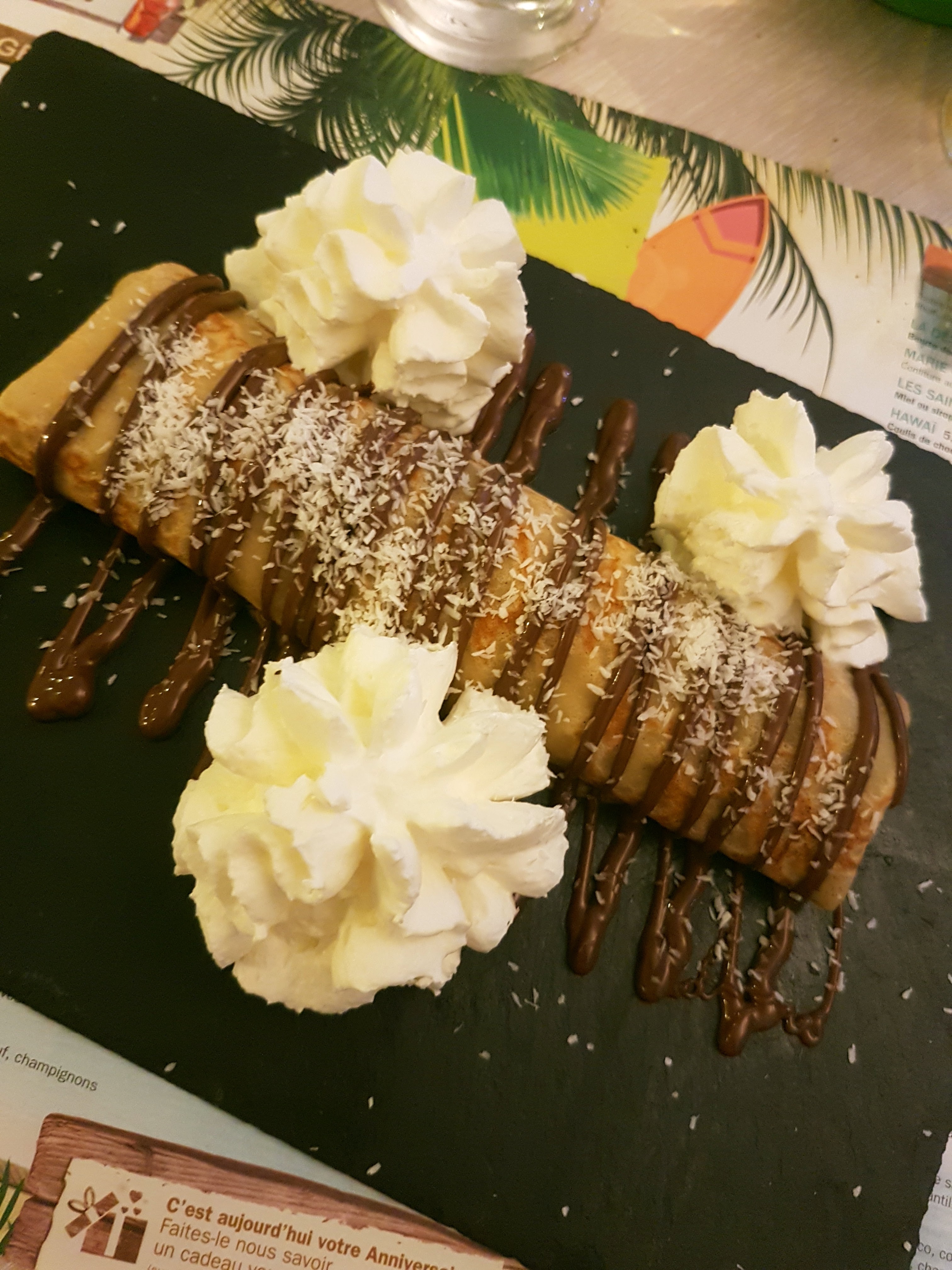J’avais réservé une table de 15 personnes pour y déjeuner après la visite du musée et du jardin d’Albert Kahn juste en face. On a déjeuné au 1ier étage. Les crêpes portent toutes le nom d’une île ce qui est original mais en plus elles étaient garnies avec des ingrédients inhabituels comme des courgettes par exemple. En tout cas elles étaient délicieuses.
