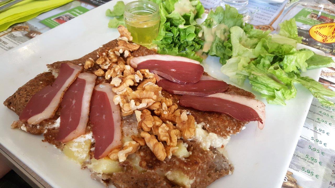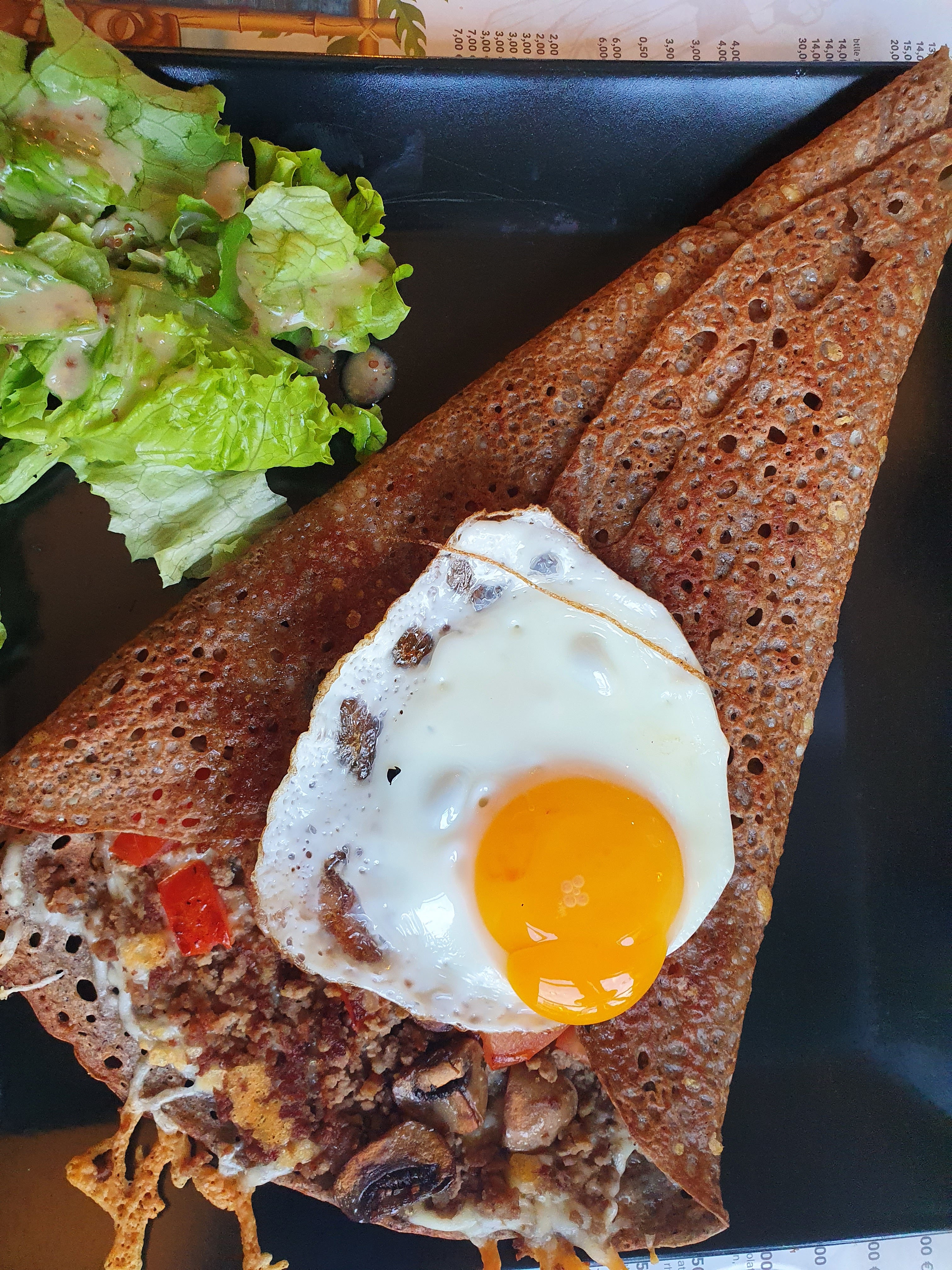 J'ai mangé pour vous une délicieuse crêpe île de Gorgone :steak haché, emmental, tomates fraîches, œuf, champignons. Un vrai régal. Je recommande
