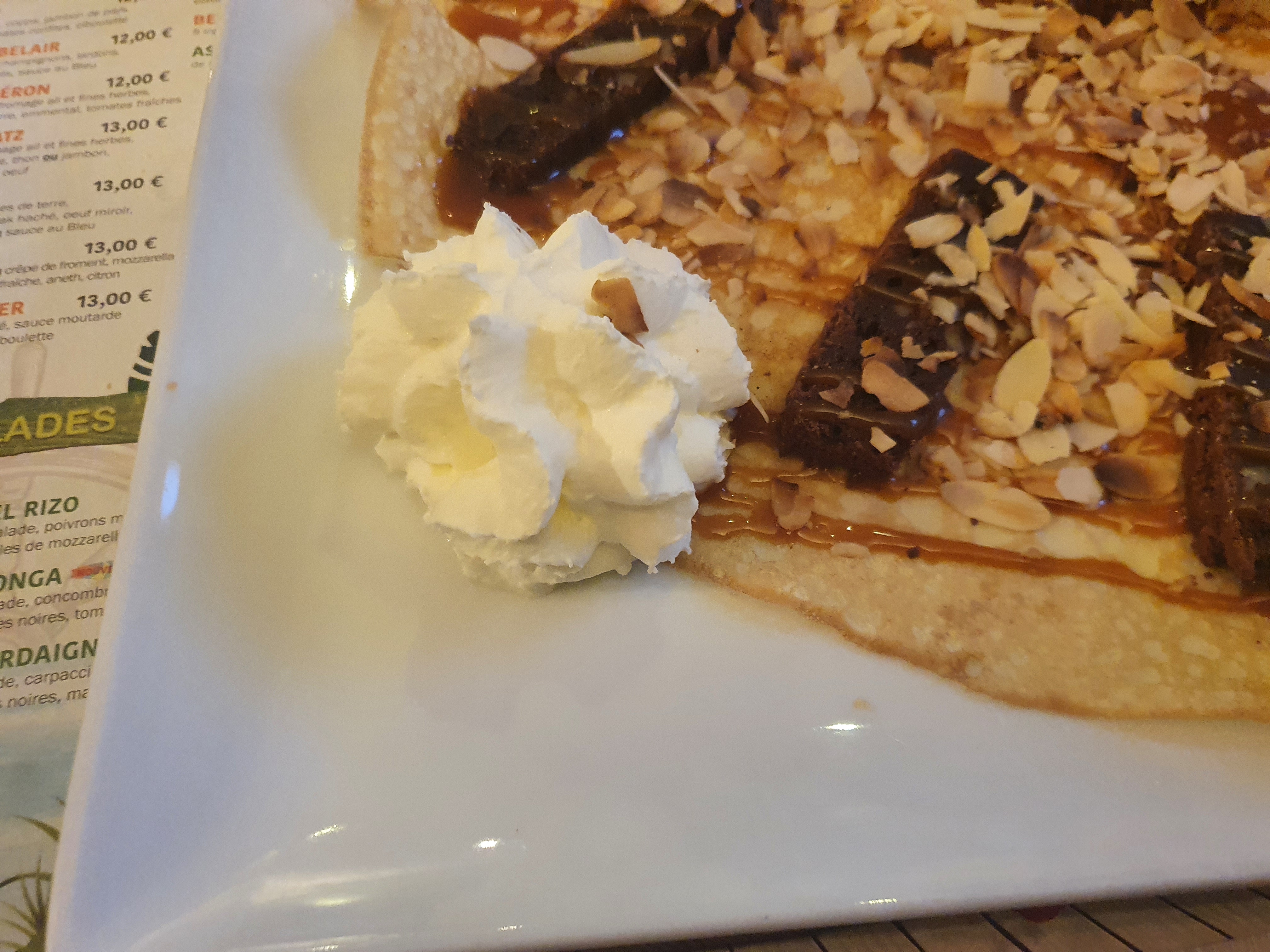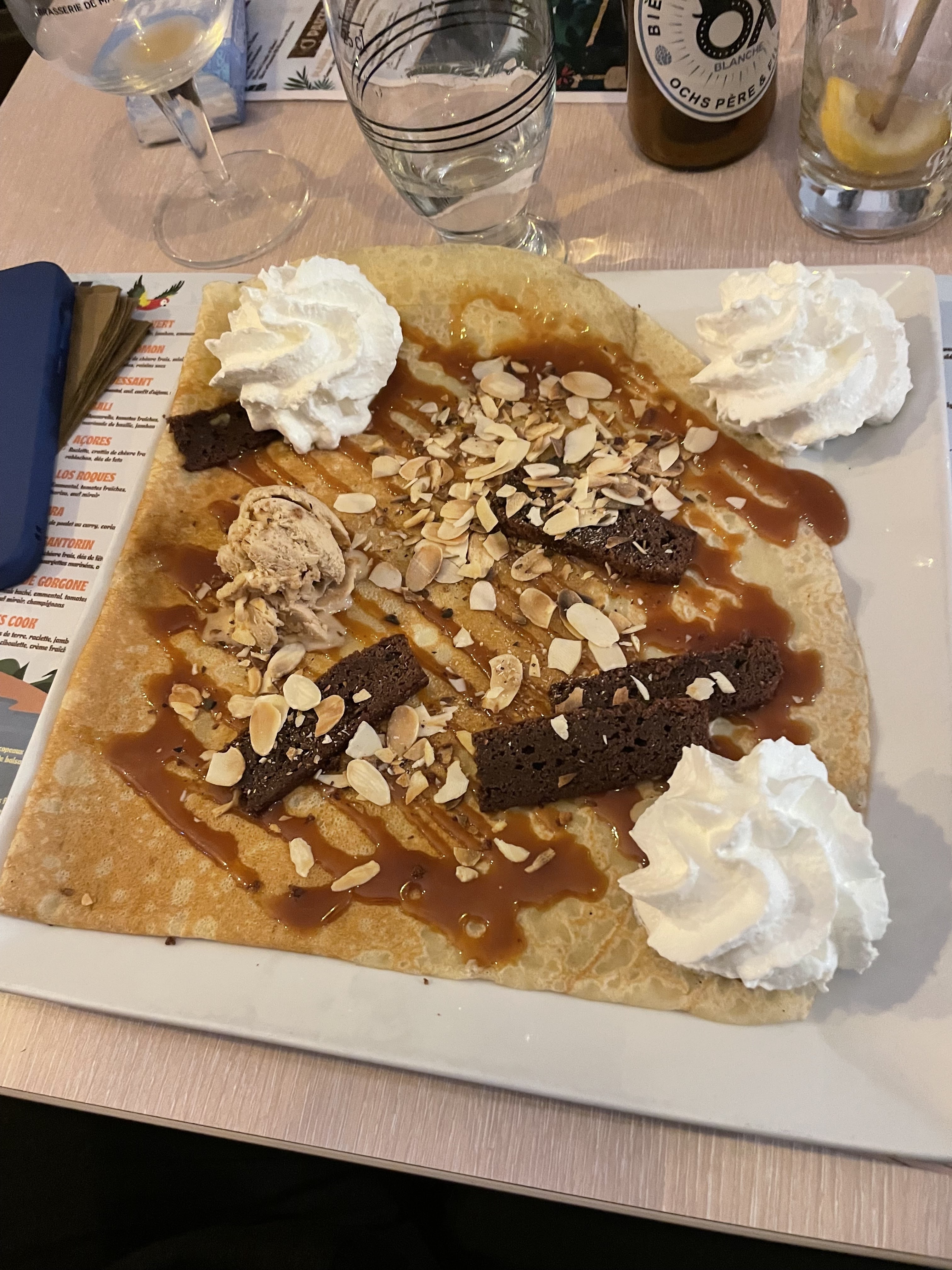 Une bonne crêperie avec un bon choix de crêpes, un menu a19€ avec une crêpe salée une crêpe sucrée, une boisson et un thé ou café. Je me suis régalé