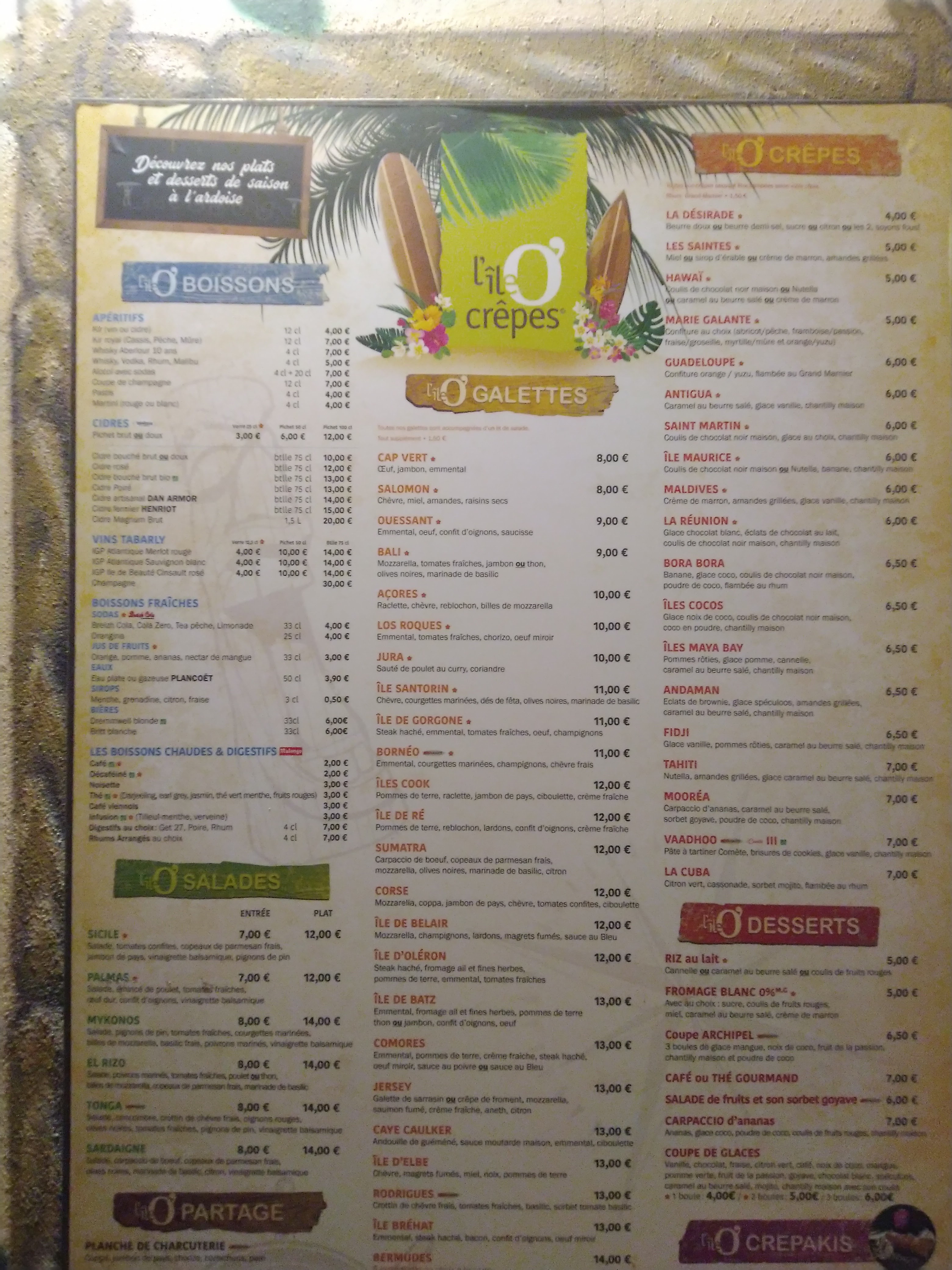 menu très original. très grande variété de galettes et de crêpes. dépaysement aux îles. un lieu convivial. un excellent repas. service sympathique. bon rapport qualité prix