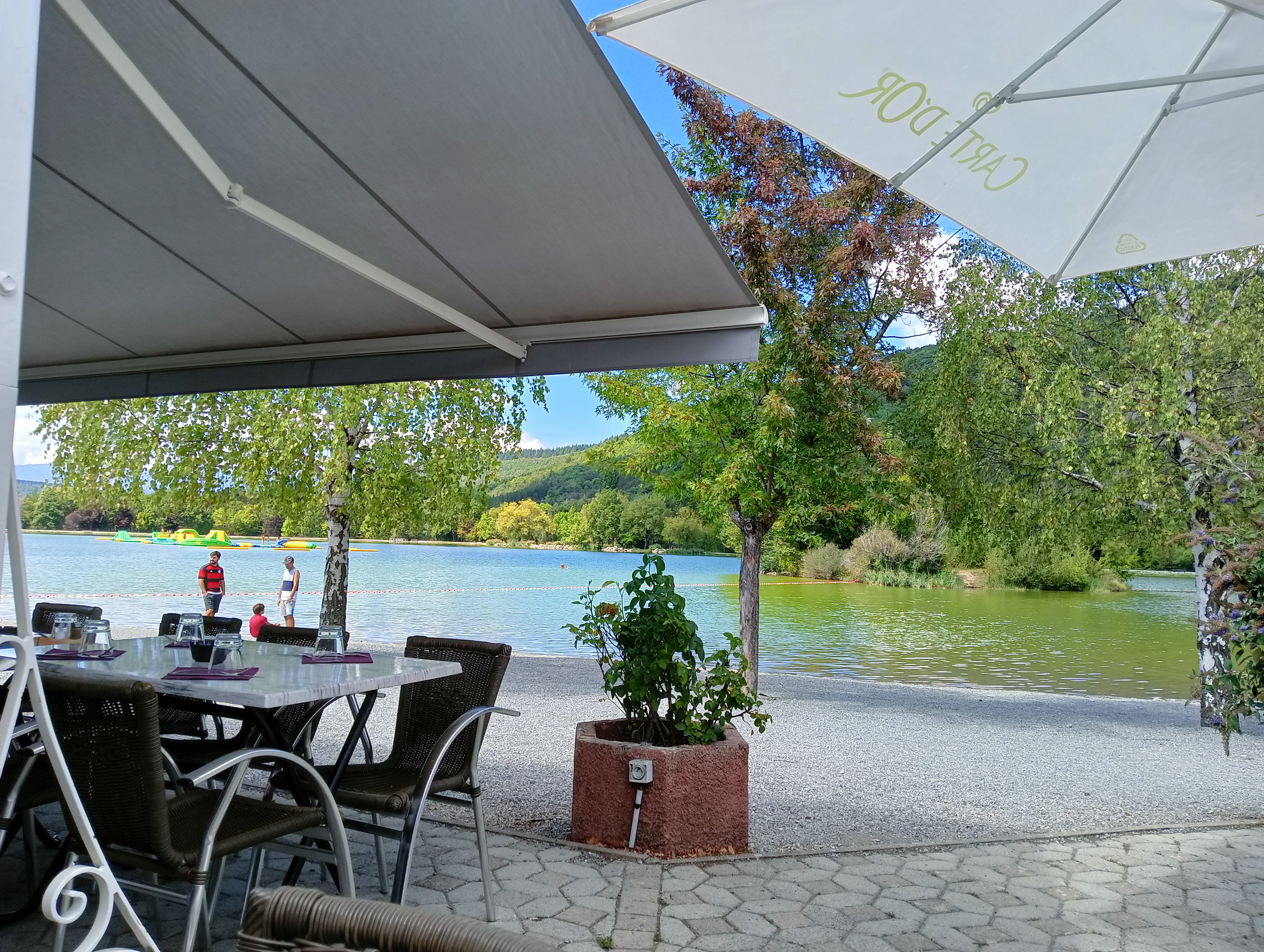 J'ai réservé une table le matin pour le soir et nous nous sommes retrouvé devant une baie vitrée en plein soleil avec une température de 36 degre Aucun ventilateur dans la salle. La serveuse est d'une incompétence totale Et le patron antipathique le seul bon poin. la vie sur le lac . C'est bien dommage qu'un si bel endroit soit si mal géré