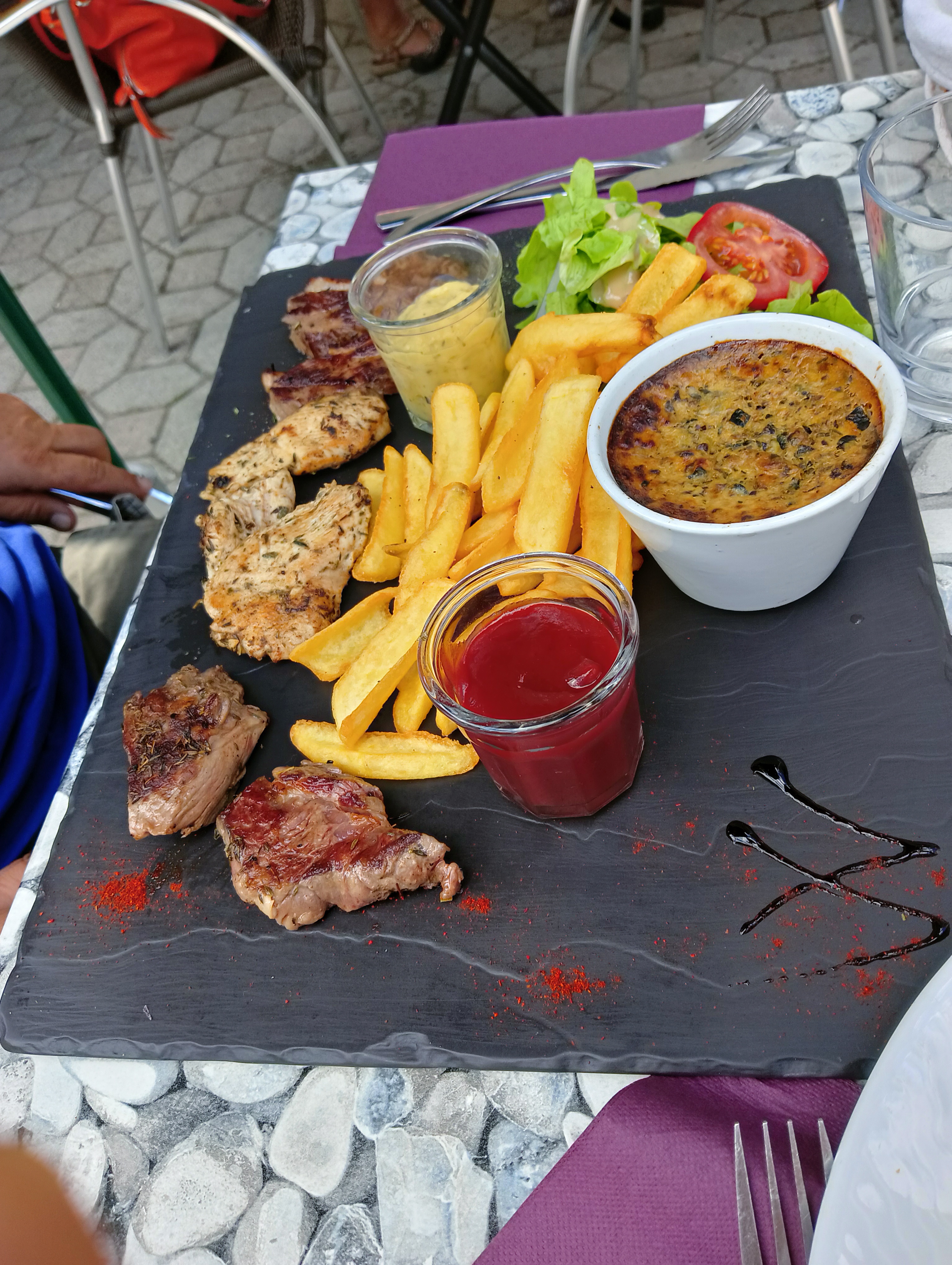 Super endroit service de qualité et qualité et quantité des plats au rdv 😉 une jolie vue cadre apaisant et accueil chaleureux