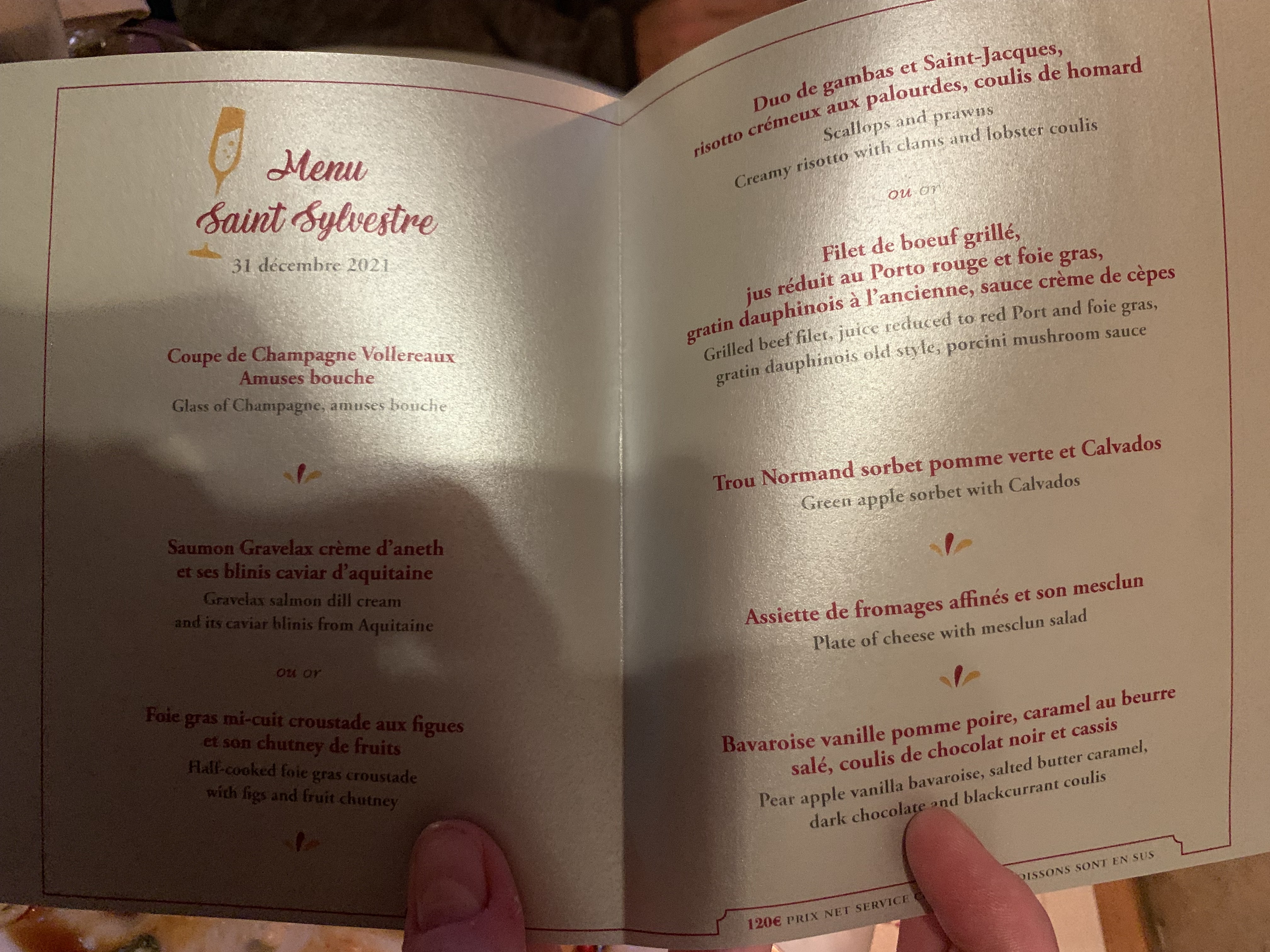 Notre série magique de repas incroyables à Paris devait prendre fin… Le repas de 3 plats pour le Nouvel An était horrible. Entrée froide, le steak principal était correct, le sorbet du désert recouvert d'une terrible liqueur…… tous les invités à notre table ont ressenti la même chose. Éviter!!
