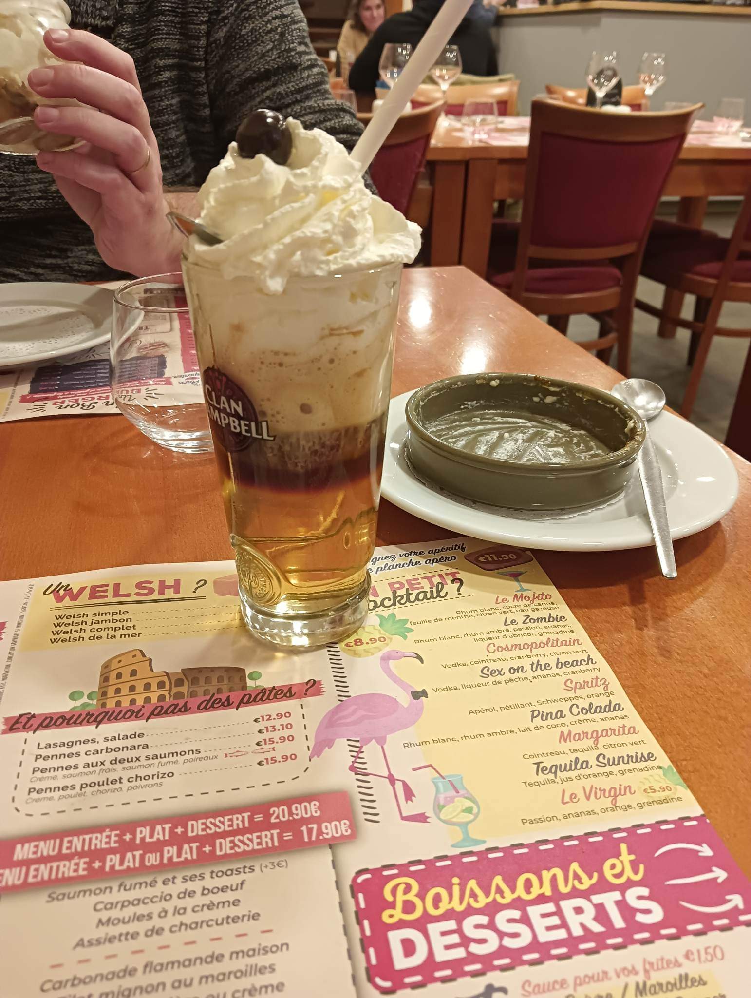 Welsh complet écœurant car trop de cheddar qui est de piètre qualité. Frites surgelées sans goût et luisantes. Moules à la crème non raffinées. Des moules avec un peu de crème fraîche dessus je suis capable de me le faire à la maison. Le rapport qualité / prix est à revoir !