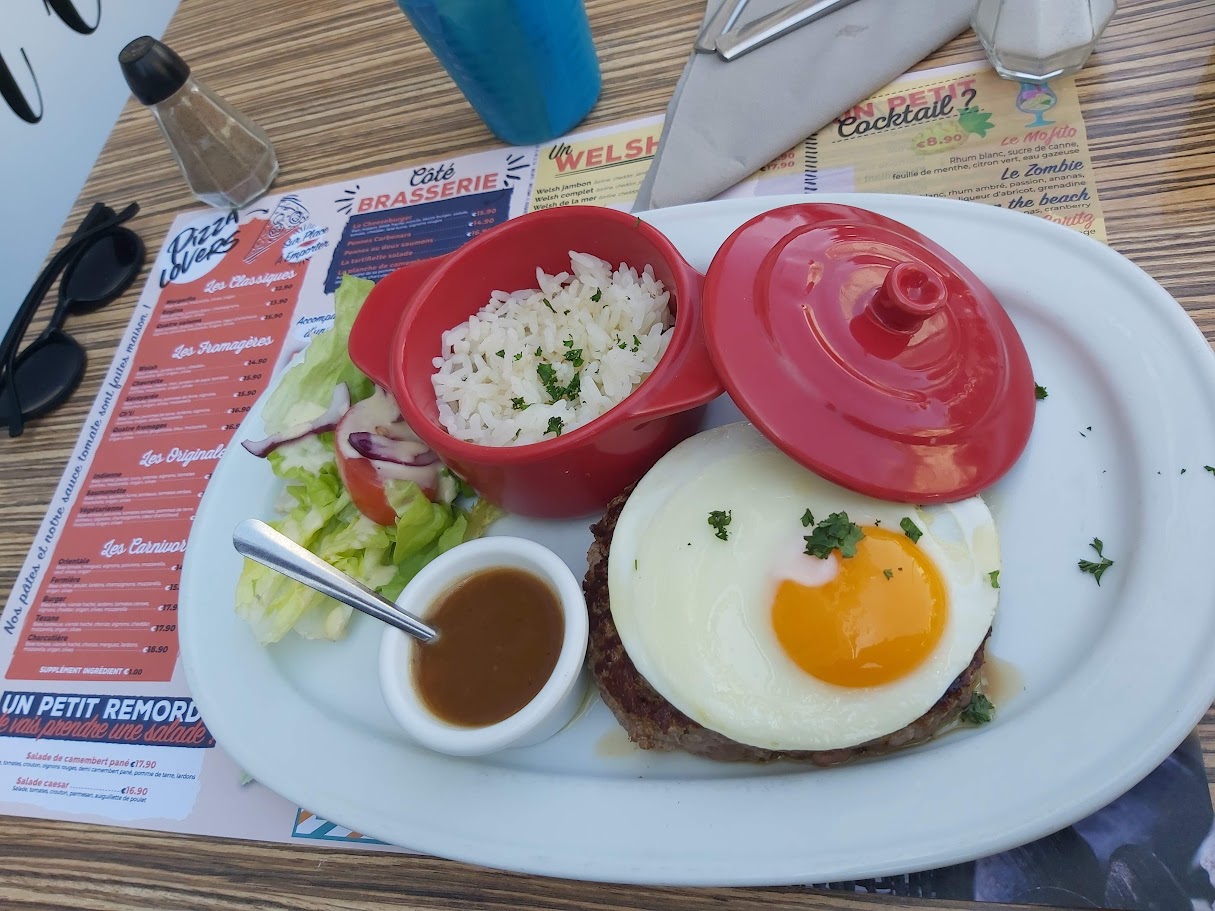 Restaurant très sympa ! Pizza, pâtes, Bugers, Moules et Welsh. Nous avons mangé en terrasse et c'était très bien avec nos 2 chiens ! Pizza, Welsh et Cheeseburger pour nous et tout était délicieux. Service rapide. Serveur et serveuses très sympathiques ! Seul bemol les chaises en terrasse sont un peu basses par rapport aux tables.