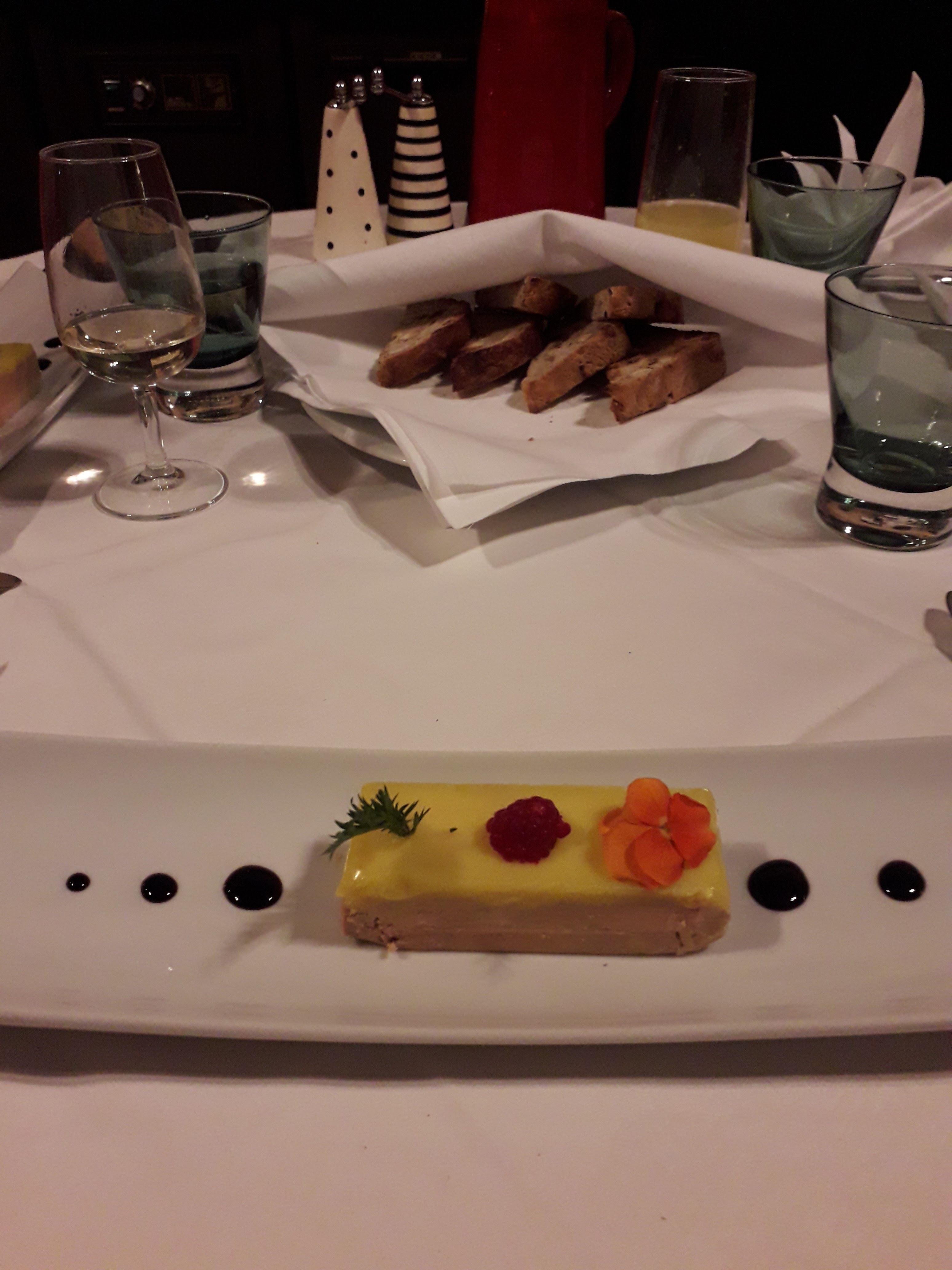 Afin de manger dans ce restaurant, il faut réserver ( même en milieu de semaine hors vacances). Accueil: plutôt bon, propose des plaids en soirée si nous avons froid. Ambiance: sympa dans les ruelles de Bergerac Repas: très copieux et joliment présenté. Menu de 42 euros pour des toasts avec de la terrine, un meli mélo de vérines, une entrée, un plat, un dessert +un verre de Bergerac à 4 euros. (voir photo) Durée : il semble n y avoir que 1 service donc les plats arrivent au fur et à mesure en laissant le temps au client. Nous sommes arrivées à 19h et partie à 22h30. Je recommande, bon rapport qualité prix si vous souhaitez vous faire plaisir pour un évènement ou si vous passez dans le coin.
