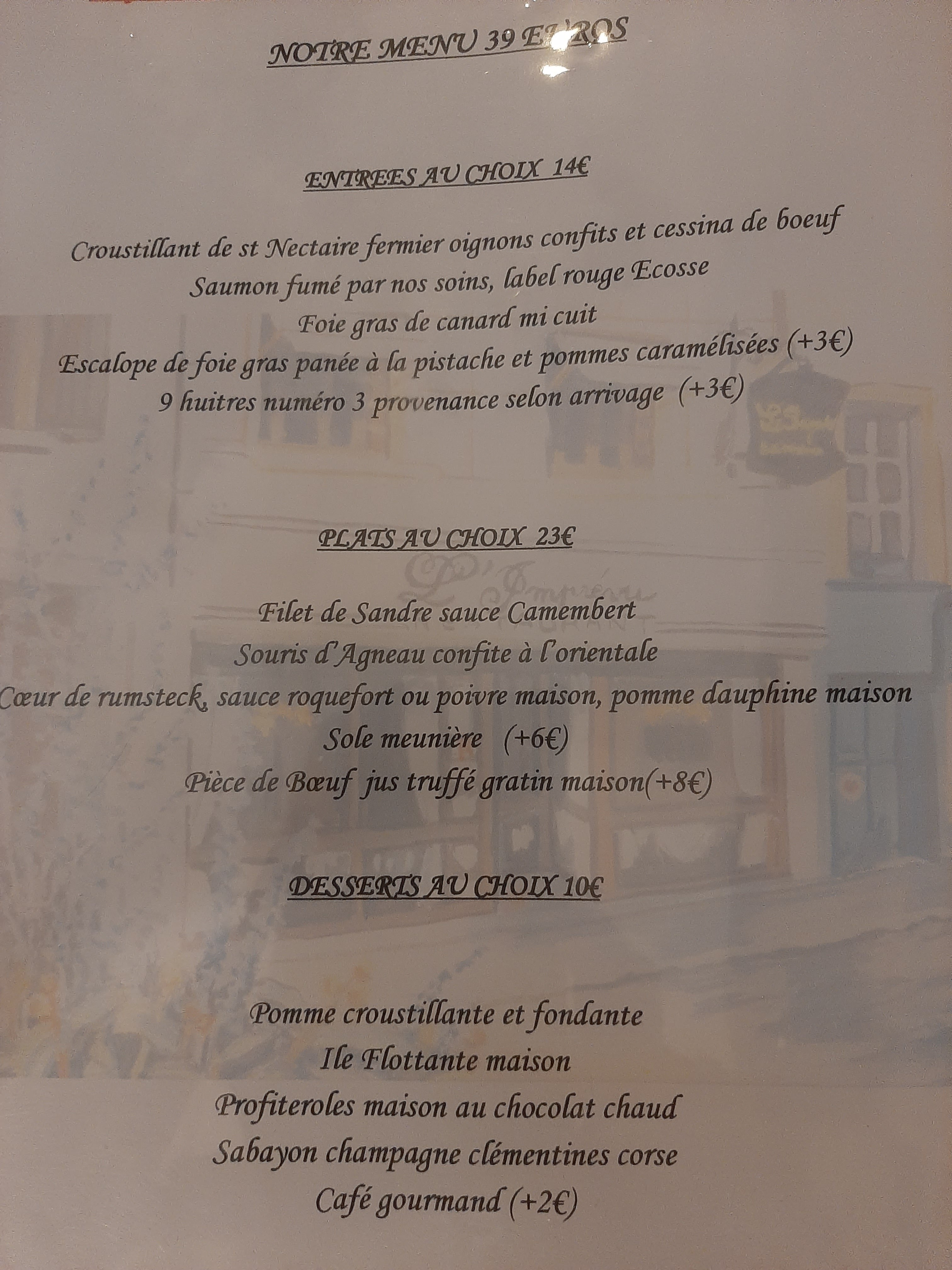 Boissons alcoolisées 10€ Menu 39€ Entrée 14€ Plats 23€ Dessert 10€ Il y a des prix entre parenthèses donc c'est en plus. Sinon nous étions les seuls, 2 personnes donc aux petits soins. Arrivée à 13h partis vers 14h45.