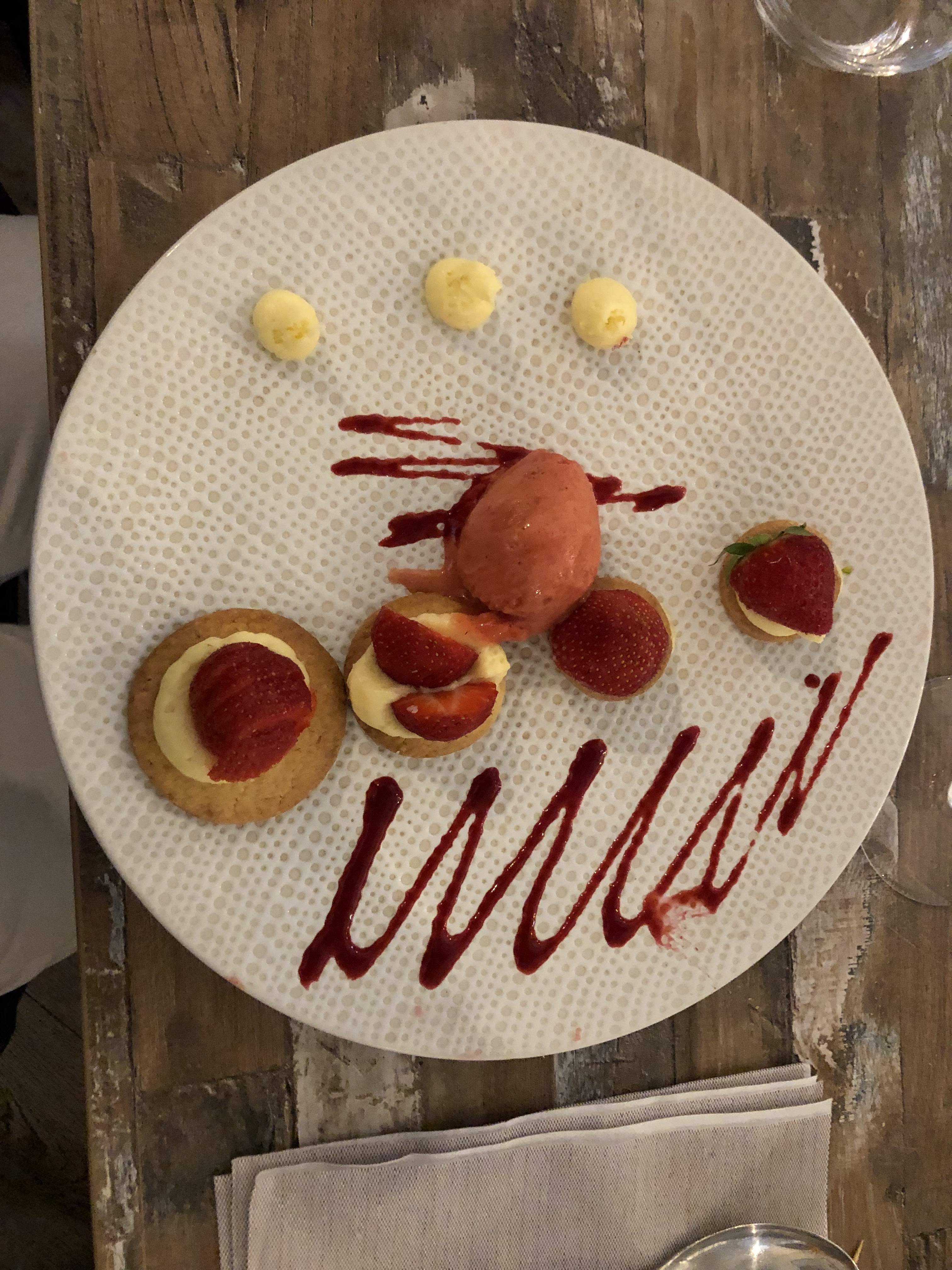 Nous sommes encore à l'intérieur, nous attendons notre dessert, mais je ne résiste pas avant même la fin du repas à donner mon avis sur cet EXCELLENTISSIME établissement. Ici, tout est à la foi SIMPLE et PARFAIT, le cadre, l'ambiance, la sympathie des propriétaires qui vous accueillent en famille, mais aussi et surtout, les plats qui se succèdent. Chacun amène son instant de BONHEUR, une explosion de SAVEURS et un PLAISIR intense. Voilà, le dessert est arrivé et, comme ses prédécesseurs, il enchante totalement mes papilles. Merci pour ce moment de FÉLICITÉ !!!