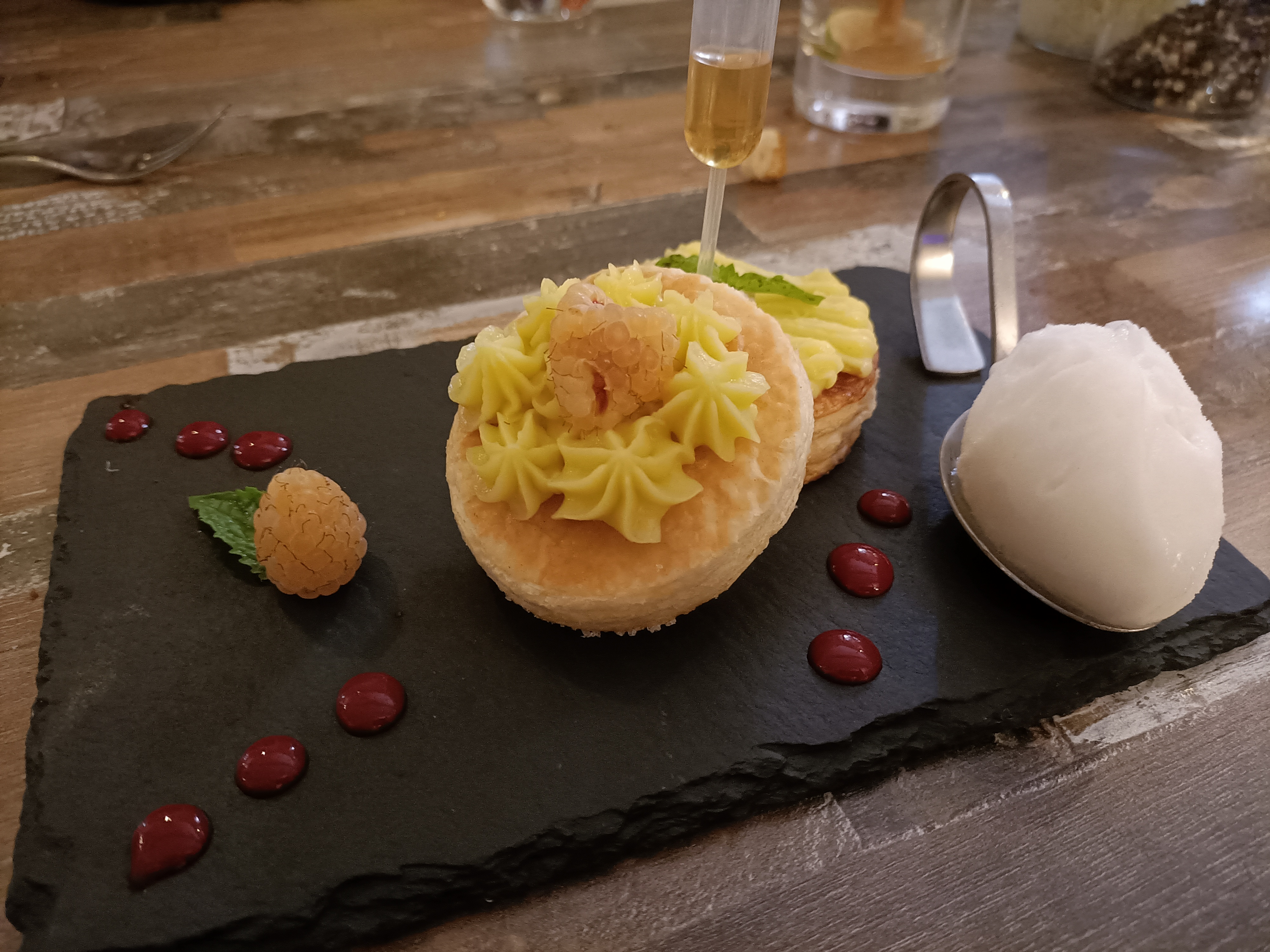 Très beau, assiettes bien assemblé malgré quelques ratés. Champignons sauce foie gras et œuf parfait. La sauce trop timide et coquille dans l'assiette. Pas méchant mais attention. Aussi dans le plat canette avec courgette. Un morceau qui semblait venir du filet des courgettes. Et assiette froide. C'est tout de même très bon mais un peu trop chère pour ce que ça propose.