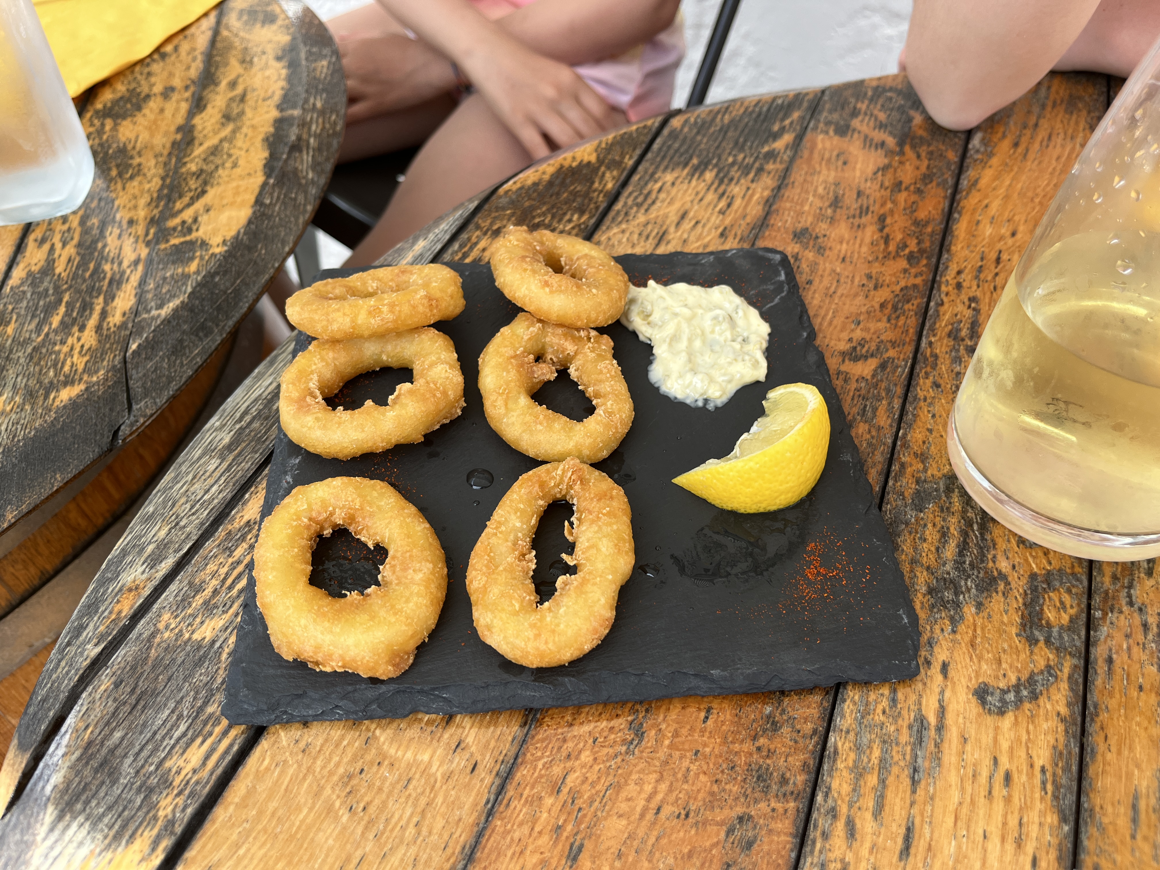 Nourriture délicieuse, nous avons commandé des Seiches (bébés seiches) et une salade César, les deux étaient joliment servies et délicieuses, nous n'avons rien trouvé à redire du tout. Service amical et bon vin pour accompagner notre déjeuner. Ça vaut vraiment le détour.