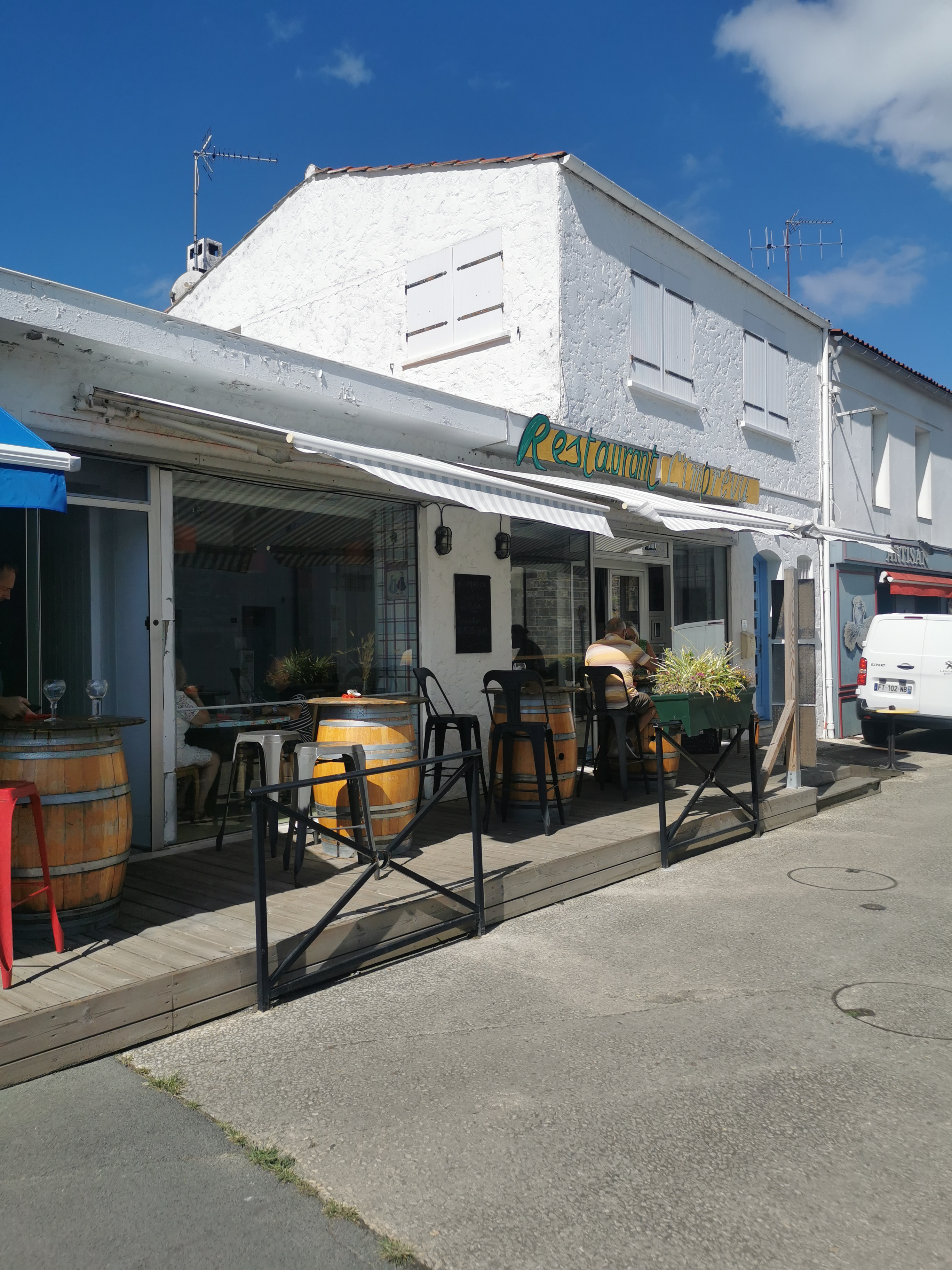 Imprévu, c'est le nom du resto, mais c'est aussi ce qu'il se passe quand on pousse les portes. De l'extérieur, l'endroit ne paye pas de mine, mais une fois à table... Nous avons pris des huîtres, le chef nous a dit qu'elles étaient spéciale et c'est vrai, elles étaient délicieuses, à tel point que nous sommes passées chez l'ostréiculteur pour en manger encore le soir. Nous avons pris en plat, le duo de St Jacques sur un lit d'endives et de gambas, pareil, c'était succulent. Et en dessert, qui ne dénotait pas du reste du menu, j'ai pris un nougat glacé et mon amie un fondant au chocolat avec une crème anglaise, mais c'est moi qui aïs mangé la crème anglaise, et pareil, elle était délicieuse. Et alors que dire de l'accueil et du service !! La patronne est toujours souriante même si elle court dans tous les coins de la salle et de la cuisine. Quant au chef, il a pris le temps de venir discuter avec nous et j'ai trouvé ça trop cool.... Vous voulez bien manger à St Trojean ?? Vous pouvez y aller les yeux fermés. Je peux vous dire que si je retourne sur l'île, je retournerai manger à l'Imprévu😍😍