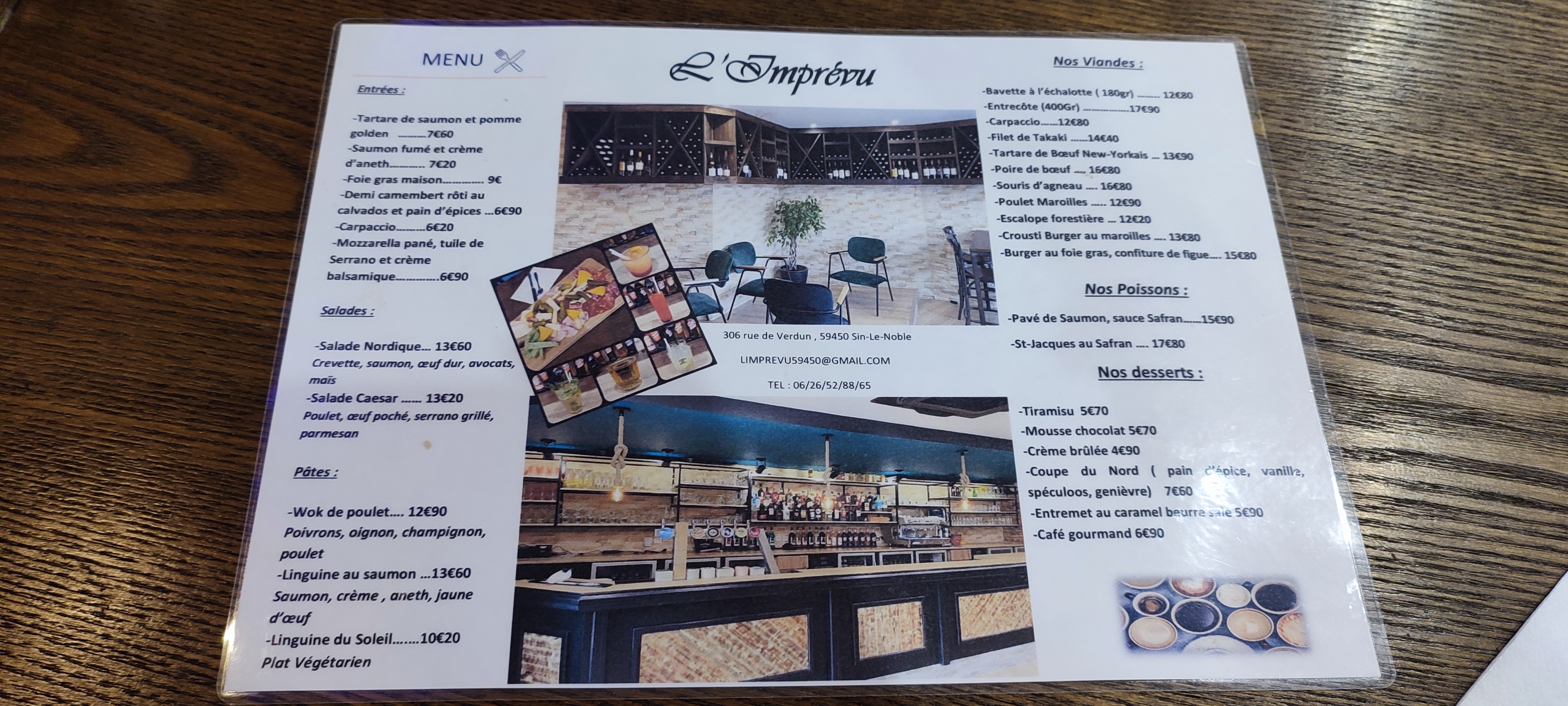 Nous cherchions un restaurant à la dernière minute et nous sommes arrivés à l’imprévu ( il porte bien son nom) . Nous avons été très bien accueillis et le repas était excellent ! Le gratin de poulet aux maroilles et le burger au maroilles nous ont régalé… merci !