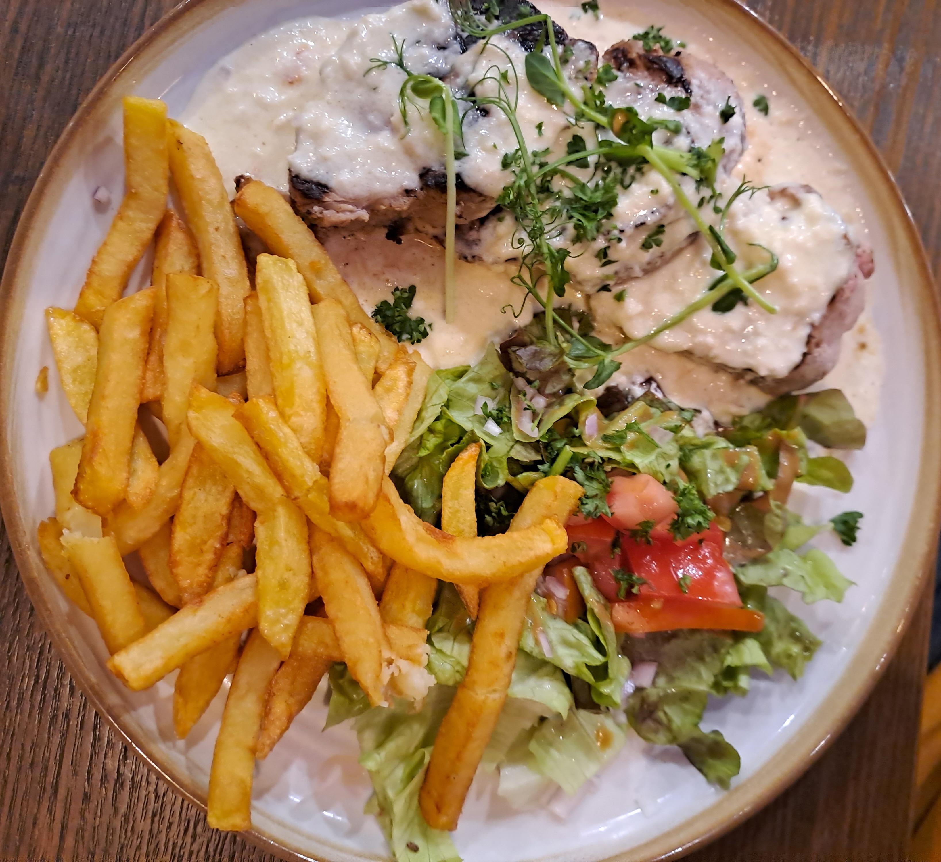 On mange des frites maison, le cadre est sympathique, accès handicapés et on y mange très bien.