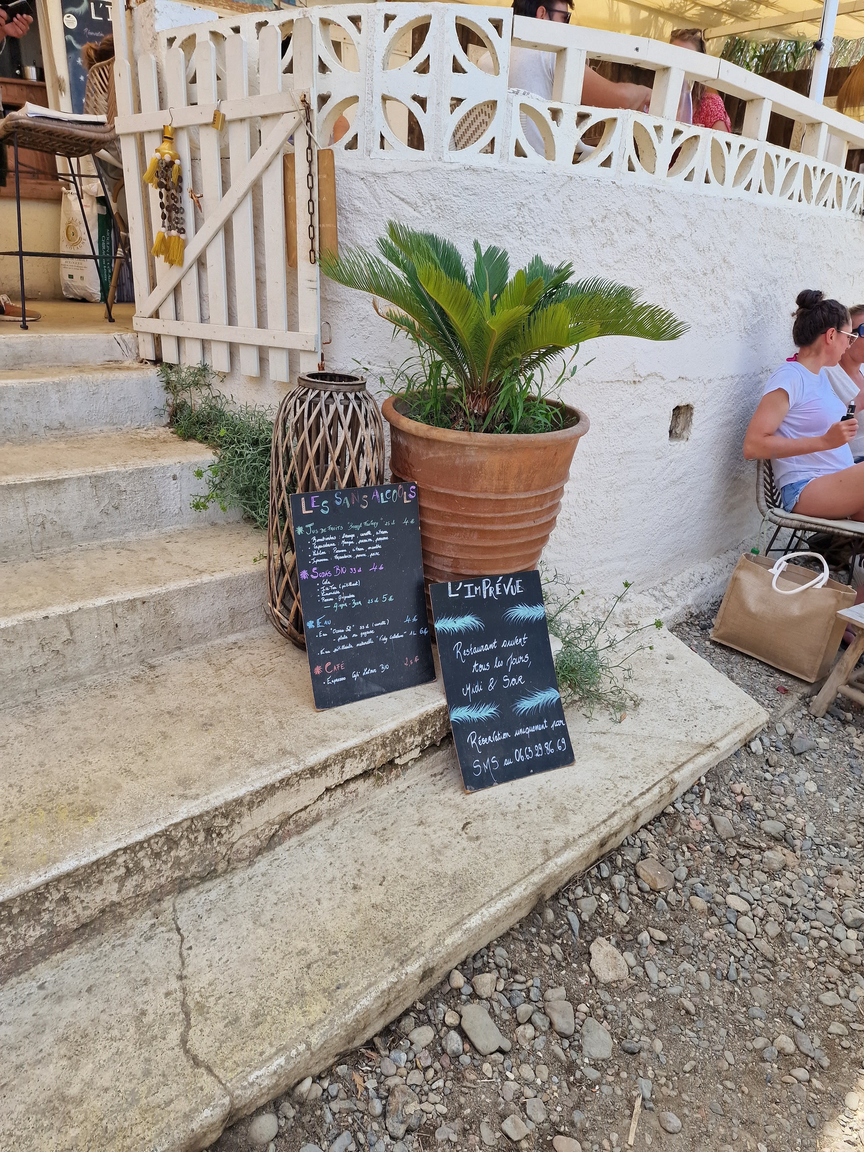 Petite balade par le sentier de la corniche.parti en fin de matinée nous nous sommes dit, sans savoir, qu'il y aurait quelques choses vers la plage de l'ouille. Et là, surprise, un restaurant - L'IMPRÉVU - à même la plage . . . Nous demandons (avec deux petits chiens) si il est possible de manger : sourire et OUI, BIEN SÛR ! On nous installe très gentiment. Une attente un peu longue (nous sommes arrivés en plein service !) et la carte arrive : juste une feuille A4 avec les prix même pas alignés ! Où sommes-nous ? Les plats viennent enfin. Et là, comment dire, tout s'efface : C'est délicat, délicieux, ce n'est pas de la brasserie, c'est du gastronomique ! La serveuse C...... (J'ai promis de ne pas donner son prénom !) est très attentive et a un grand sourire. Le responsable va même jusqu'à porter une coupelle d'eau au chien. Et le dessert . . . Une tuerie ! Mais que c'est bon ! ! ! C'était imprévu, ce fut L'IMPRÉVU. Merci, merci et continuez comme ça . . .