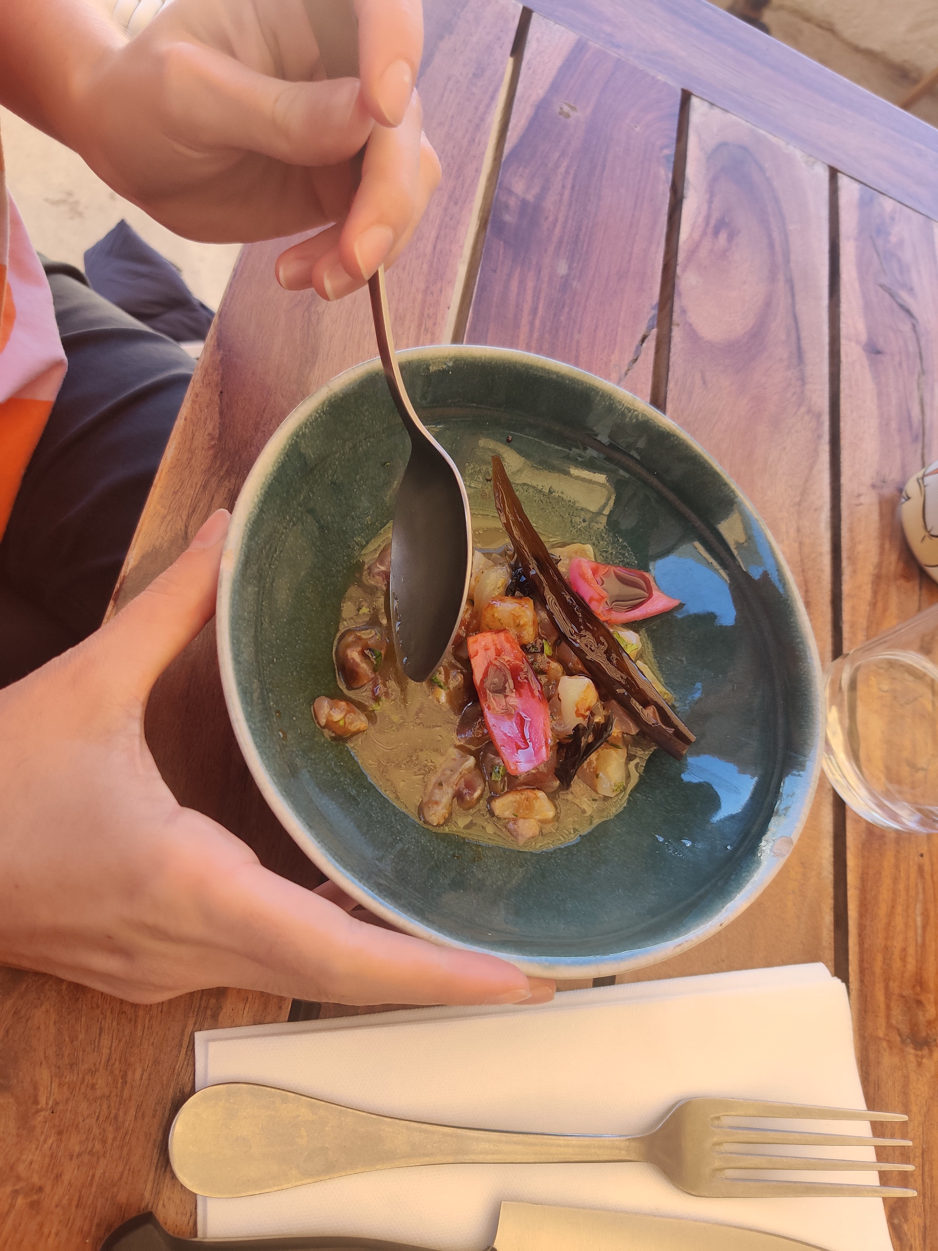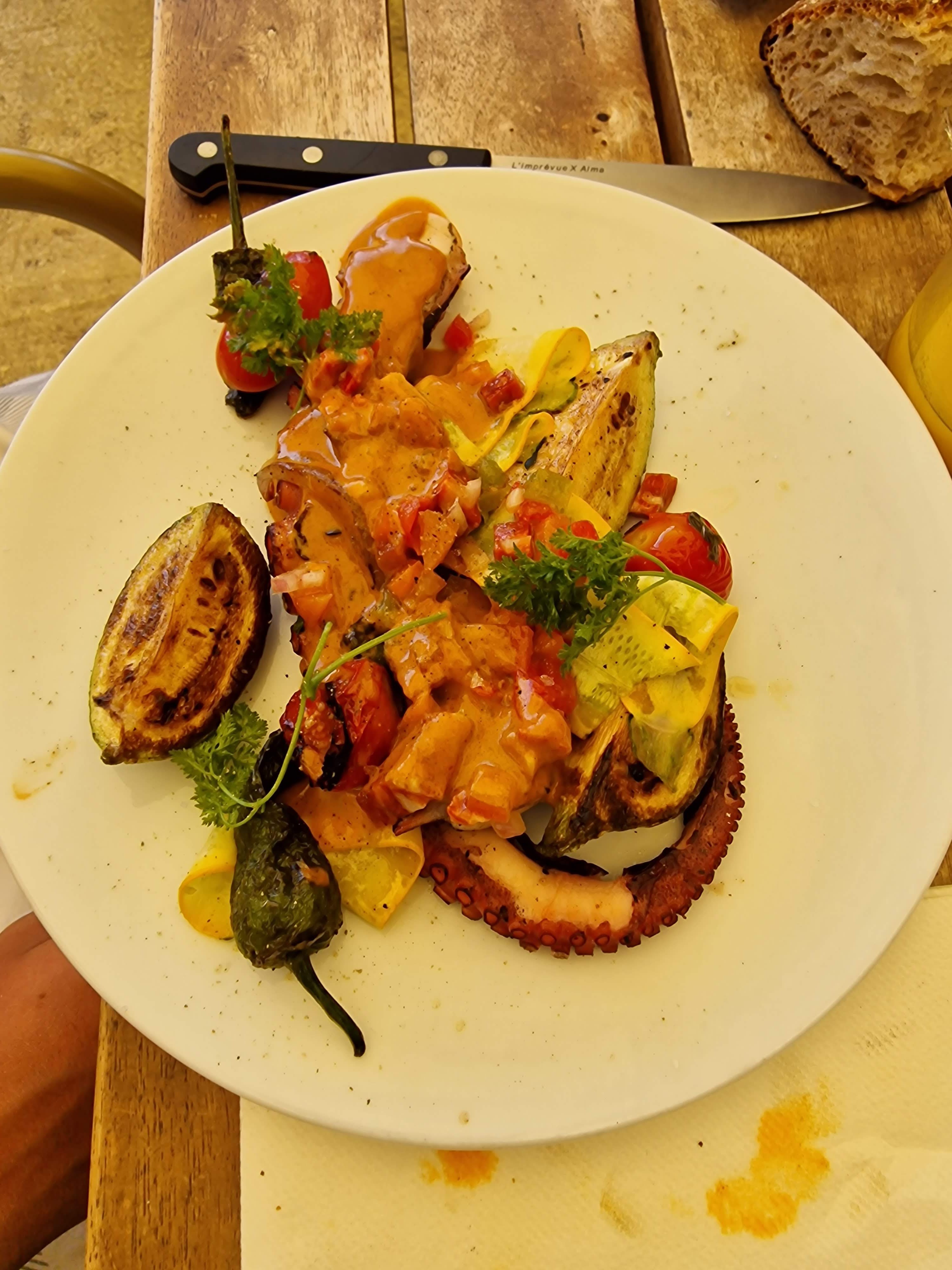 Chanmé ! La pluma iberica est cuite à la perfection, les légumes en accompagnement sont frais et savoureux, incroyable ! Le service est très agréable, et le spot aux petits oignons avec une vue imprenable sur la plage de l’Ouille. Allez-y les yeux fermés