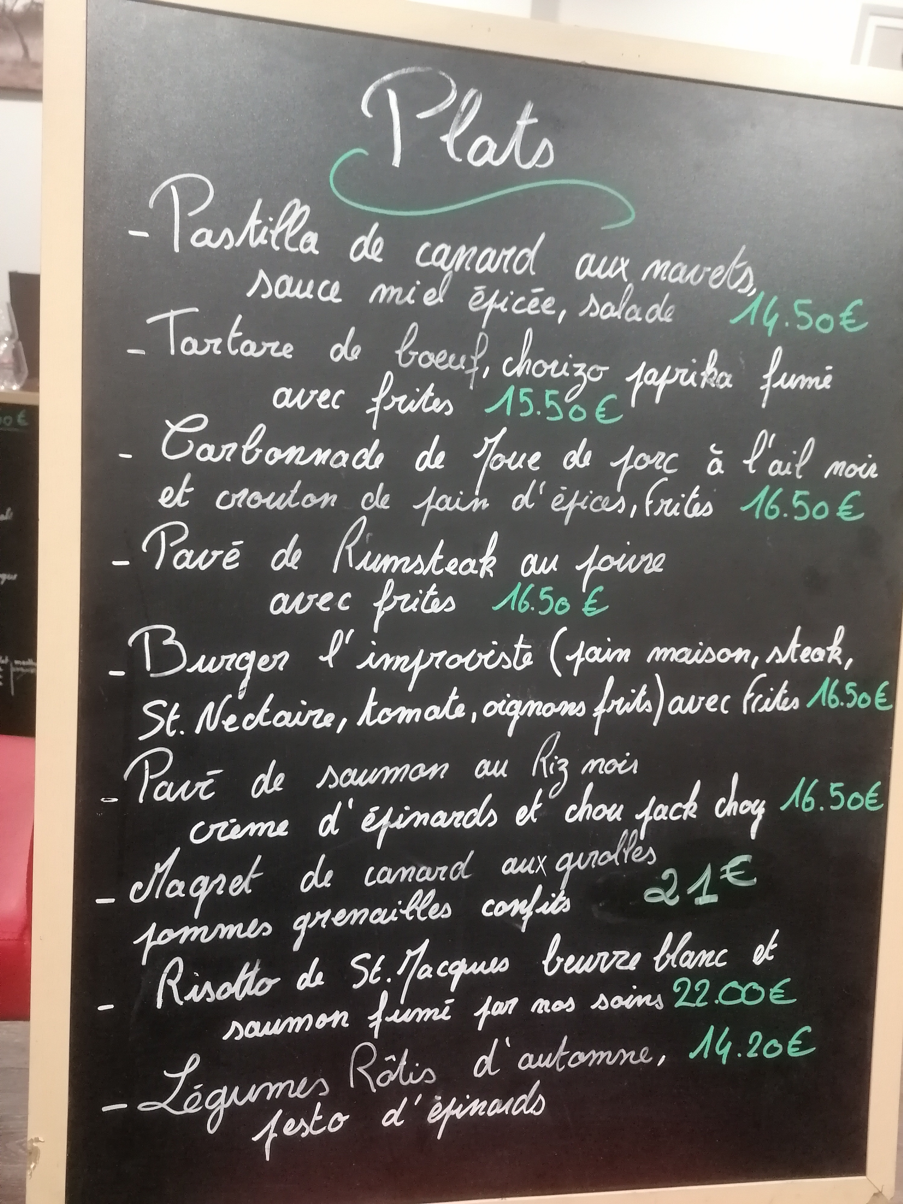Les plats du jour savoureux et copieux. Les desserts sont excellents. La carte changé tous les 2 mois. Je conseille vivement!!
