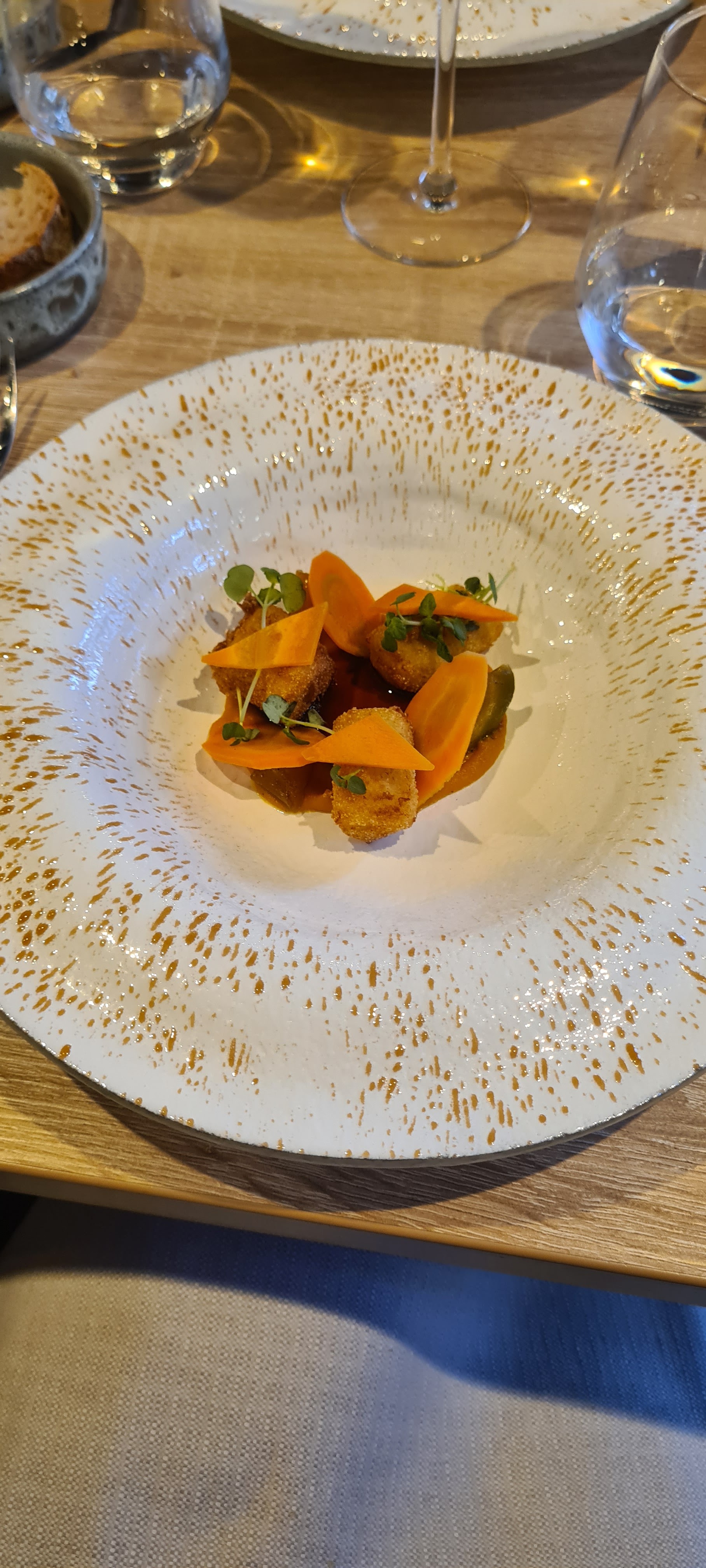 Mais quelle découverte ! Repas sur place Tout est impeccable : ambiance, décor, le personnel au petit soin avec un chef qui nous concocte un menu végétarien au pied levé, assiettes impeccables, vin au top. Virginie et Aurélien nous ont accueilli comme des Rois. Nous nous sommes régalés de l’entrée au dessert. Aucune fausse note. Merci pour cette soirée