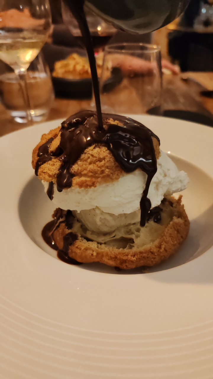J'ai vraiment apprécié les plats cuisinés par le chef, tous les produits sont de bonne qualité, je me suis régalé avec le dessert, profiterole avec un chou fait maison excellent.