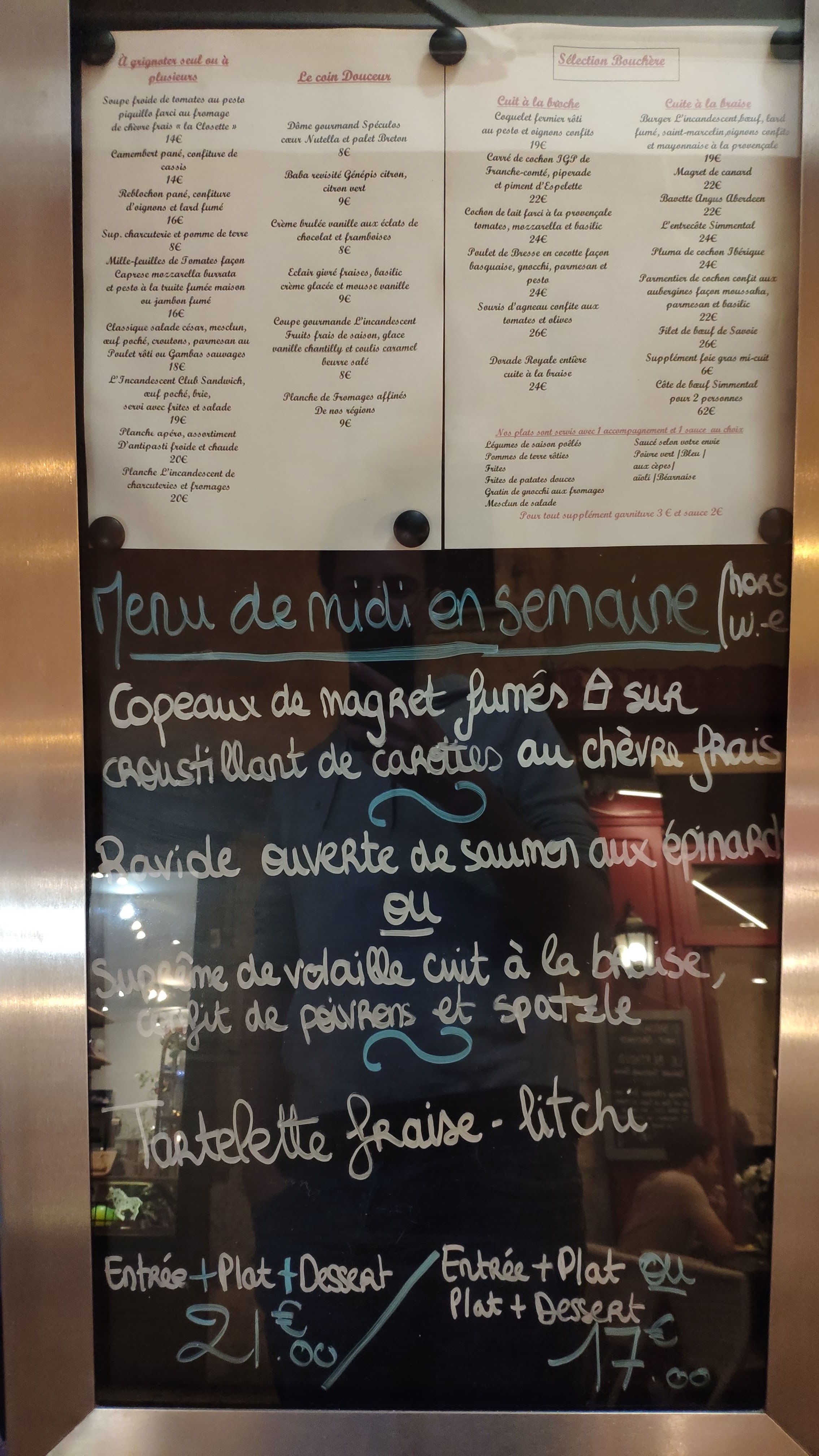 Un incontournable ! Nous avons réservé une table pour 4 un samedi soir, cette fois-ci nous avons pu manger dans le très agréable petit patio à l'arrière. Comme la fois précédente la prestation etait excellente, l'accueil agréable, le service rapide et efficace. On sent le professionnalisme et c'est très plaisant ! Mais surtout, la cuisine ! Mes amis se sont laissés tenter par l'épaule d'agneau marinée 7h, servie avec de la courge, un régal absolu. Pour ma part j'ai choisi les travers de porc qui ne vous laisseront pas moins indifférents ! La viande est de qualitée, les accompagnements sont aussi à la hauteur ainsi que les sauces proposées avec. (Exeption pour la Béarnaise, avis de Béarnais, elle est à revoir...) En bref, de la bonne cuisine française dans un cadre sympathique, de qualité en quantité et du professionnalisme. L'incandescent sera vous surprendre par sont amour brûlant pour la gastronomie. Un incontournable d'Annecy.