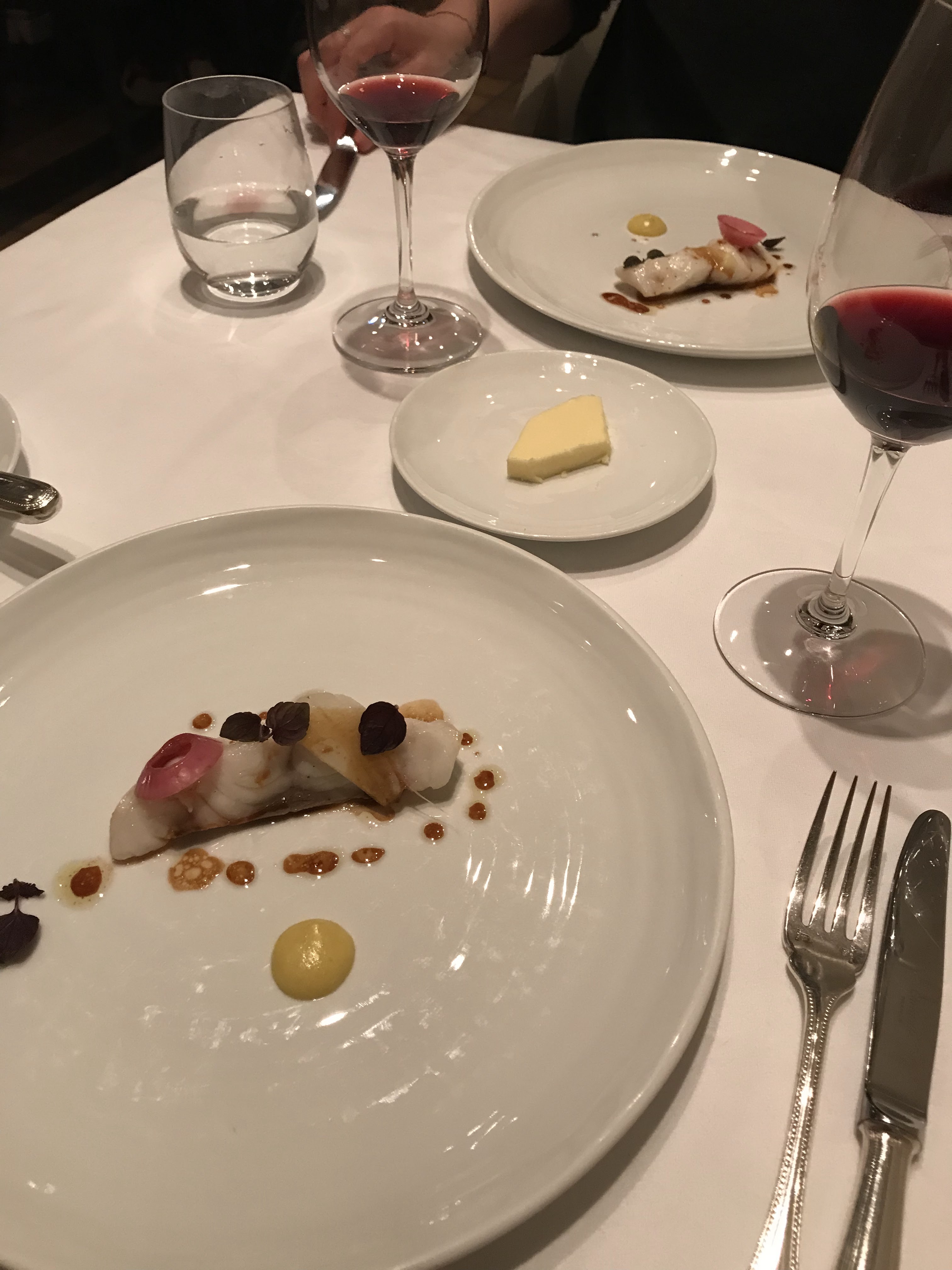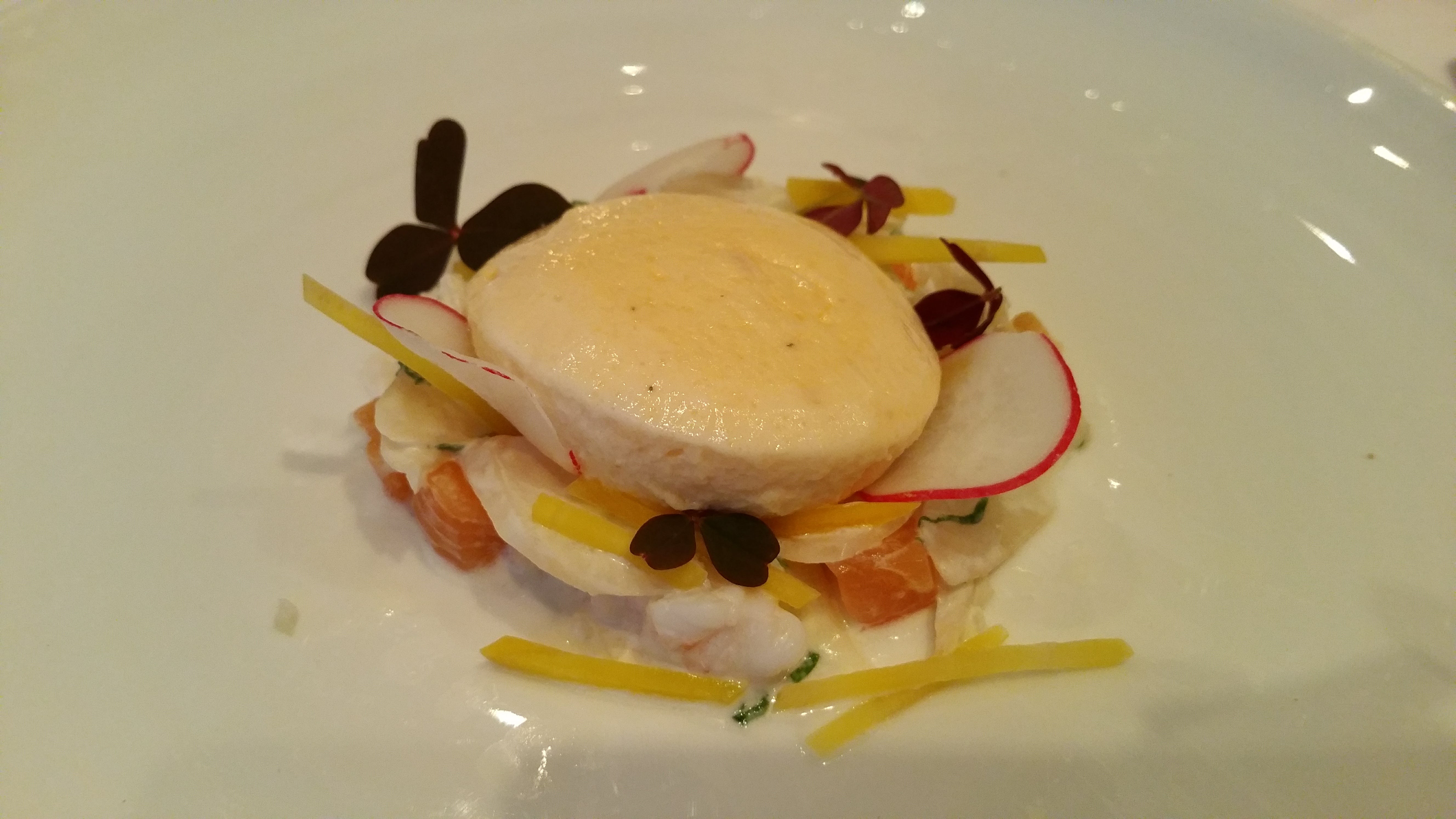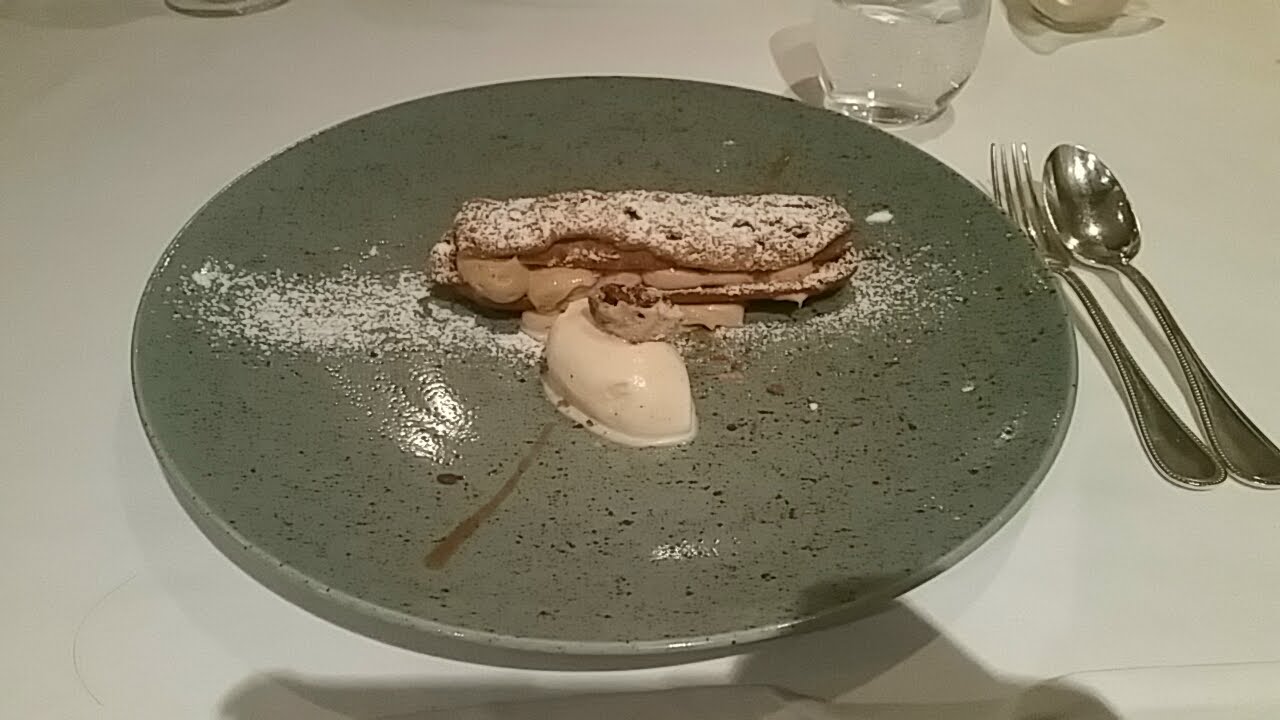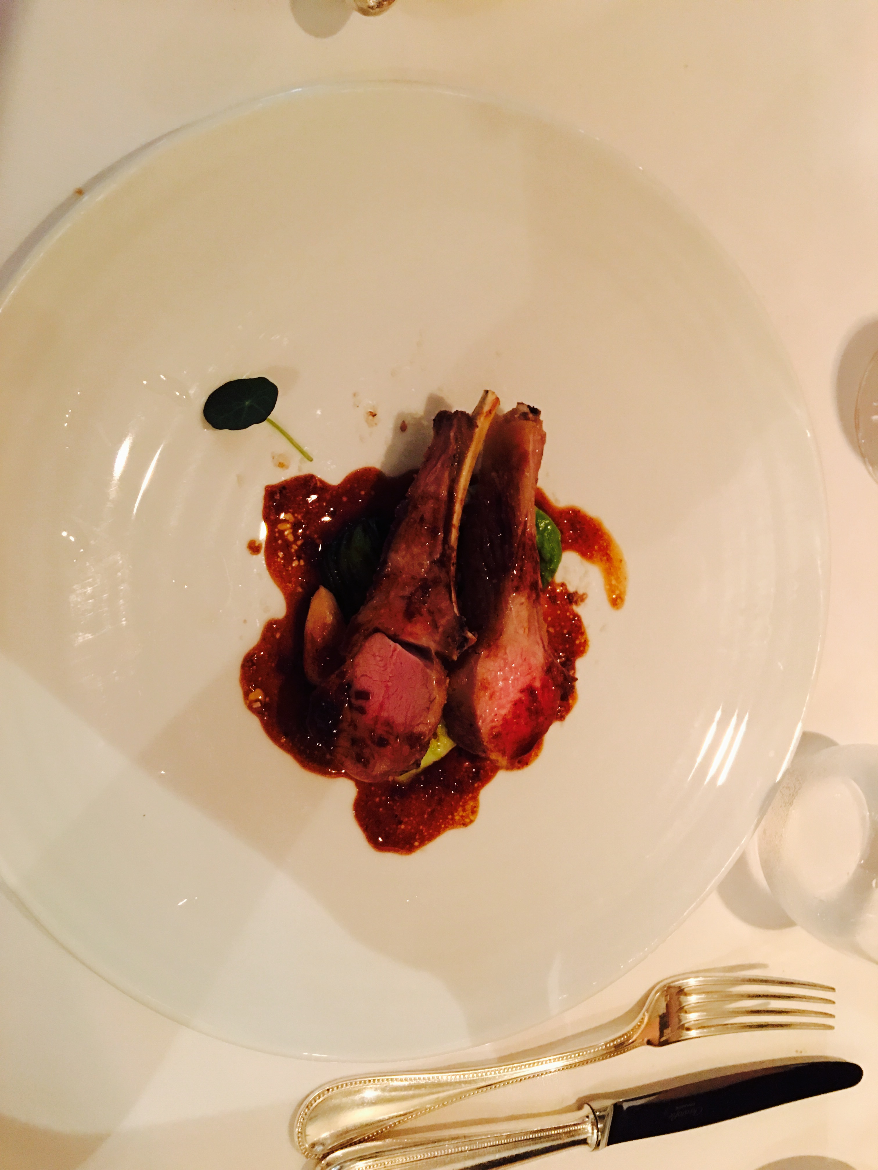 Relativement novice en restaurants gastronomiques, mais poussé par l’occasion, nous y dînâmes à deux. Cadre simple, sobriété qualitative et voulue. Le repas en six étapes est une réussite, avec notamment un excellent vol-au-vent au cerf et une très bonne huître chaude servie avec des câpres. Nous ne prîmes pas l’accord mets-vins, en revanche goutâmes au verre le blanc, le rouge et le champagne, qui tinrent leurs promesses. Nous reviendrons!