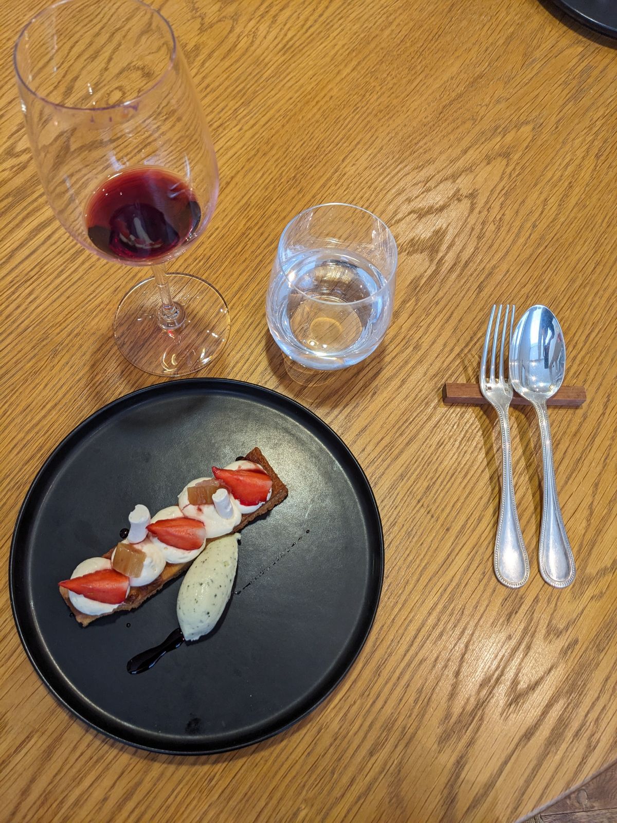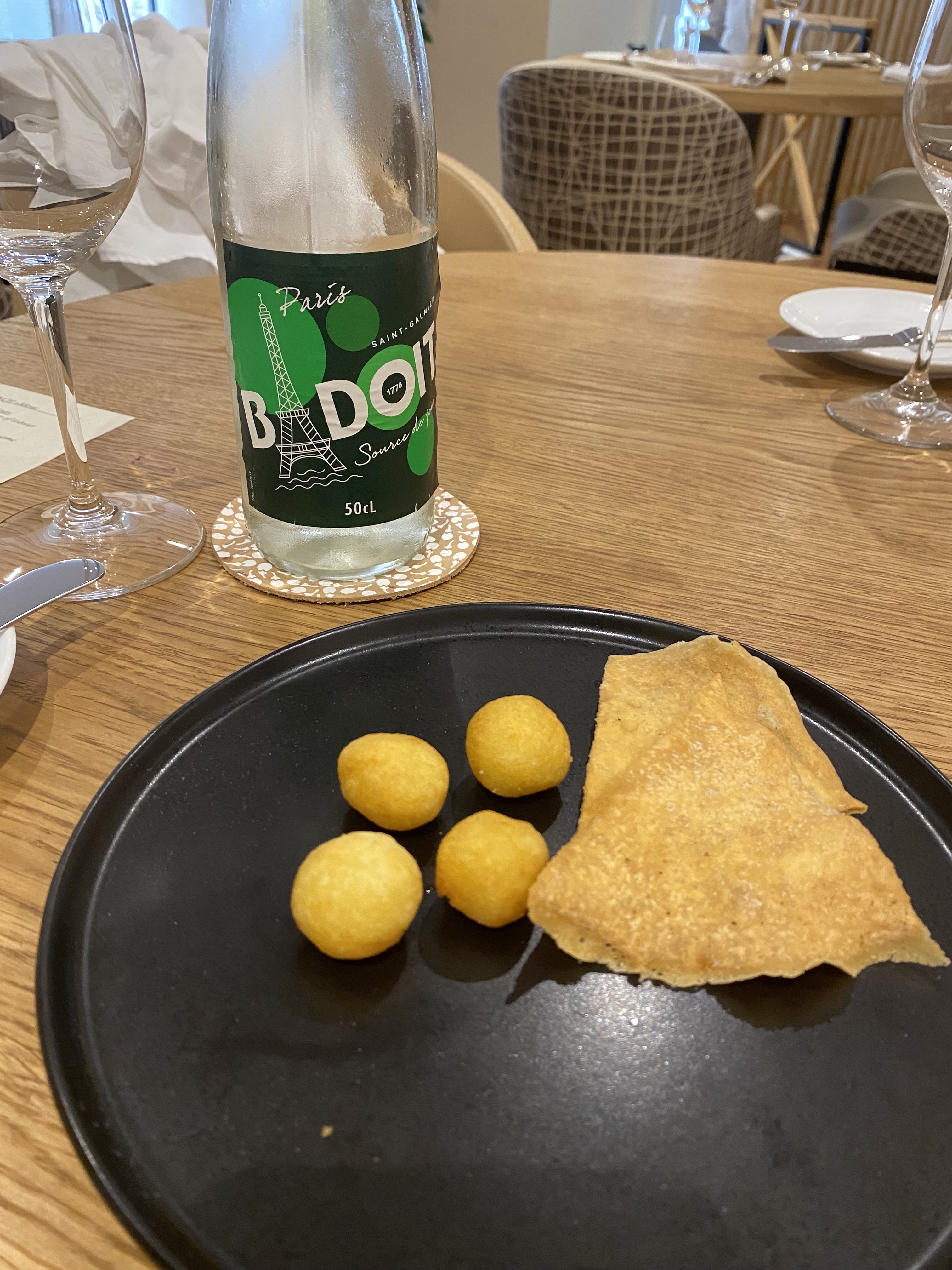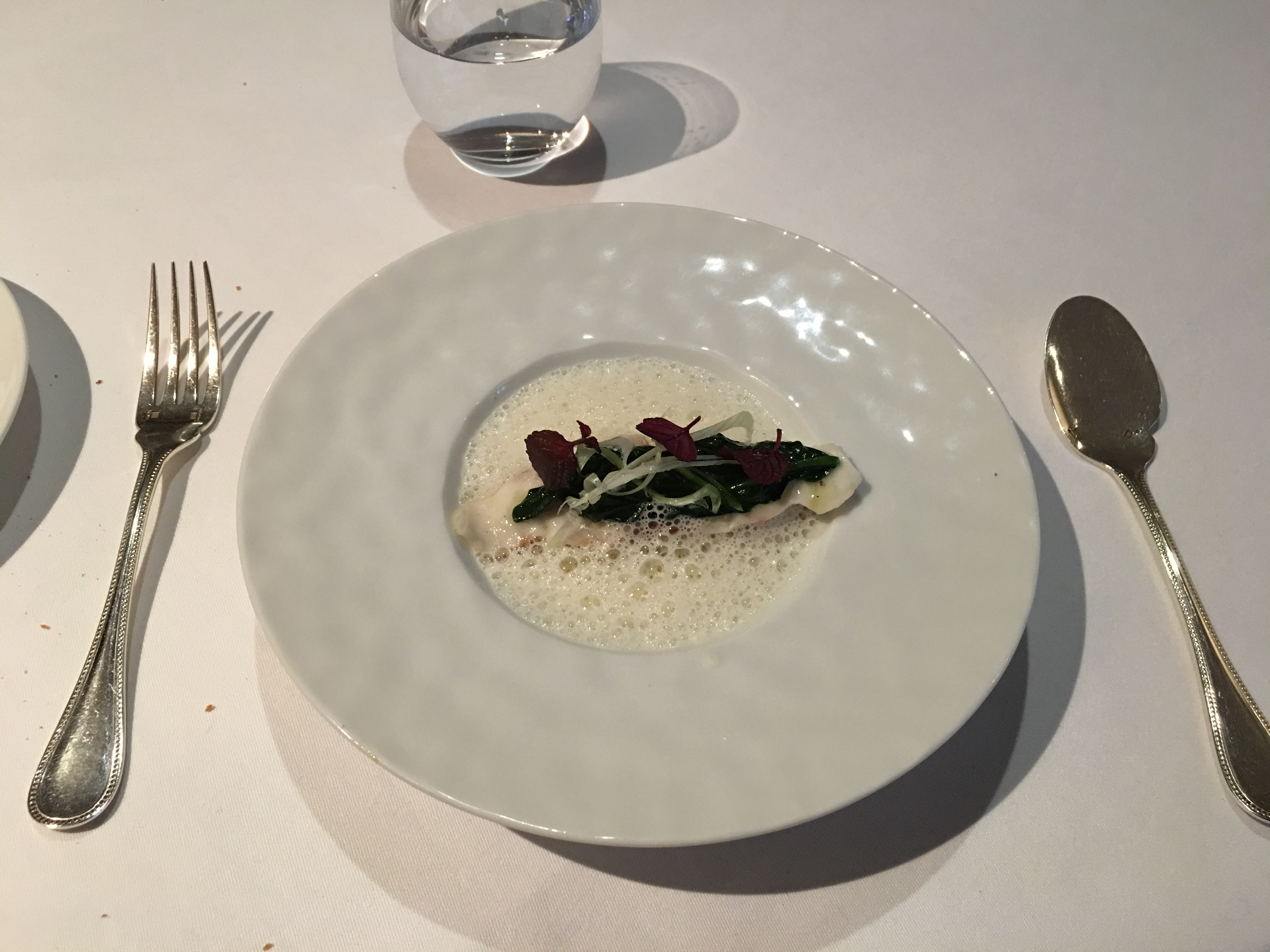 Relativement novice en restaurants gastronomiques, mais poussé par l’occasion, nous y dînâmes à deux. Cadre simple, sobriété qualitative et voulue. Le repas en six étapes est une réussite, avec notamment un excellent vol-au-vent au cerf et une très bonne huître chaude servie avec des câpres. Nous ne prîmes pas l’accord mets-vins, en revanche goutâmes au verre le blanc, le rouge et le champagne, qui tinrent leurs promesses. Nous reviendrons!