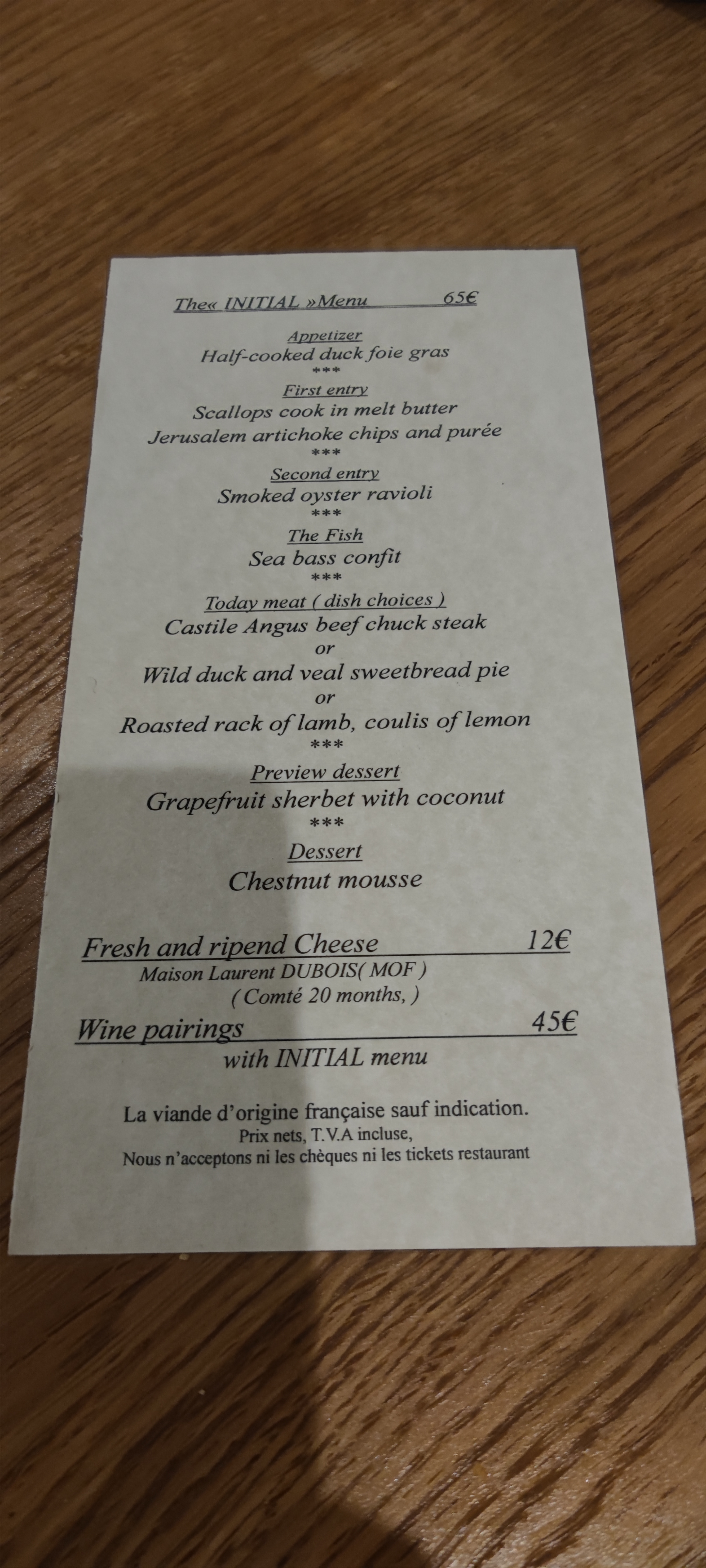 Durant notre séjour de deux semaines à Paris, nous avons dîné ici deux fois. C’est le seul restaurant que nous avons revisité lors d’une visite singulière à Paris. C'est une cuisine raffinée à son meilleur, sans prétention et zen dans ses plats comme dans sa décoration minimaliste… et même sa musique d'ambiance. Et situé dans une ruelle pittoresque et relativement calme, juste à côté du très fréquenté boulevard Saint-Germain. Il n’y a pas de menu préalable. Vous découvrirez la formule du déjeuner ou du dîner à votre arrivée. C’est l’une des plus belles surprises gastronomiques de la vie. Tout dans L’initial est tout simplement parfait pour une expérience culinaire délicieuse et relaxante. Une oasis dans un Paris très animé à cette période de l'année. Hautement recommandé.
