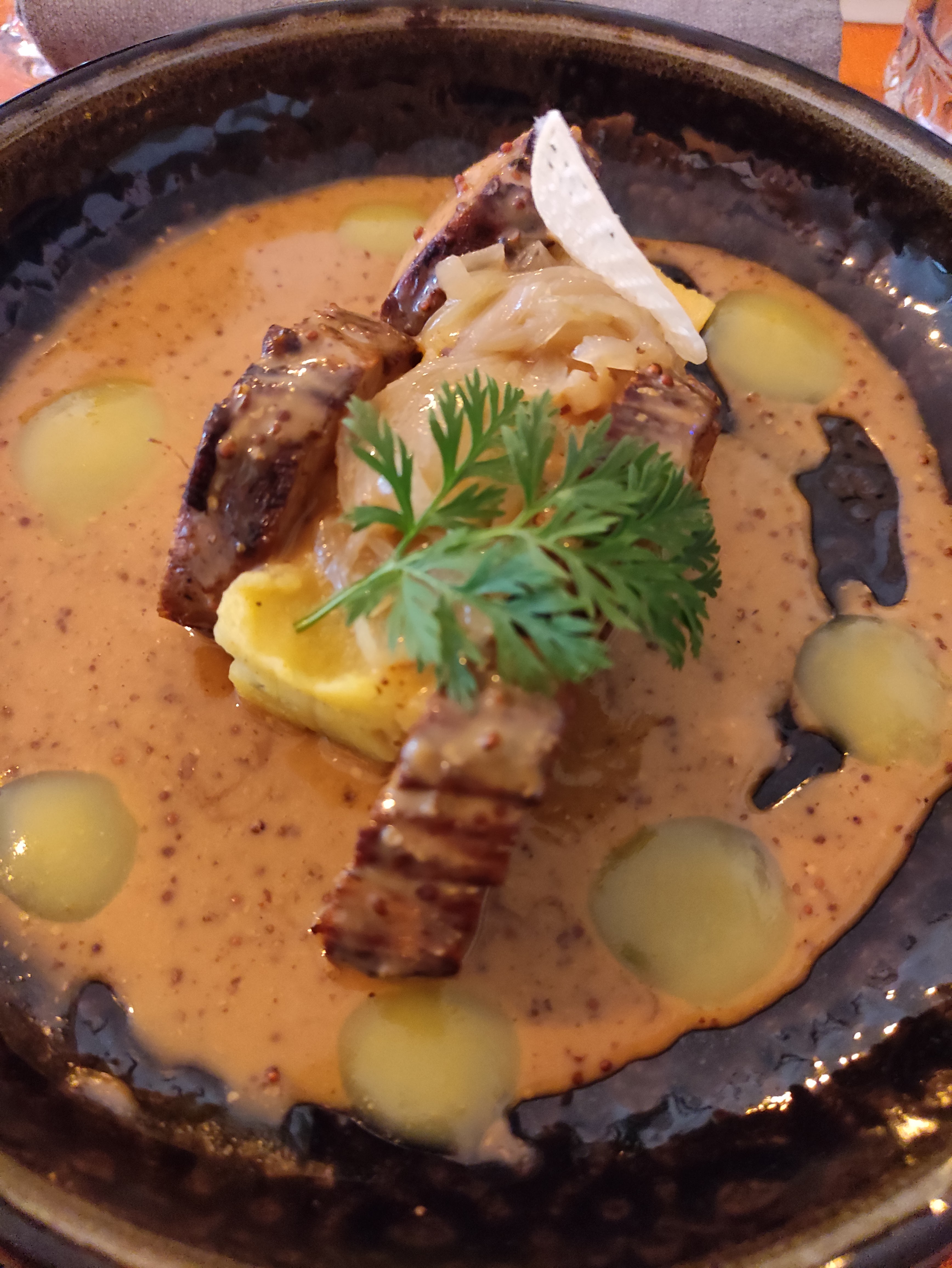 Je ne sais ce que l’on peut souhaiter de mieux en venant dans un restaurant: Cuisine goûteuse et originale Belle présentation Références de la patronne sur la confection et l’origine des produits Des petits plus jamais vus ailleurs comme un aiguiseur de couteaux pour les amateurs de côte de boeuf… qu’on a bien sûr oublié de photographier tant elle disparaît rapidement dans nos assiettes… non pas qu’elle soit frugale, bien au contraire, on a même pu remporter les restes… Le vin commandé par défaut fut bien mieux que le manquant… bref! Un festival de bonnes surprises pour lesquelles nous reviendront très vite. Ne changez surtout rien, propriétaires de ce bel endroit cosy, vous honorez votre profession. Merci pour cette excellence