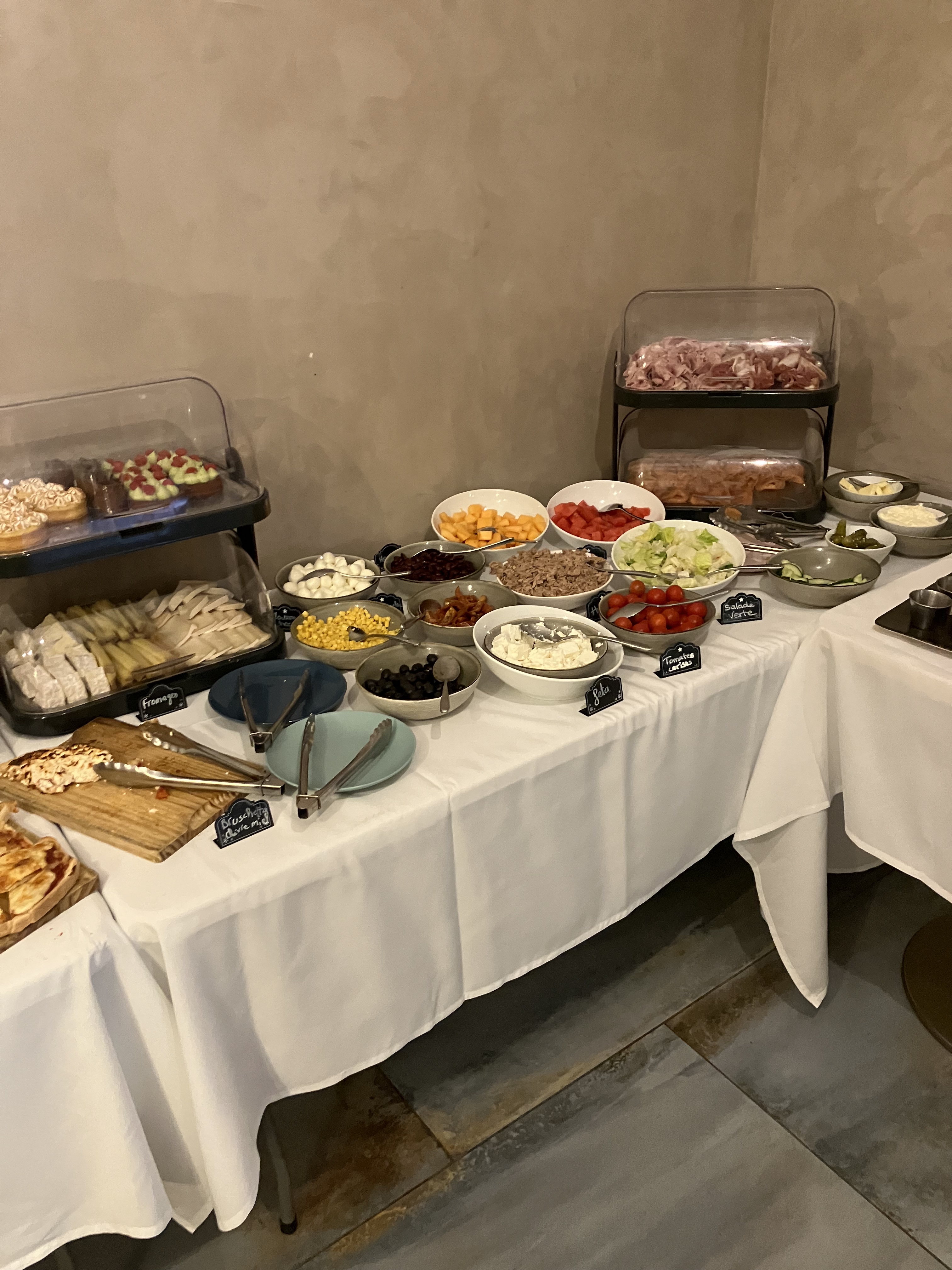 Très bonne idée Buffet sympathique et relativement variés J'aurais mis de l'omelette à la place des œufs brouillés et mis moins de cake et ajouter des brioches également des céréales et des petites saucisses