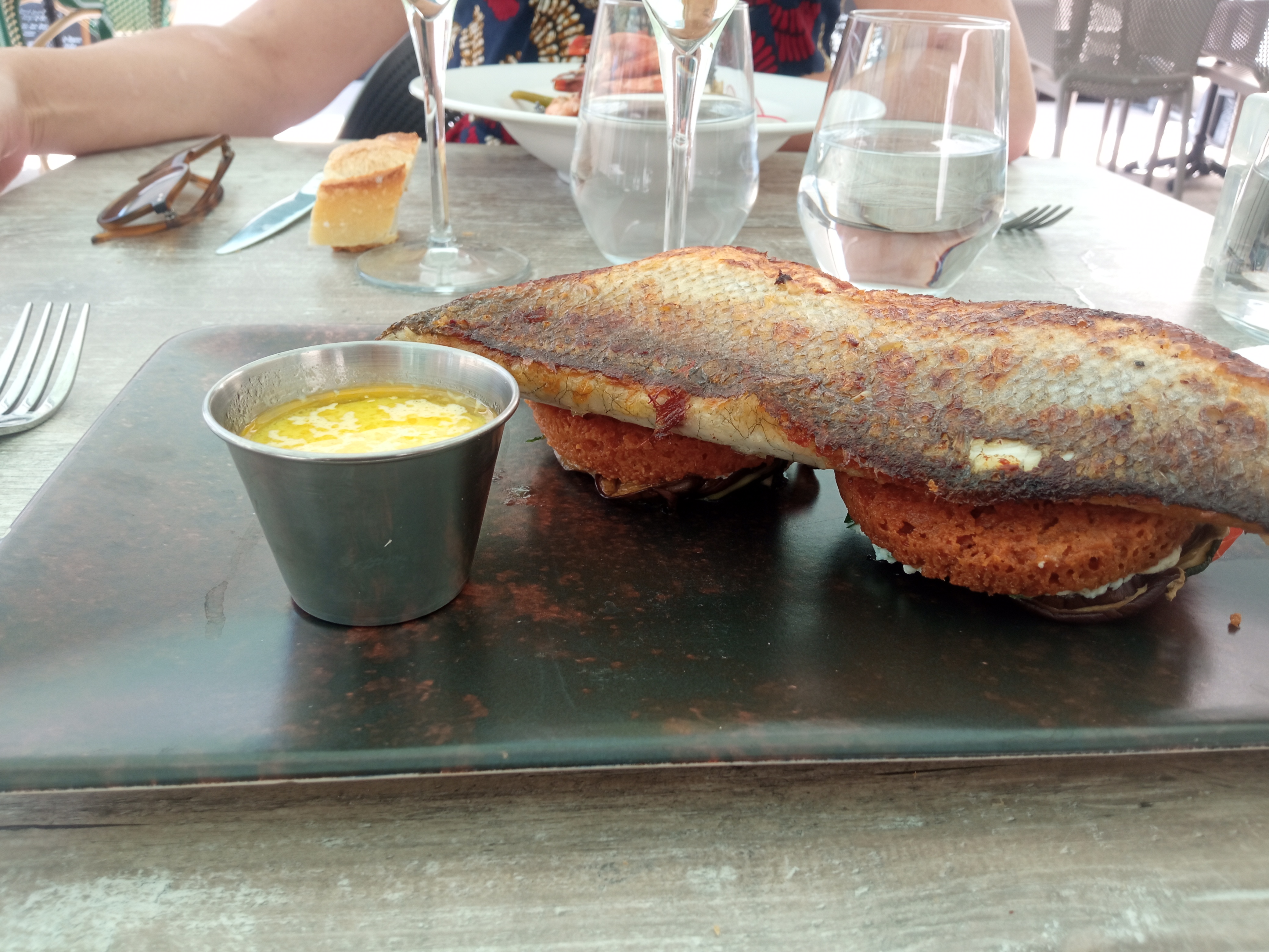 Nous avons ete decus par le service et les plats, nous avons attendu longtemps avant d'etre servis, meme pour les boissons. L'entree avec des gambas contient en realite 2 crevettes mi-crues. Le poisson n est pas mauvais mais le bar est petit et l'accompagnement sans plus. Le fish n'ships est servi sans sauce et franchement pas super sexy. Les prix sont assez delirants. 150 euros pour 2 adultes et un enfant (heureusement que les plats sont a 10 euros pour les enfants). en resume je ne recommande pas ce resto qui n'est pas a la hauteur de ses pretentions. La terrasse est sympa pour prendre un cafe s'il fait beau.