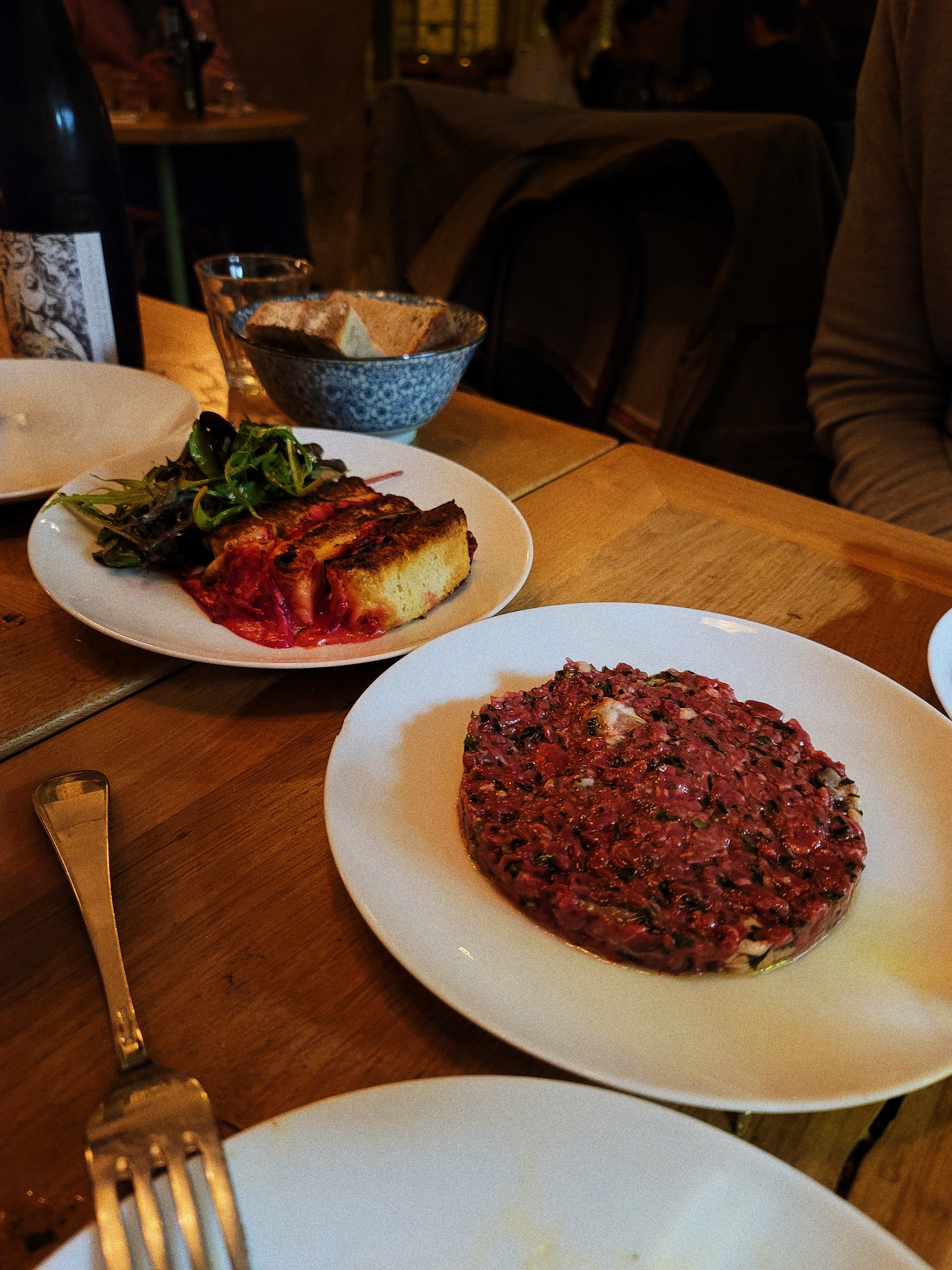 BEAU RESTAURANT MAIS SERVICE IMPARABLE. Bien que CONVIVIAL et authentique, nous aidant en anglais et en français lorsque cela était nécessaire, le serveur principal n'arrêtait pas de faire des BLAGUES SARCASTIQUES encore et encore (jamais aussi agréables à ridiculiser lors de la commande de vin), ce qui a fini par nous laisser parfois un peu confus. d'un ARRIÈRE-GOÛT NÉGATIF tout au long du repas. Ex : « voici ton vin de merde – haha, je plaisante » quand elle a apporté notre bouteille. Taboulé de chou-fleur : merveilleux, très bon goût avec les raisins partout. Joues de bœuf : FONDANT DANS LA BOUCHE, herbacées et parfaitement assaisonnées Tartare de bœuf aux huîtres : Combinaison INSOLITE INTÉRESSANTE, peut-être un peu trop d'huîtres en avant donc on ne pouvait pas vraiment goûter beaucoup le bœuf. Mais ça reste une BELLE EXPÉRIENCE à essayer. Assiette de fromages : bons fromages mais choix un peu limité et grosse portion du même morceau. Le pain était immédiatement rempli de plaisir chaque fois que notre panier était vide. Globalement, un bon repas, avec un DÉCOR CHALEUREUX confortable avec quelques plats intéressants.