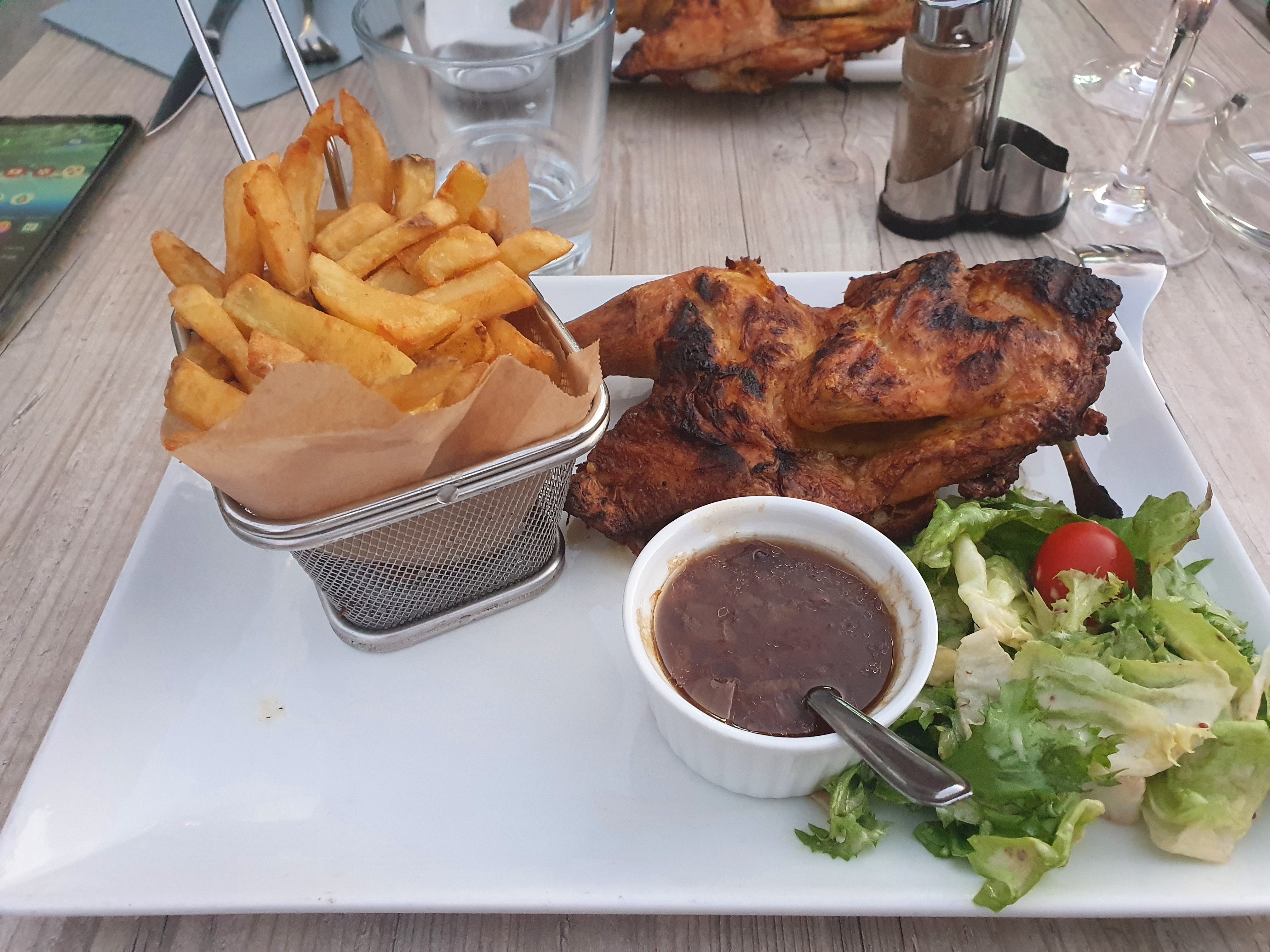 Un pur régale la cuisson des viandes est bien maîtrisé le poulet n'est pas sec. Les assiettes sont très copieuses, le personnel est accueillant, souriant et au petits soins. C'était juste super