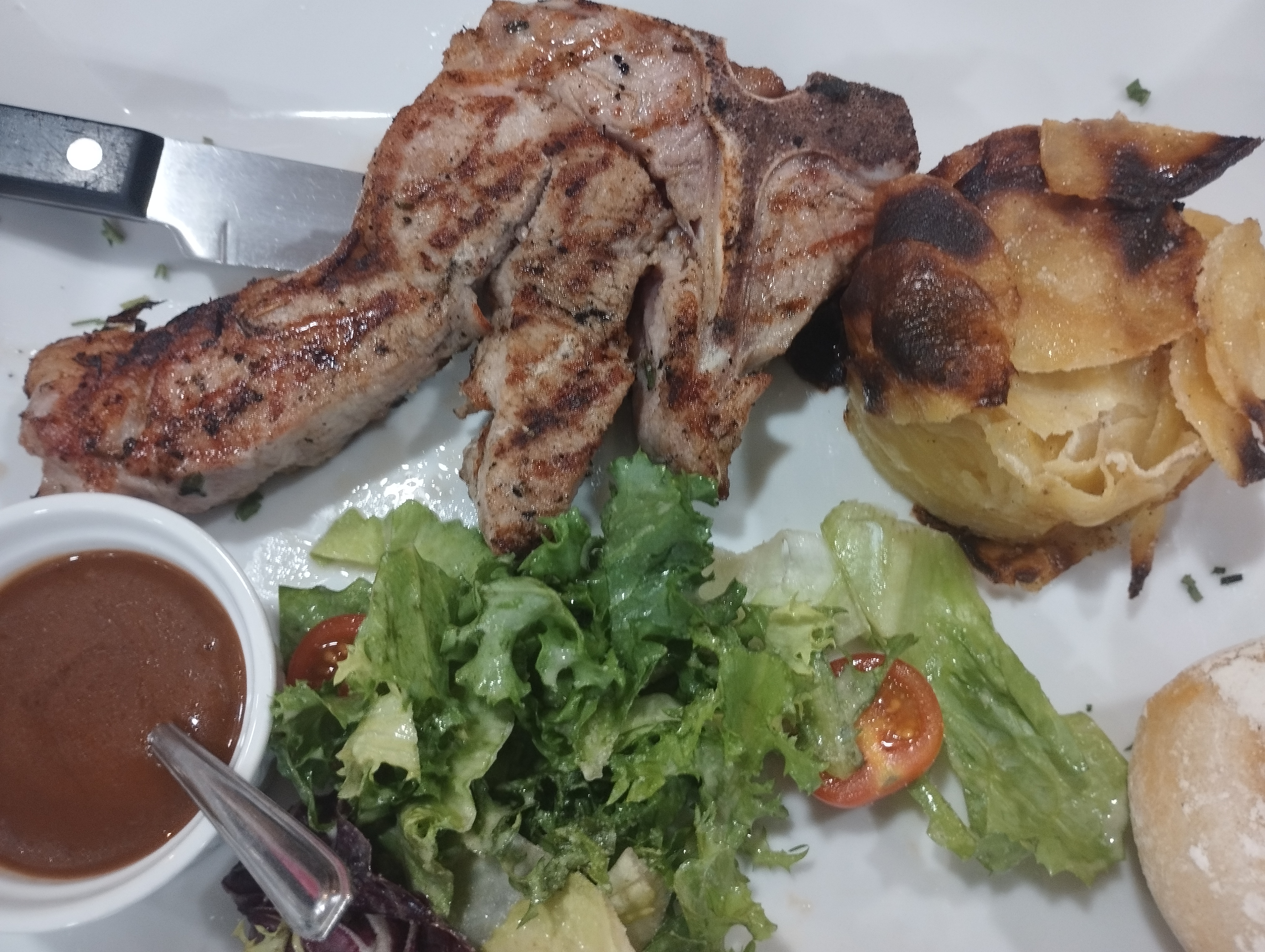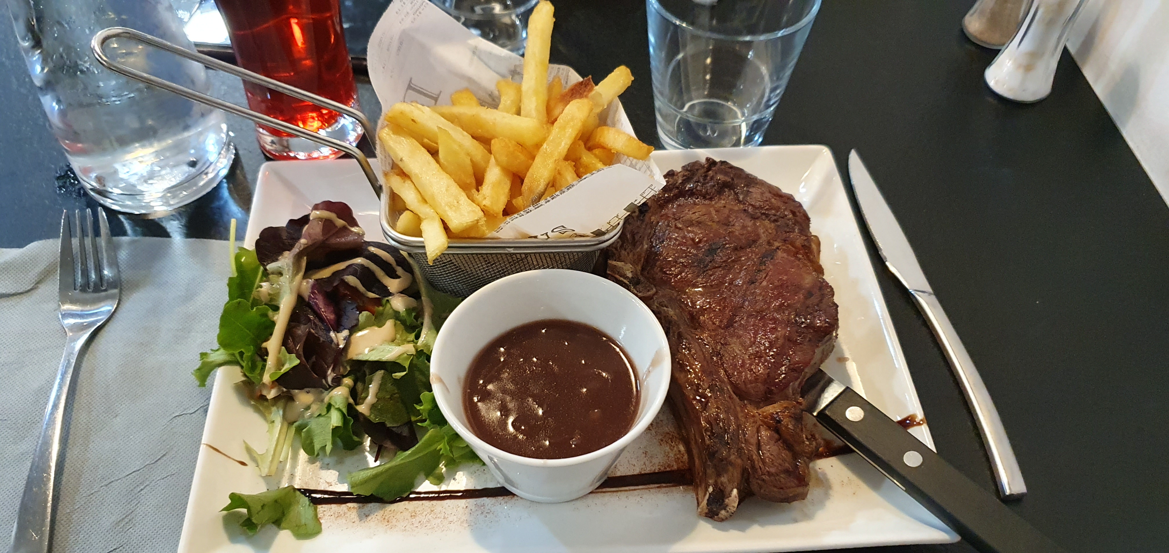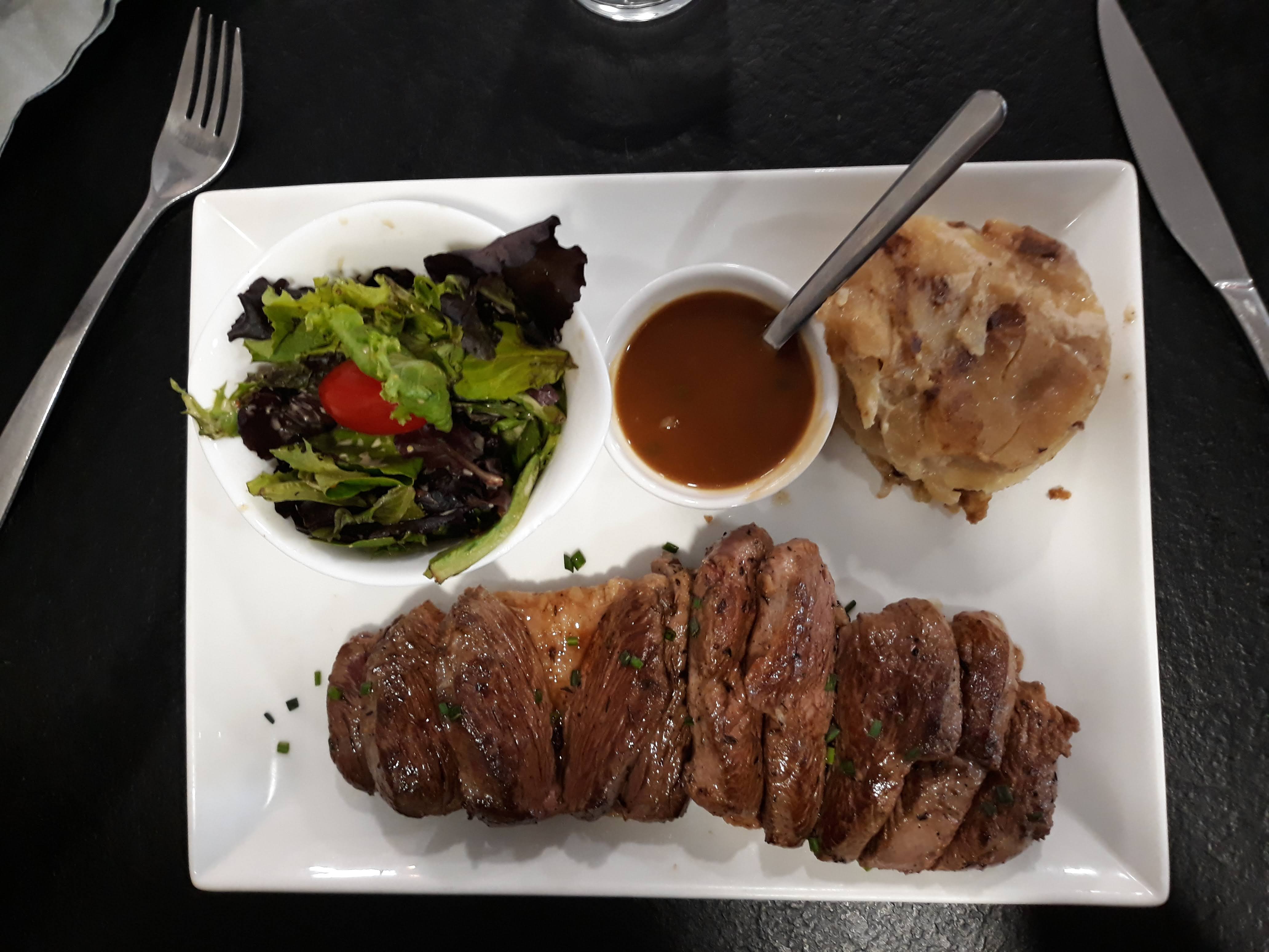 7 Mars 2020 Un restaurant agréable on nous a même ouvert la porte :') les serveurs sont souriants on nous a vites servis le magret de canard la cuisson saignante réussit, la cote de bœuf saignante manqué un peu de cuisson À MON GOÛT. Les lieux sont très propre et jolie la vue sur la cuisine grâce au grande vitre démontre un cuisine transparente. Petit bémol l'accès n'est pas facile (parking), une lampe défectueuses qui clignotait beaucoup un peu gênant vers la fin du repas mais ce n'est pas de leur faute, c'est un peu chers pour une viande de bonne qualité mais un accompagnement proposer basique et j'ai trouvé l'assiette un peu trop petite pas facile pour couper une viande de 450g. Dans sa globalité je recommande ce restaurant il reste quand même très bon et agréable le personnel est souriant ça fait plaisir a voir.
