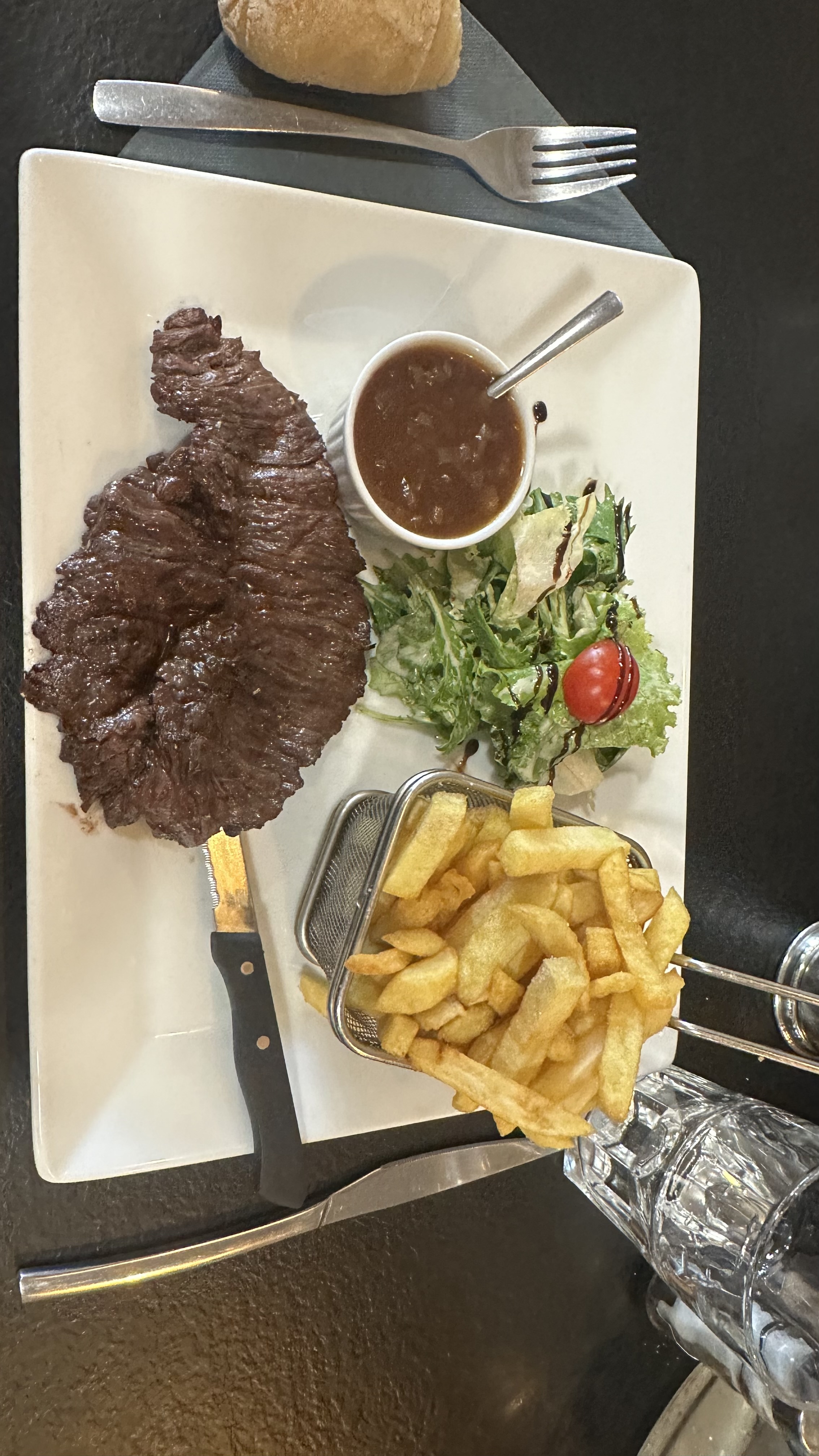 Bonne bavette, bons accompagnements. Propre, super service et super ambiance, accueil très chaleureux (resto familial). Pour la fête des pères j'ai eu droit a choisir un cadeau au moment de payer l'addition. Bref, nous y retournerons, endroit qui dénote avec les attrapes couillons de la zone.