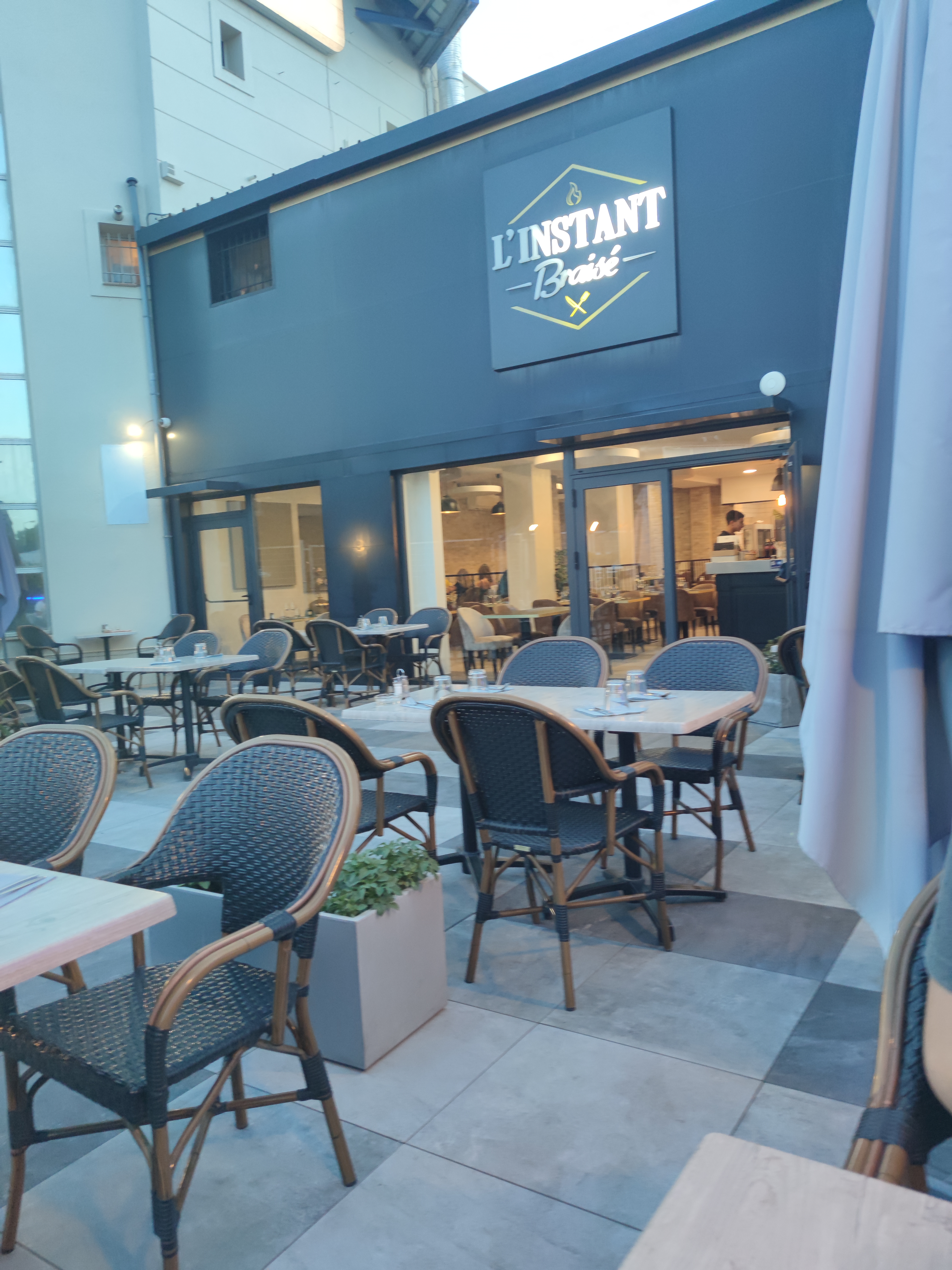 je recommande fortement l'instant braisé, nous avons était surpris avec mon mari par ce restaurant spacieux jolie propre. toutes était fait maison c'était très bons, mon mari a pris la moitié d'un poulet braisé avec accompagnement, et en dessert un café gourmand. pour moi c'était une salade burrata et en dessert une mousse a la fraise fraîche un pur delice, et mon fils fillet de poulet avec frite maison on c'est tous régaler. petit plus pour mon fils une glace patte patrouille il était très content. les serveurs étaient au petit soins et sympa, le chef rapide et l'hygiène était respecté.le patron très sympa tout était au top on reviendra c'est sur.
