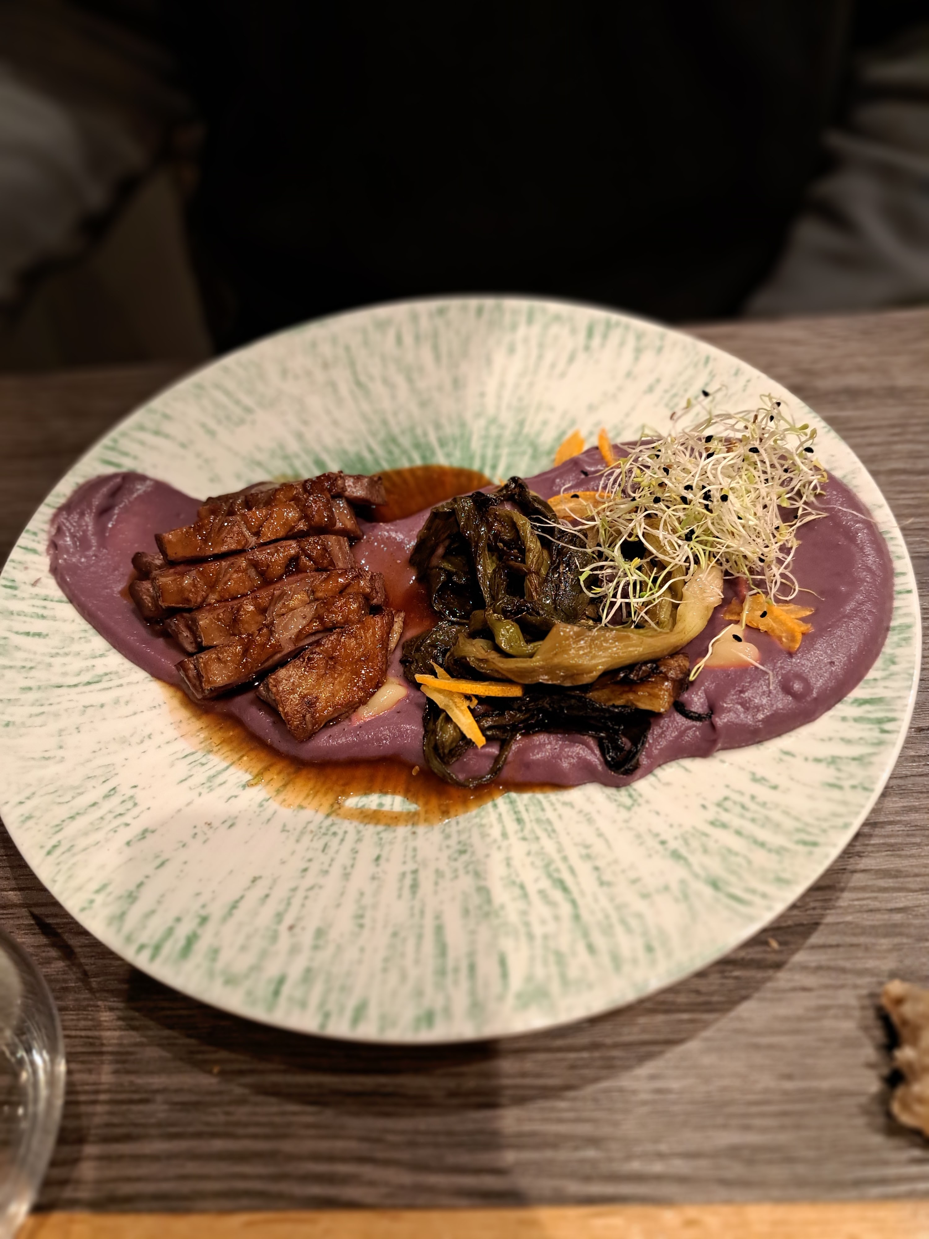 Super expérience culinaire, tant visuellement que gustativement. La cuisson et l'assaisonnement du cochon de lait est parfaite. Je recommande vivement.