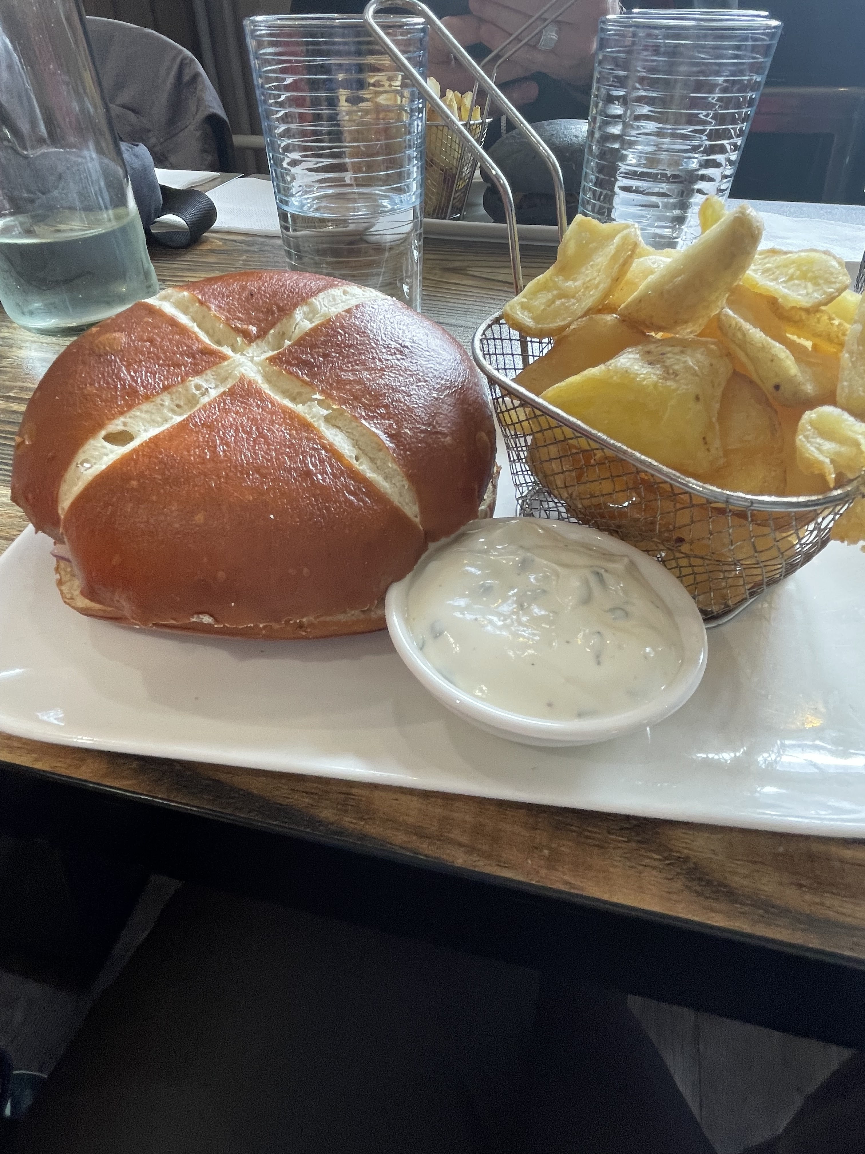 Service très sympathique et serviable. Choix intéressant entre bagel, hamburger et bretzel avec diverses garnitures. J'ai mangé un excellent cheeseburger avec des frites bien frisées et j'ai pris un bagel végétarien avec moi, qui était tout aussi savoureux. J'étais là seul, vers 18h, les plats à emporter étaient faits entre-temps. Les choix végétariens pourraient être plus étendus.