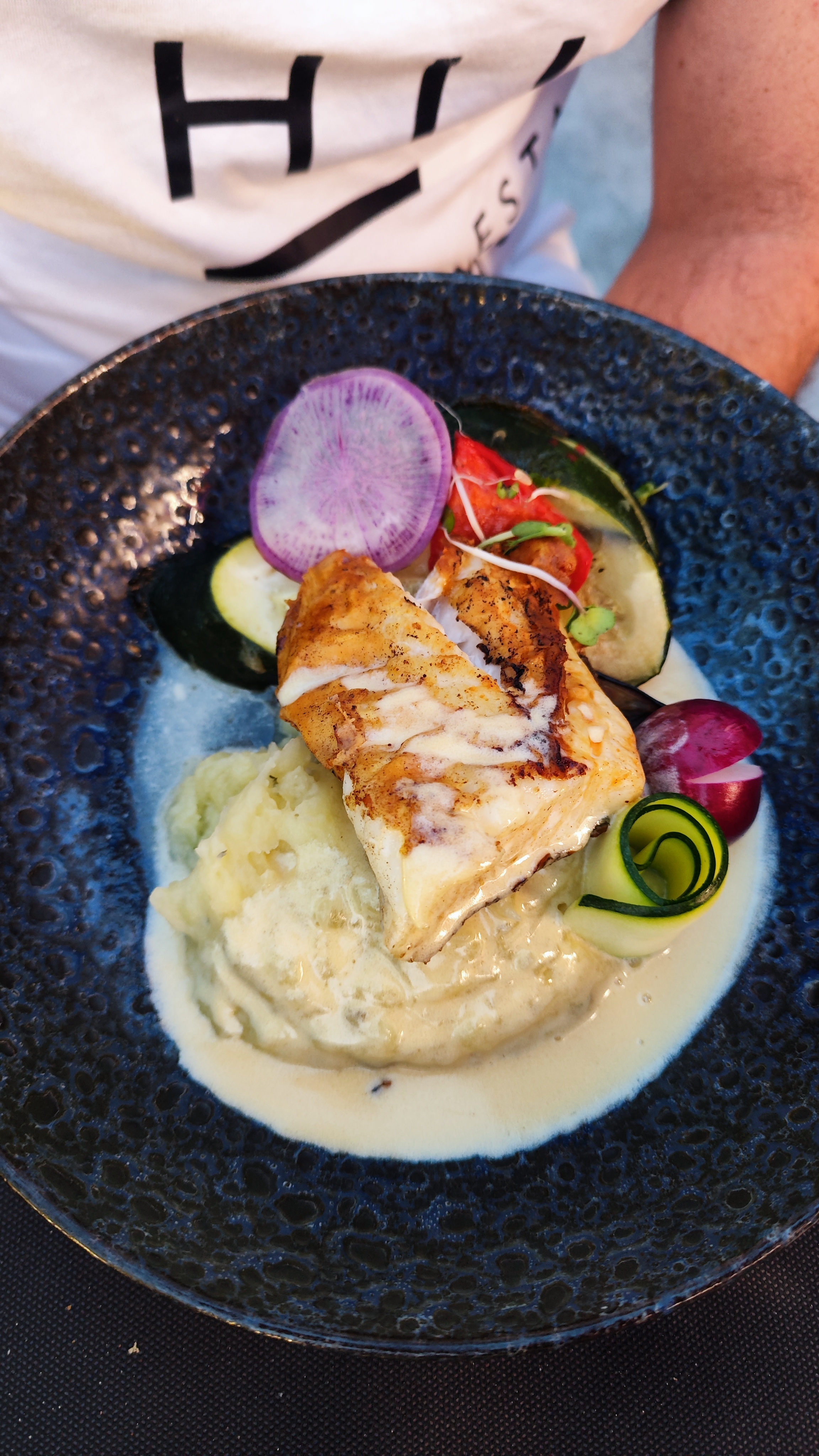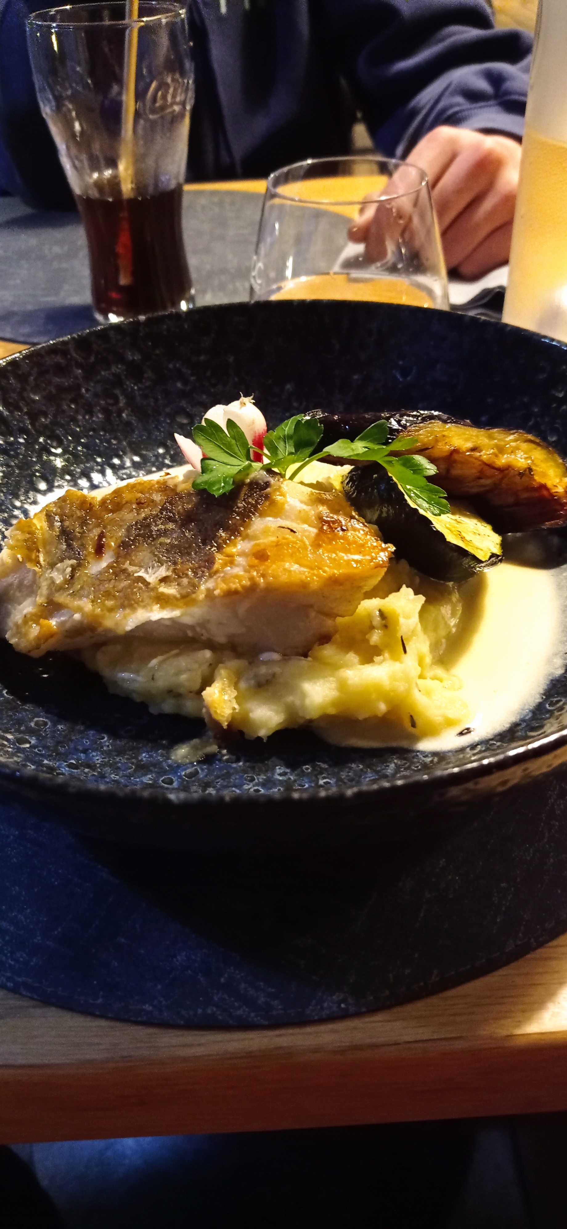 Très bien. Mais attention, le serveur ne prend pas en notes certaines demandes : une bière blanche n est pas une bière blonde, le boeuf est demandé saignant mais il est à point. Mon conjoint ne veut que des frites en accompagnement mais il a une assiette moitié frites et salades. Sinon, bon accueil et les plats délicieux. En photo, un pavé de morue avec purée au thym et sauce au beurre blanc. Excellent !!