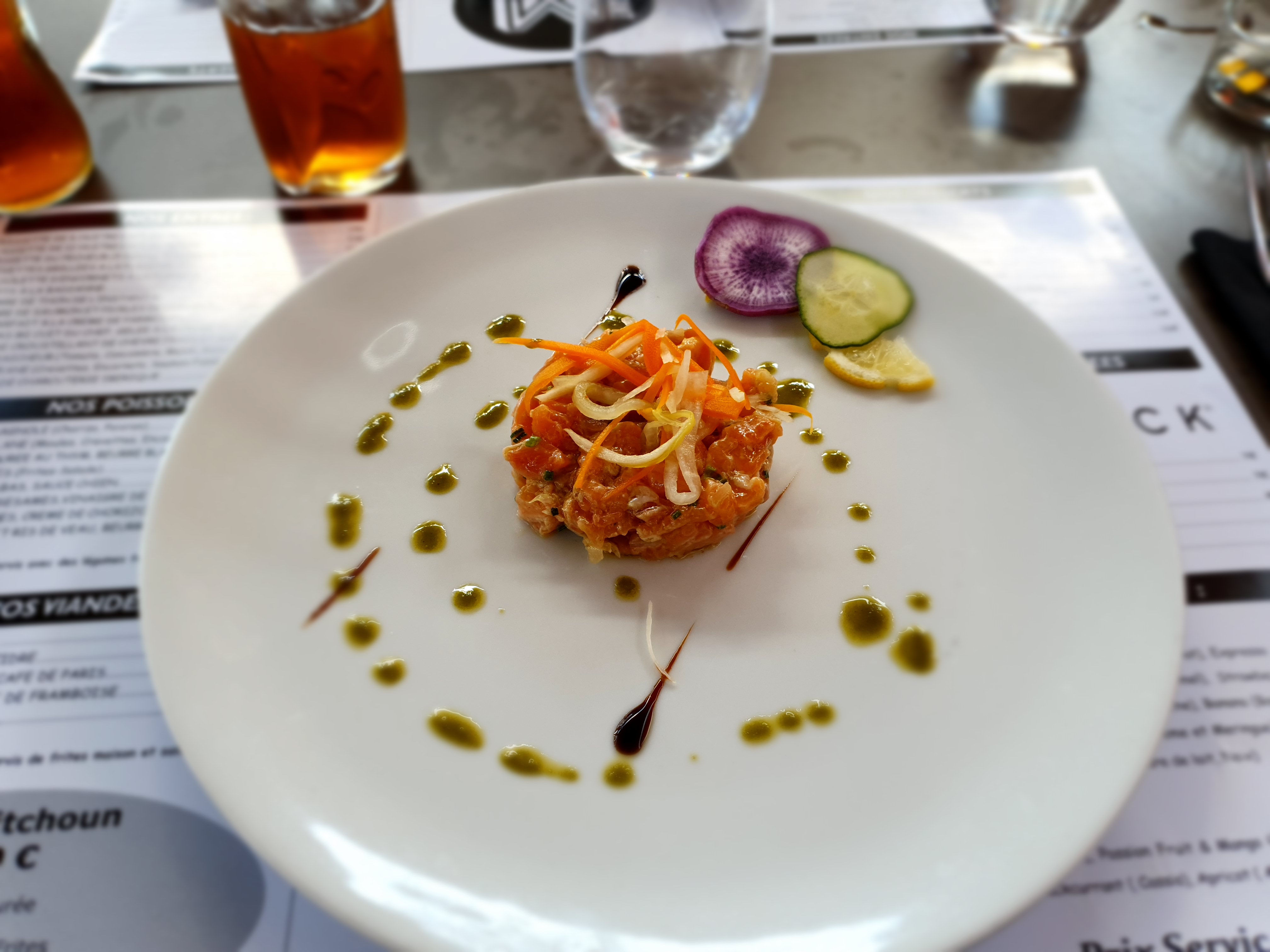 Service super serveurs et serveuse attentifs aux demandes , tartare de bœuf aux couteaux aurait pu être plus finement hachée(gros bouts de viande et se nerf) , très bon dessert et présentation des plats passant devant nous très jolie. Tapenade d'entrer aux olives noires pas très relevée... les tables ne sont pas les unes sur les autres se qui motive la recherche avec le COVID.