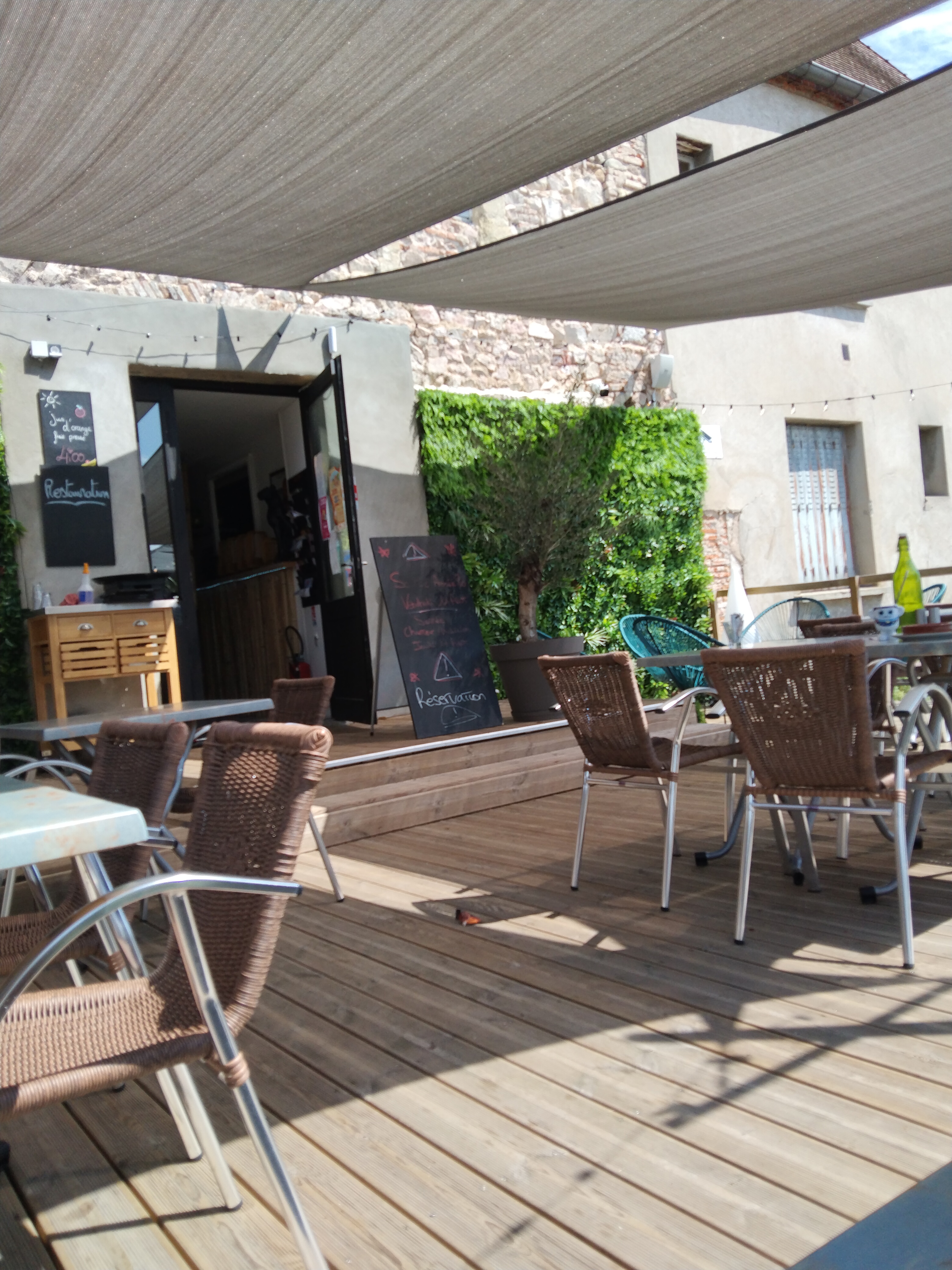 Endroit agréable, repas correct. Sommes passés réserver une table que nous avons choisi à l'ombre en ces temps de canicule, lorsque nous sommes arrivés pour déjeuner, mauvaise surprise notre table était occupée! Le serveur nous a dit ah ! nous vous avons mis là (table ombre/soleil) l'explication du serveur, ce couple à choisi celle-la, mais cette table nous était réservée enfin ! du coup nous avons eu très chaud ! très déçus et très en colère ! C'est inadmissible et irrespectueux pour le client !!! Du coup nous sommes partis sans prendre le dessert, dommage pour un moment de détente, c'était raté ! Nous n'y mettrons plus les pieds.
