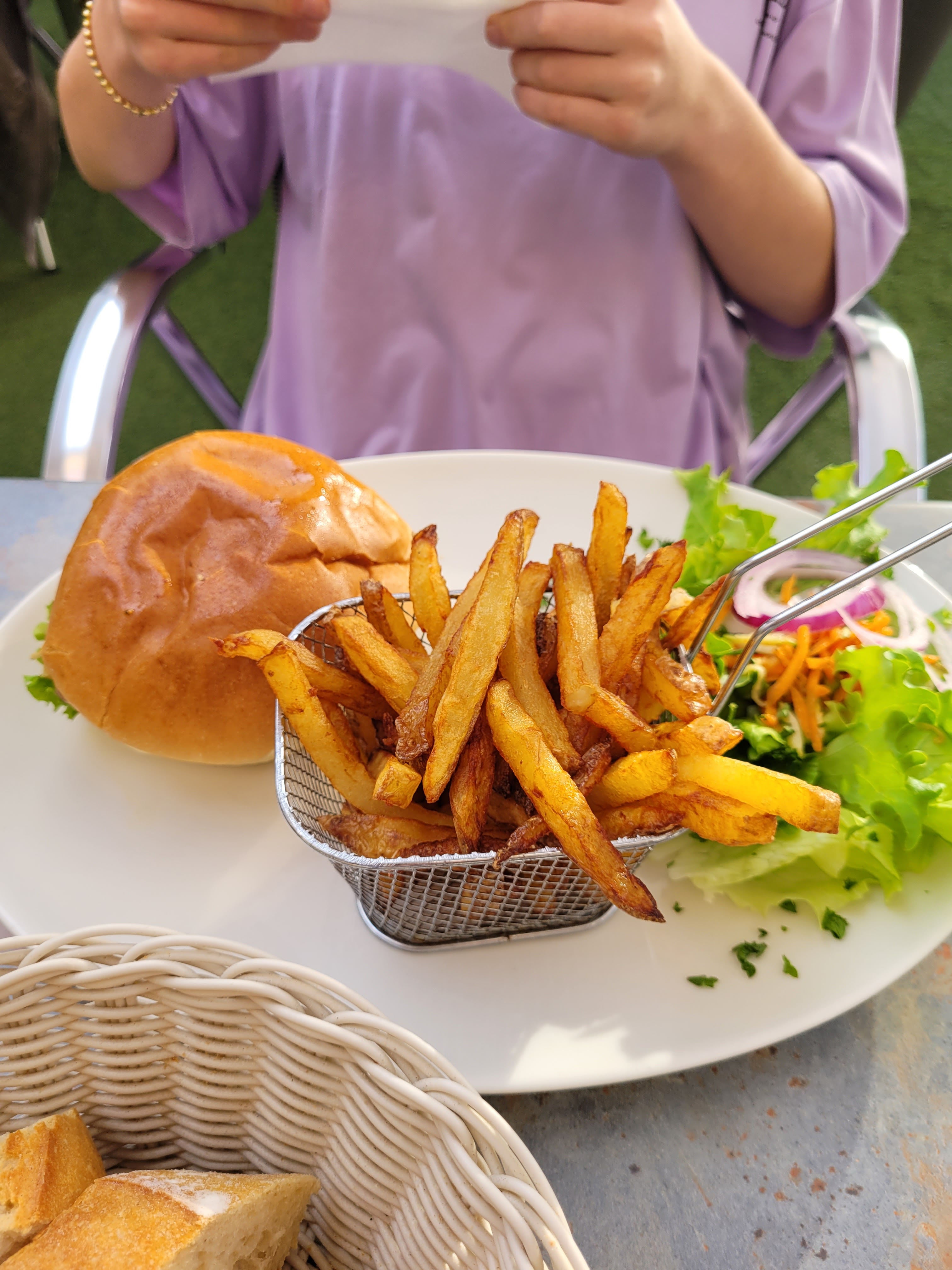 On s'est arrêté manger très tard pour le repas du mid. On faisait le tour de plusieurs brocantes et nous sommes arrivés à Lapalisse vers 14 h et ils sont acceptés de nous servir. J'accueille été toujours la et en plus le temps était au rendez vous. Très bon burger, mes ados filles les ont trouvé meilleur que les fast food. On reviendra sûrement