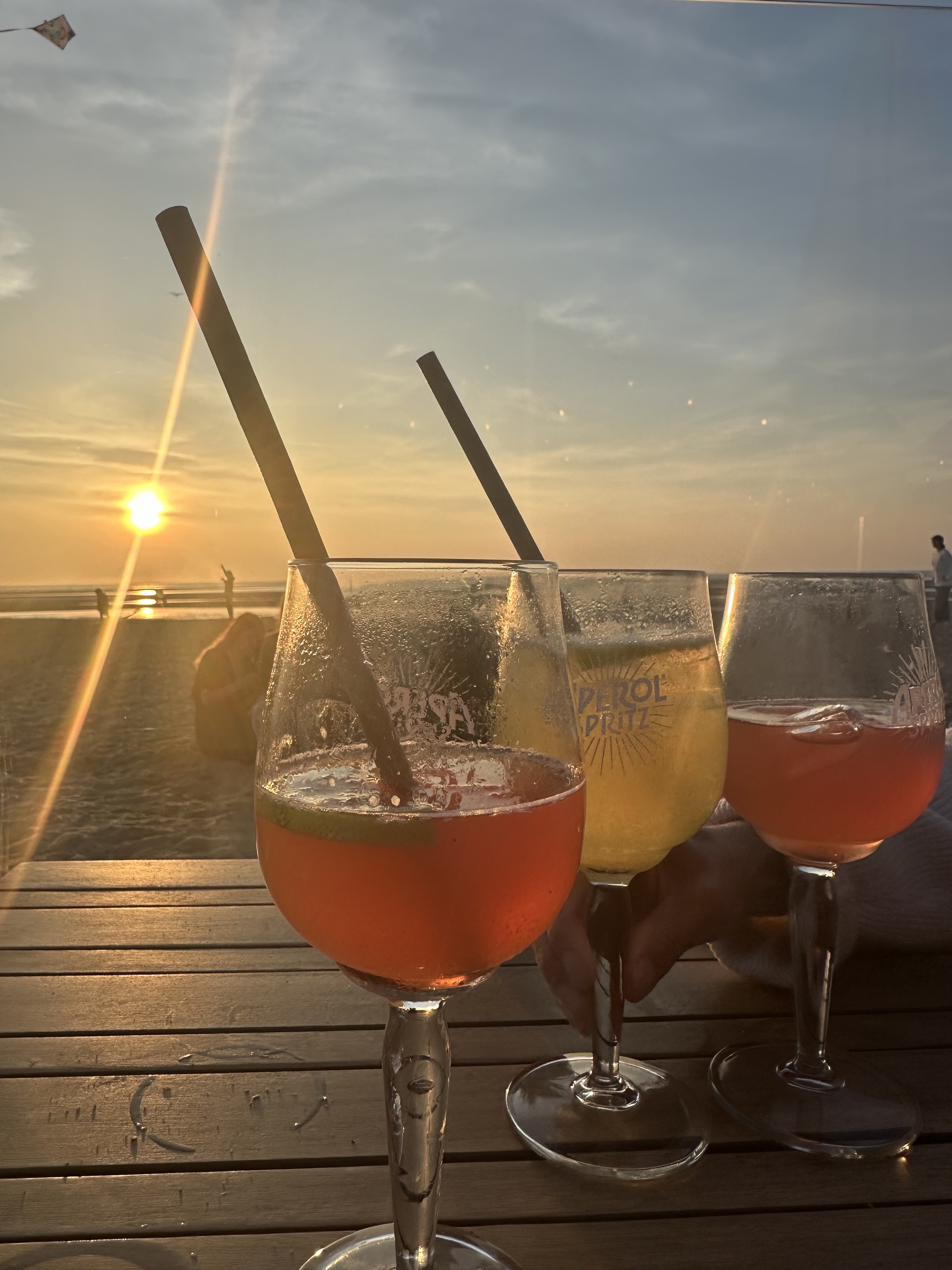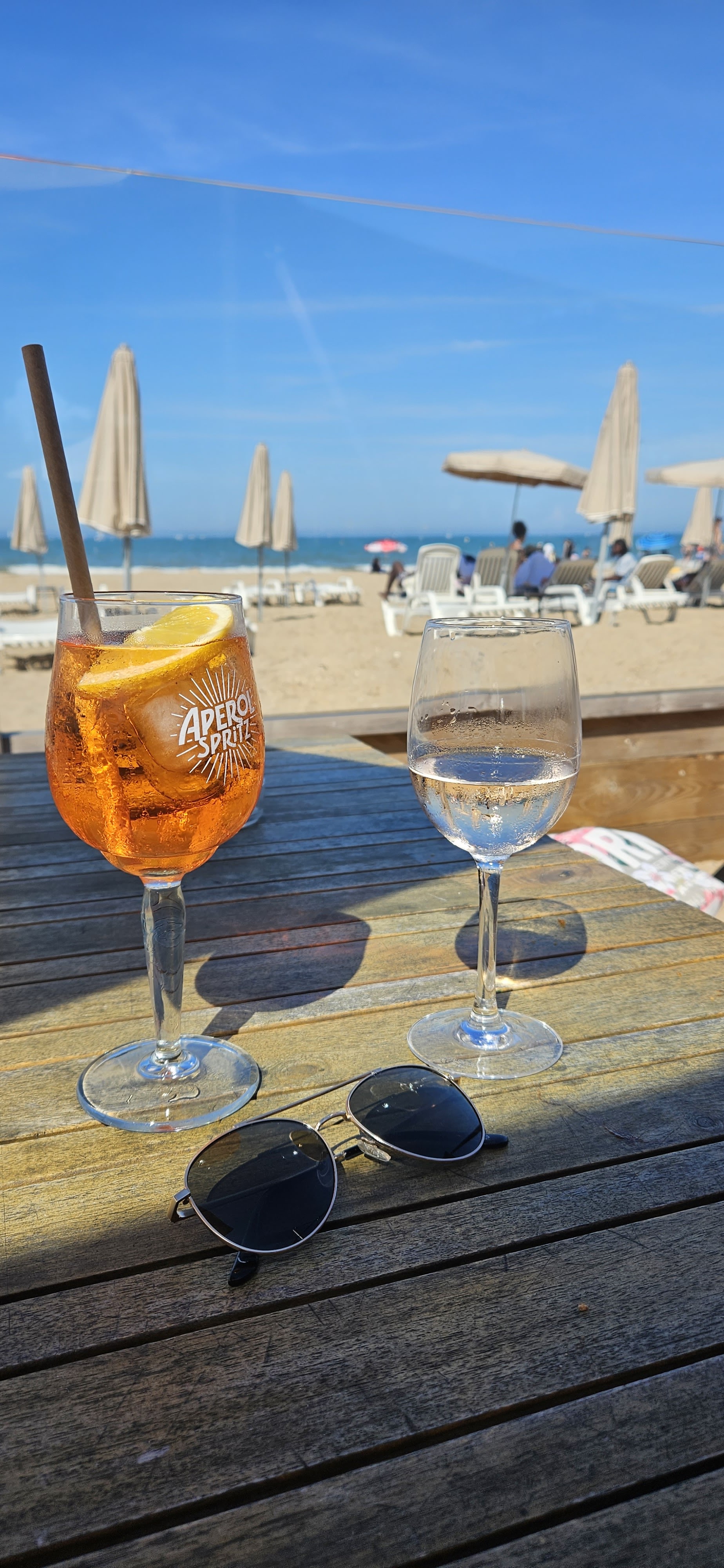 fin août malgré qu'il soit 19h30 passer ils ont accepté juste pour 1 verre , cets cool ça posé prendre a verre en profitant du couché de soleil pied dans le sable et sur un transat avec une musique de fond , avant de retourner sur Cabourg les part vent protège un peut tous sa réunis en fond un bon endroit je recommande