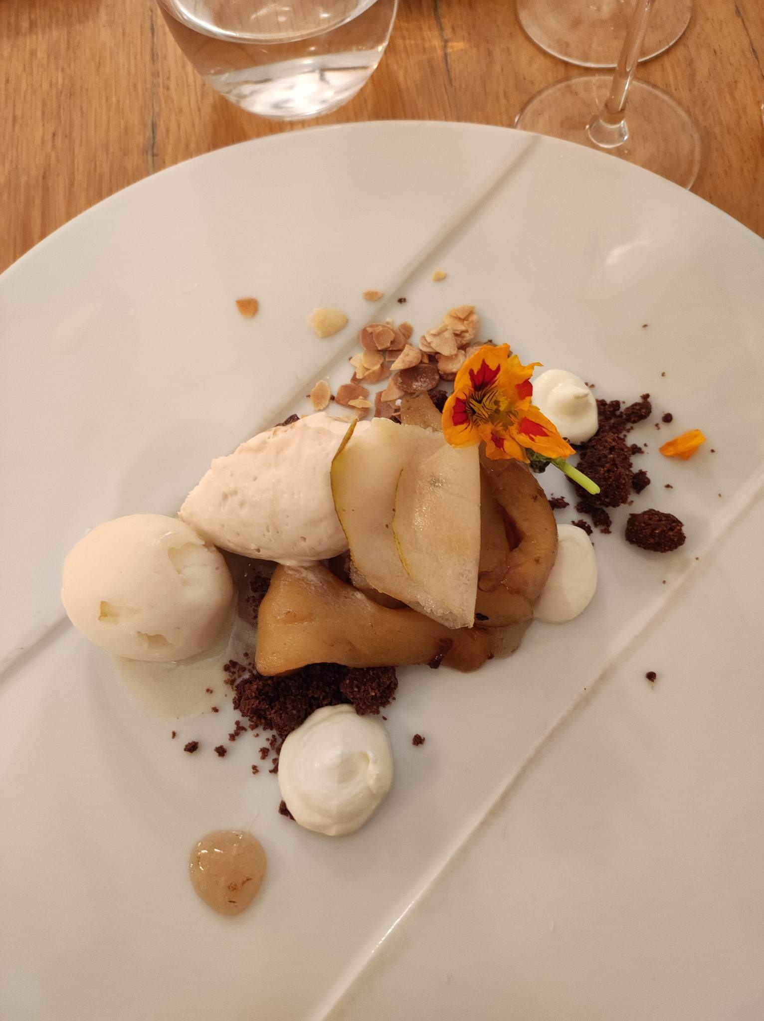 Un accueil prévenant et souriant pour nous proposer des créations originales avec des ingrédients simples, bien choisis et surtout parfaitement mis en valeur. Sanglier, purée de topinambours, potimarron rôti, châtaignes avec un petit supplément cèpes poêlés. Un dessert sous forme d'une déclinaison autour de la poire rôtie, en sorbet... Un vrai régal, arrosé d'un Chinon en biodynamie Les Perruches du Domaine Lambert fruité, aux tanins légers parfait avec le sanglier. Avec une furieuse envie de renouveler l'expérience,