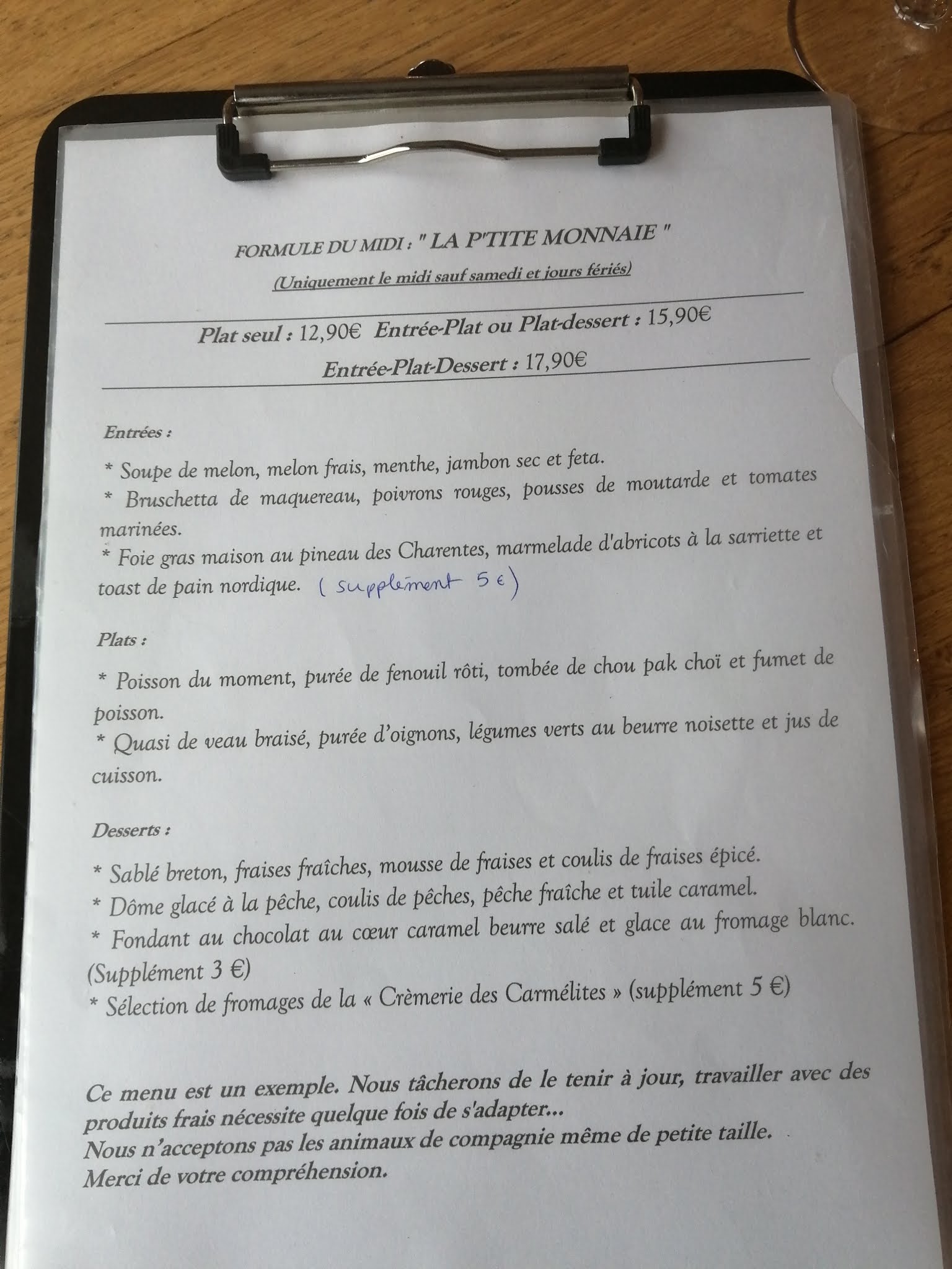 Très bon déjeuner ! Entrée +plat+dessert environ 18 EUR. Donc un excellent rapport qualité/prix. Bravo au chef.