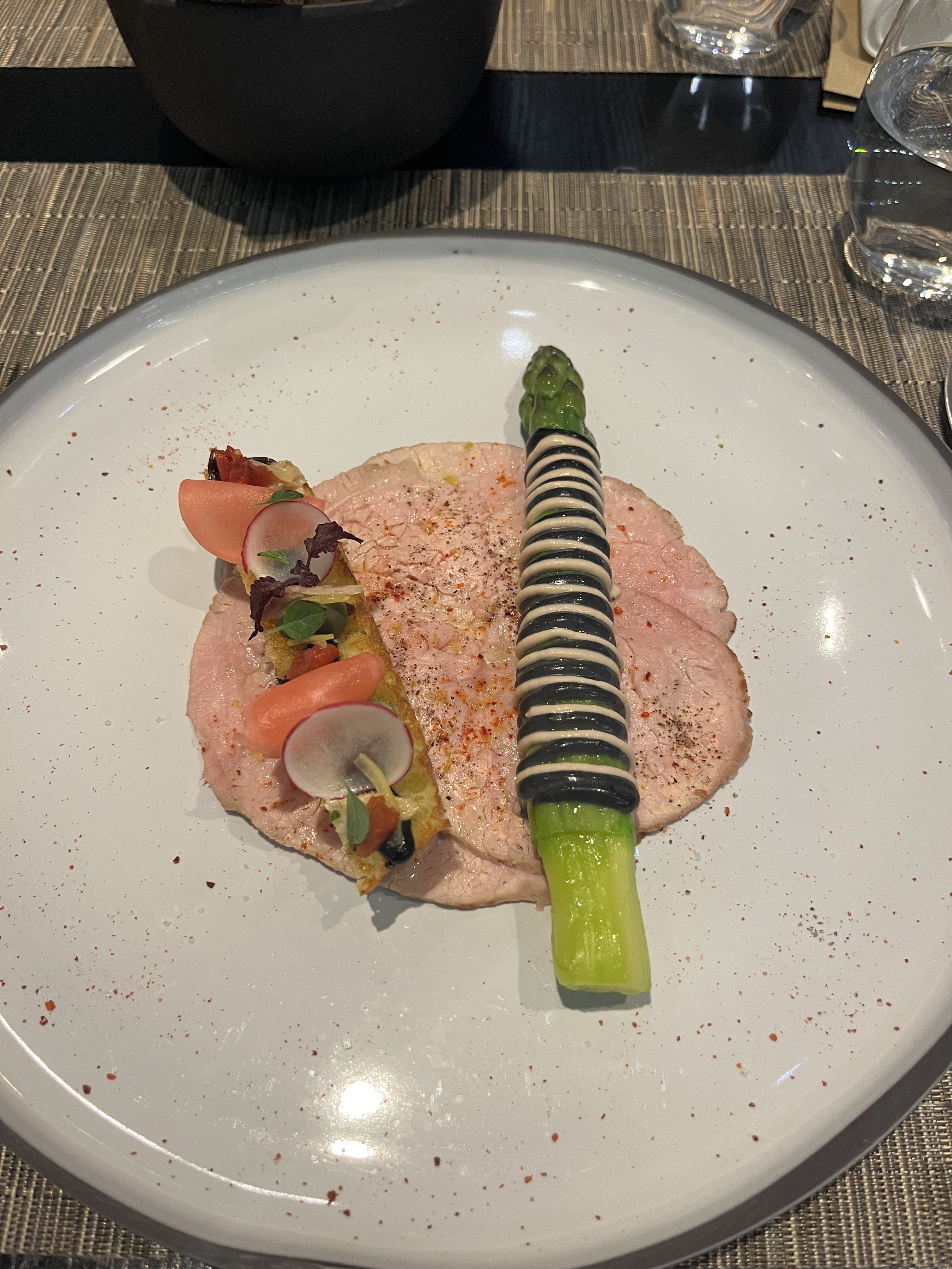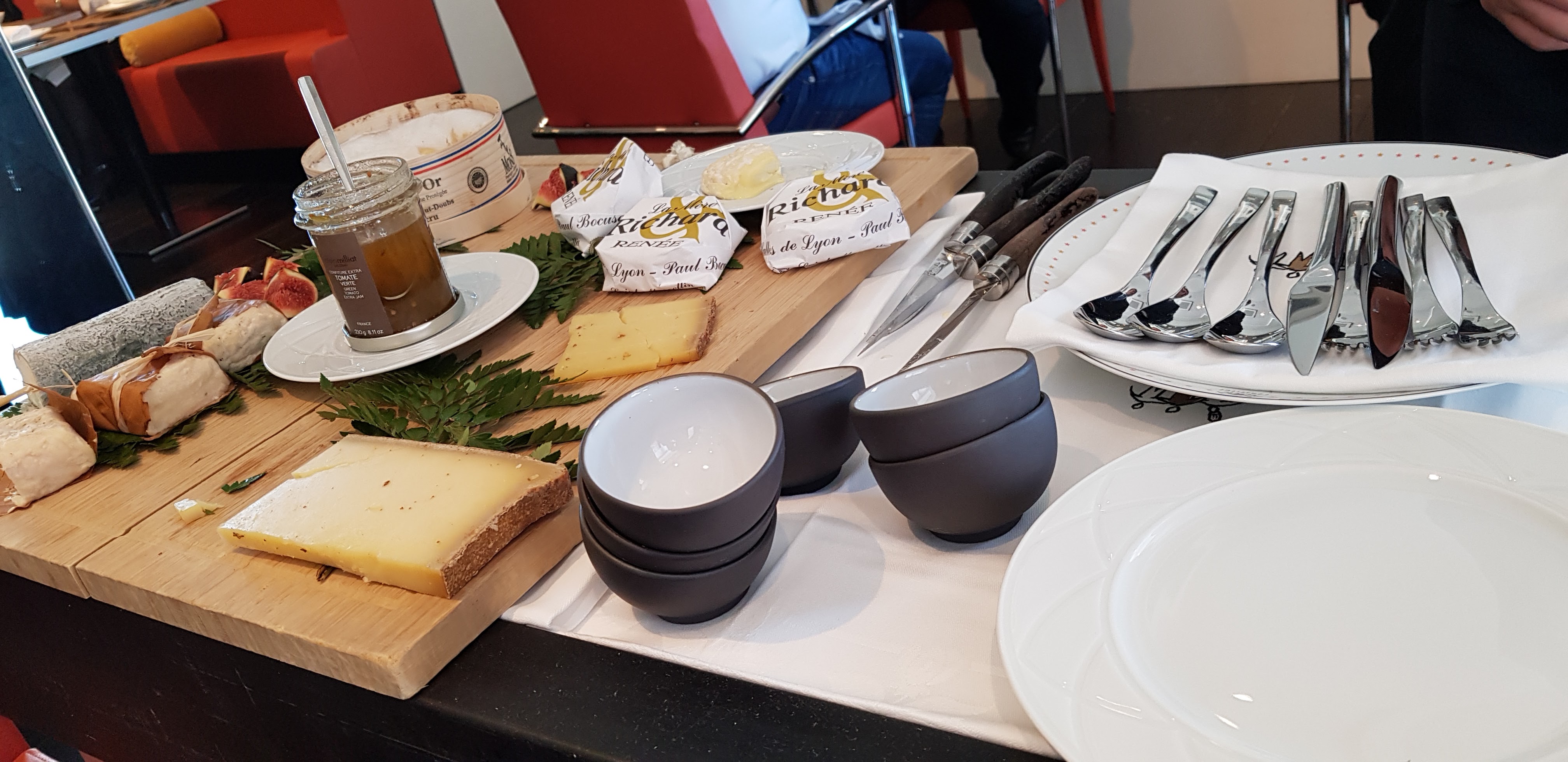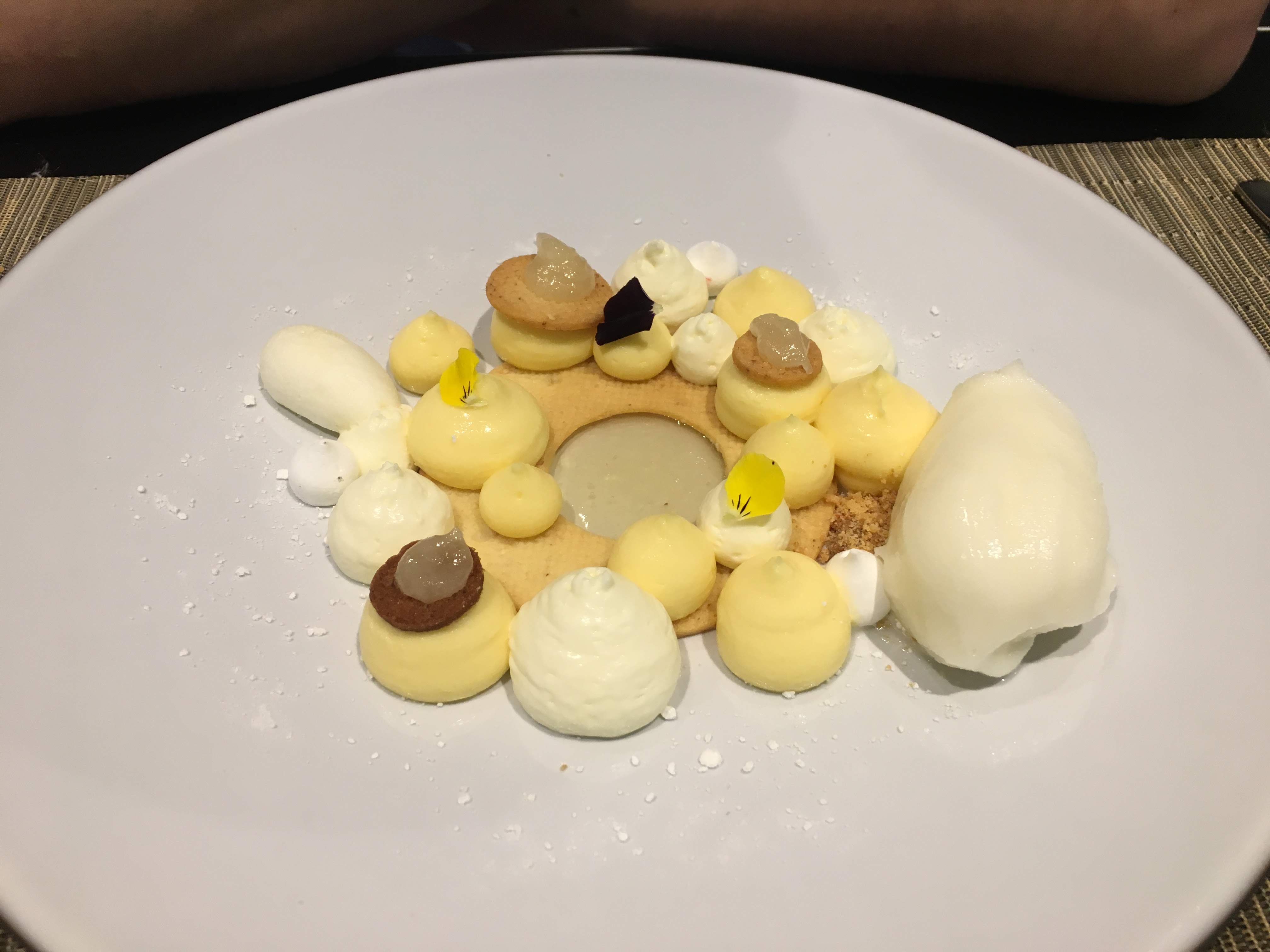 Le dîner de ce soir a eu lieu au restaurant L'Institut Paul Bucose - c'est un restaurant pédagogique qui fait partie de l'institut Paul Bocuse et qui est rattaché à l'hôtel Le Royal MGallery où nous séjournons. C'était pour le moins un régal gastronomique. Nous avons commencé avec des asperges blanches émincées dans une sauce aux morilles et un œuf poché au caviar si bon que nous en voulions plus. Ensuite, nous avons eu un délicieux poisson lotte (goût de homard) avec une purée de petits choux de Bruxelles rôtis, et du veau poêlé avec une croûte d'agrumes et des asperges vertes râpées qui m'ont donné envie de demander quelques secondes - ensuite nous avons eu une délicieuse assiette de fromages - qui savait que c'était ok pour s'amuser avec différents fromages au dîner. Même si nous étions si rassasiés, nous avons dû essayer le dessert. C'était un cheesecake au citron avec un sorbet au citron vert. Doux et piquant et aussi très délicieux !