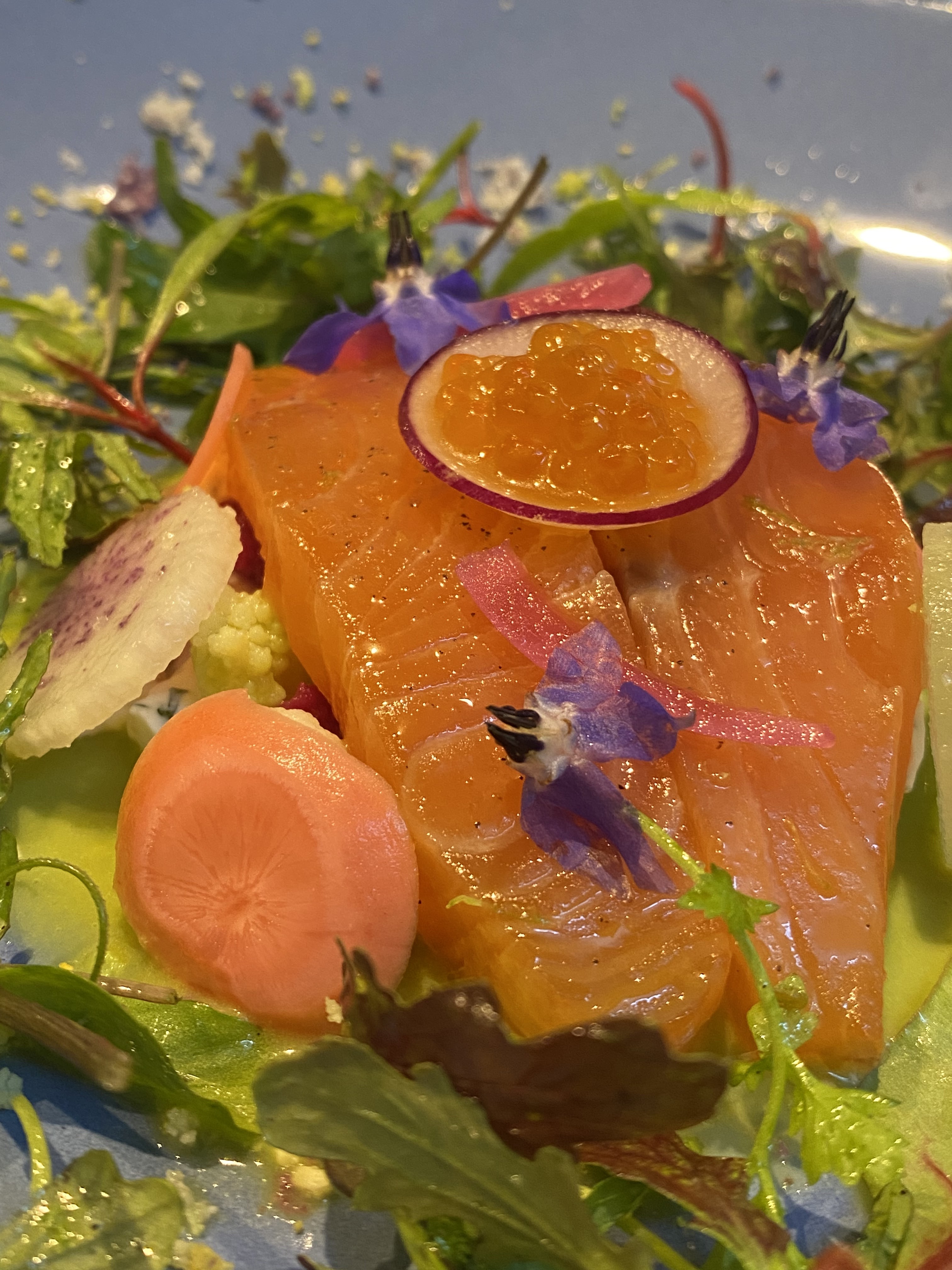 Cuisson parfaite pour le saumon façon gravlax et le canard, et un dessert très léger. Nous avons passé une agréable soirée