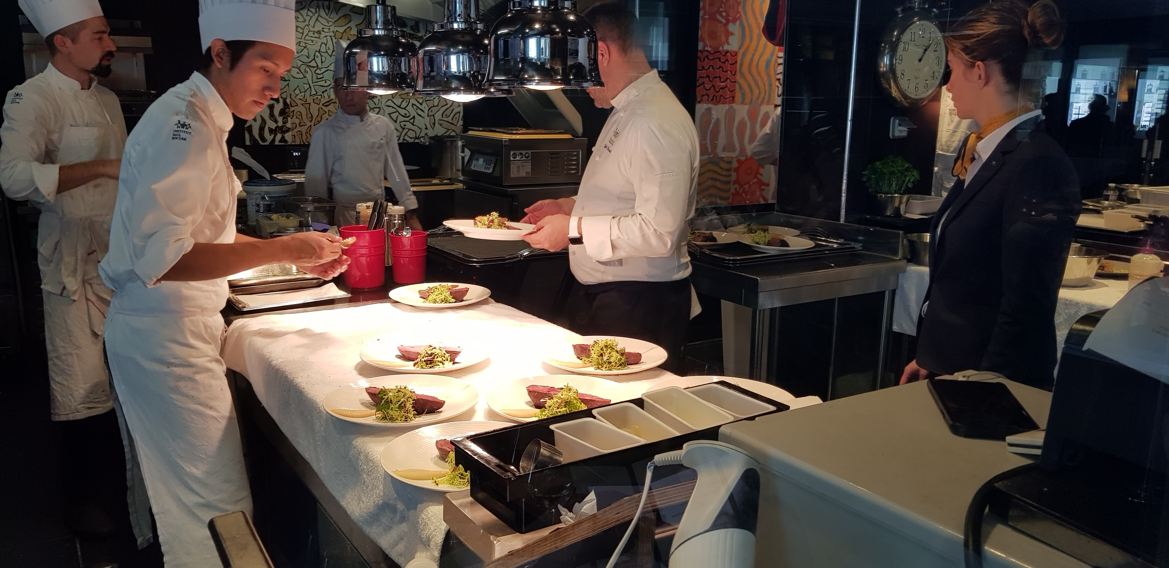 Que dire. Quand l'école et l'art sont reunis. Ici on vous apprend que l'art existe aussi dans vos assiettes et n est pas réservé qu'aux peintres, à la mode où l'architecture. Des assiettes superbes, des saveurs, du goût sont la valse qui vous accompagnera tout au long de la soirée. Un sommeiller (à recommander vivement) fera jaillir de ses mots passionnés, les vallons et les coteaux ensoleillés de france. Bref tout est là dans un souvenir riche de monsieur Paul Bocuse tourné vers l avenir, avec vue imprenable sur la cuisine et sa brigade. L'adresse est absolument incontournable. Merci à toute l'équipe de ce restaurant pour ce moment inoubliable.