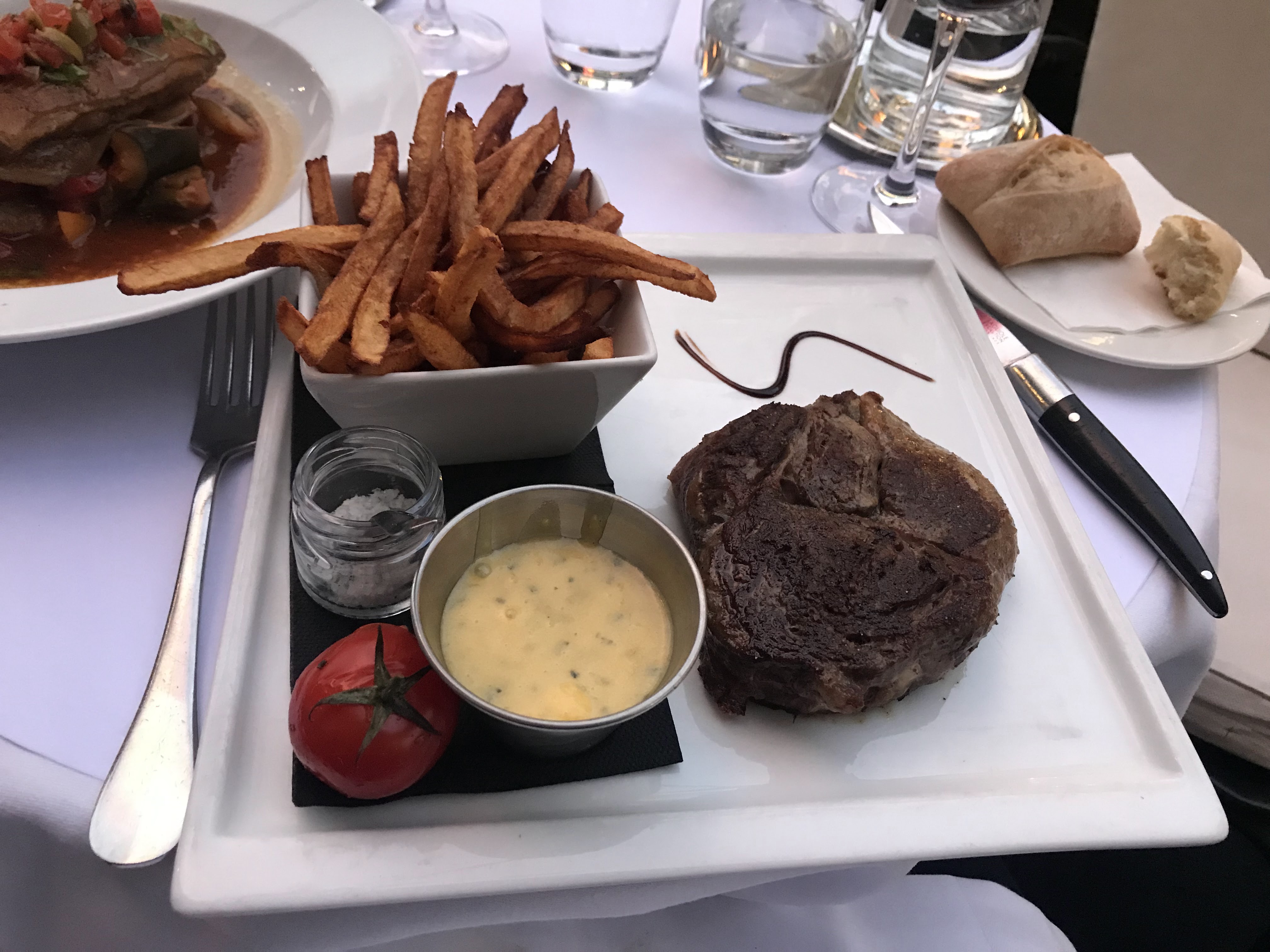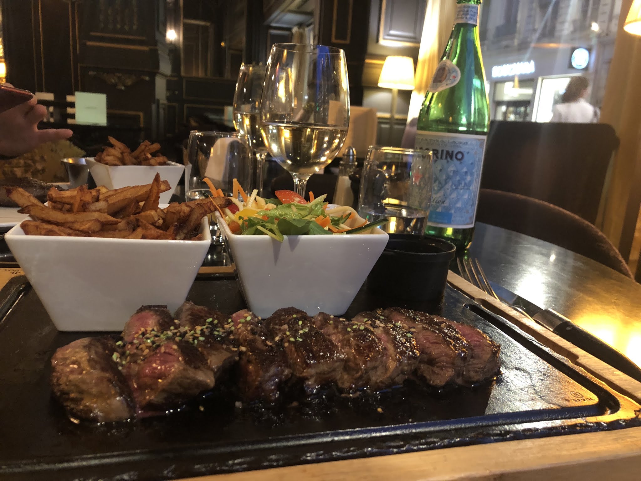 A fuir Pour l’entrée, 45 minutes d’attente avant la prise de commande et 20 minutes de plus pour etres servis. Nous demandons du pain, des condiments et de l’eau et le tout met au total 15 minutes à arriver. Un temps d’attente terriblement long et une prise de commande catastrophique, pour le service, un plat parti à la mauvaise table, des accompagnements arrivés 10 minutes après le plat servi froid (une côte de bœuf à 110€) et des sauces qui mettent encore plus de temps à arriver. En globalité, c’était réellement honteux. Je ne recommande en aucun cas.
