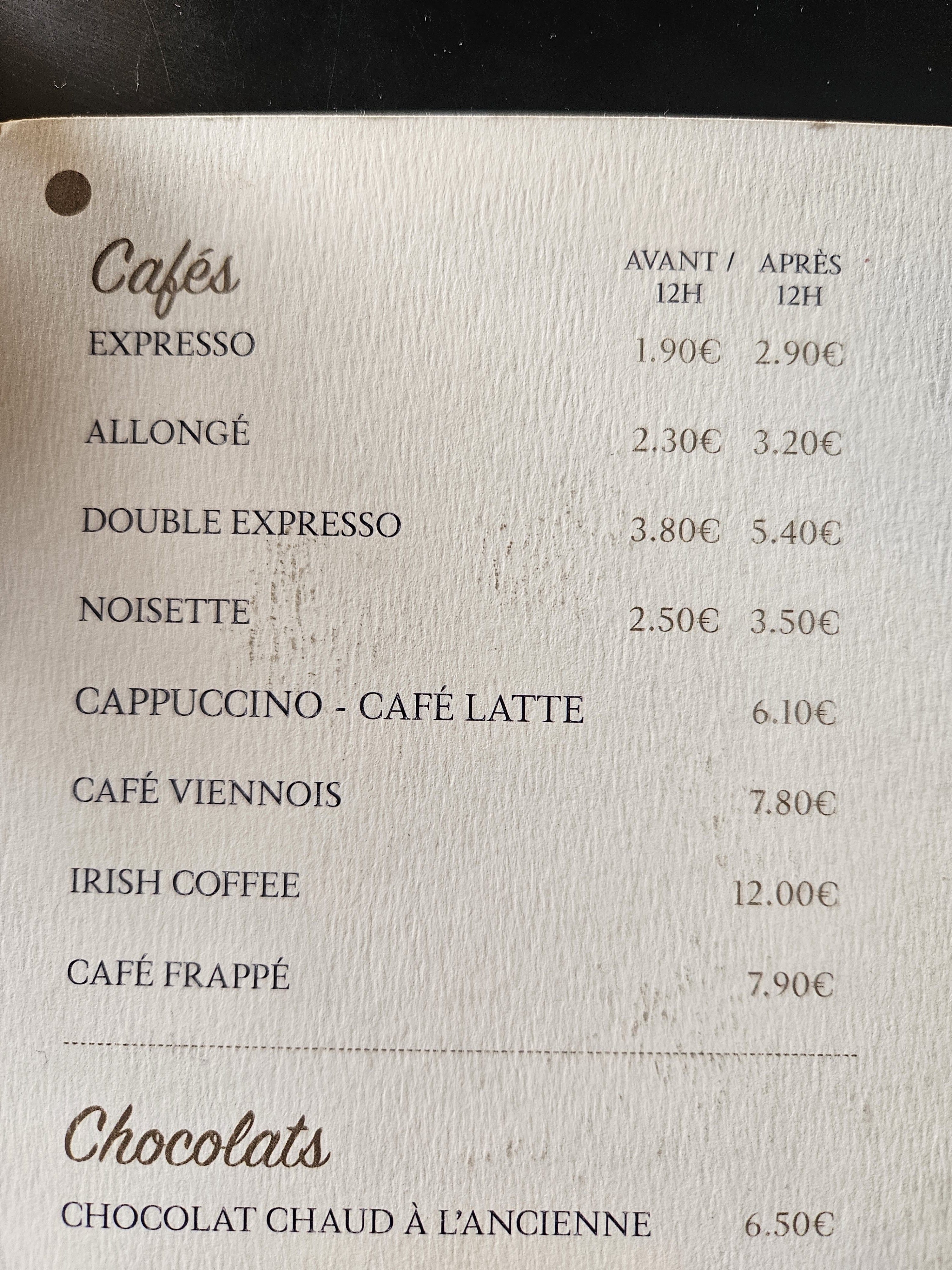 Je n'ai pas mangé sur place, mais mon avis ne me donnera pas envie de revenir pour tester. Chocolat chaud a l'ancienne et viennois à prix identique. La différence : le viennois est plus grand et avec de la chantilly en plus. Au final chocolat trop sucré et bu en deux gorgées. Les serveurs tirent tous la tête. L'espace est encombré et le personnel se cogne partout. Le lieu est sombre et sans intérêt. Les sièges sont inconfortables et très usés. Adresse à fuir. Je ne comprends pas comment un tel lieu peut encore exister. Remettez en cause le fonctionnement et la qualité des boissons. Ce n'est vraiment pas une institution.