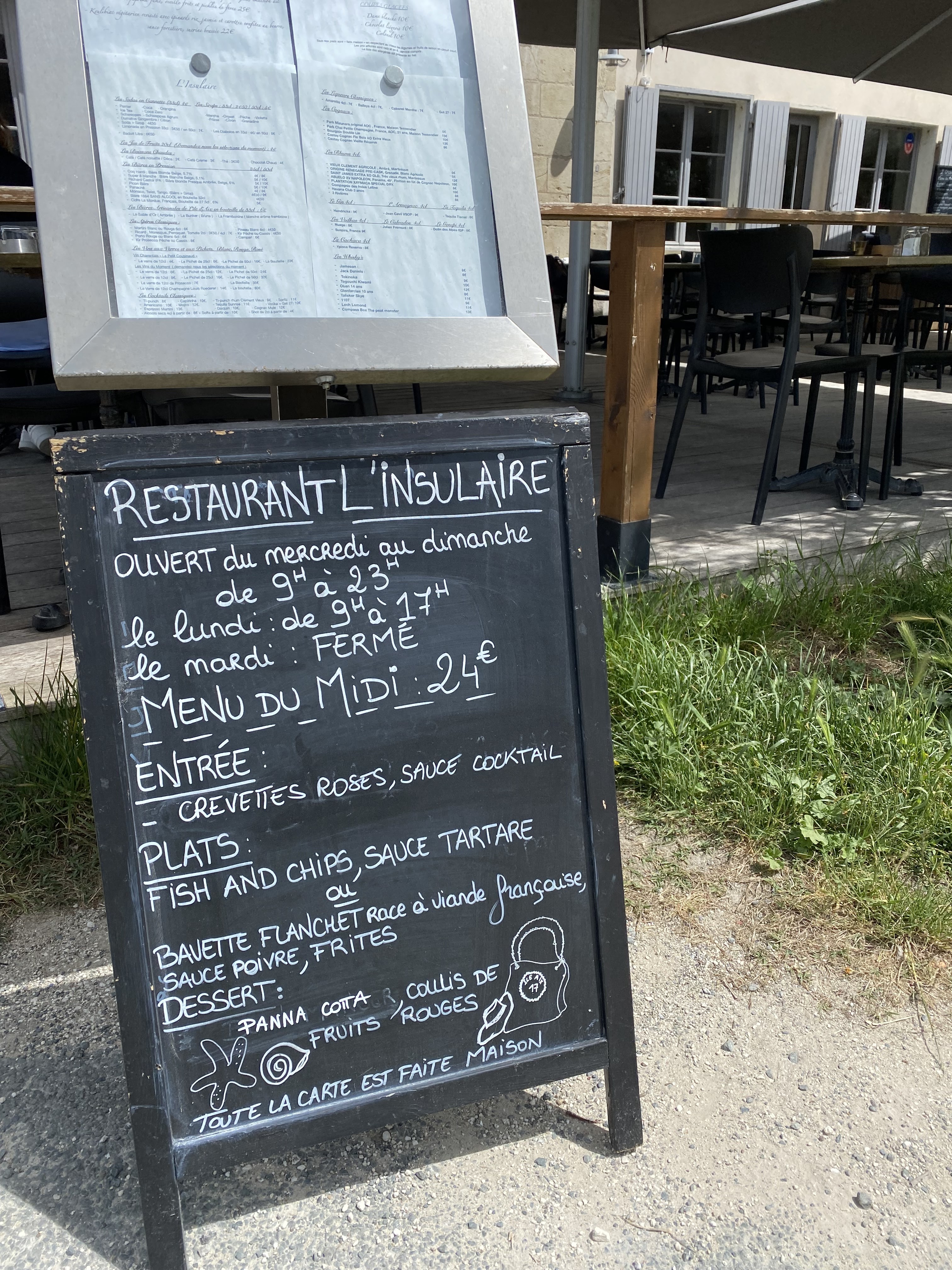 Nous avons mangé le menu du midi (24€), très bon rapport qualité/prix. Le repas était très très bon. Personnel très gentil. Nous recommandons à 100% si vous arrivez sur l’Ile d’Aix !!