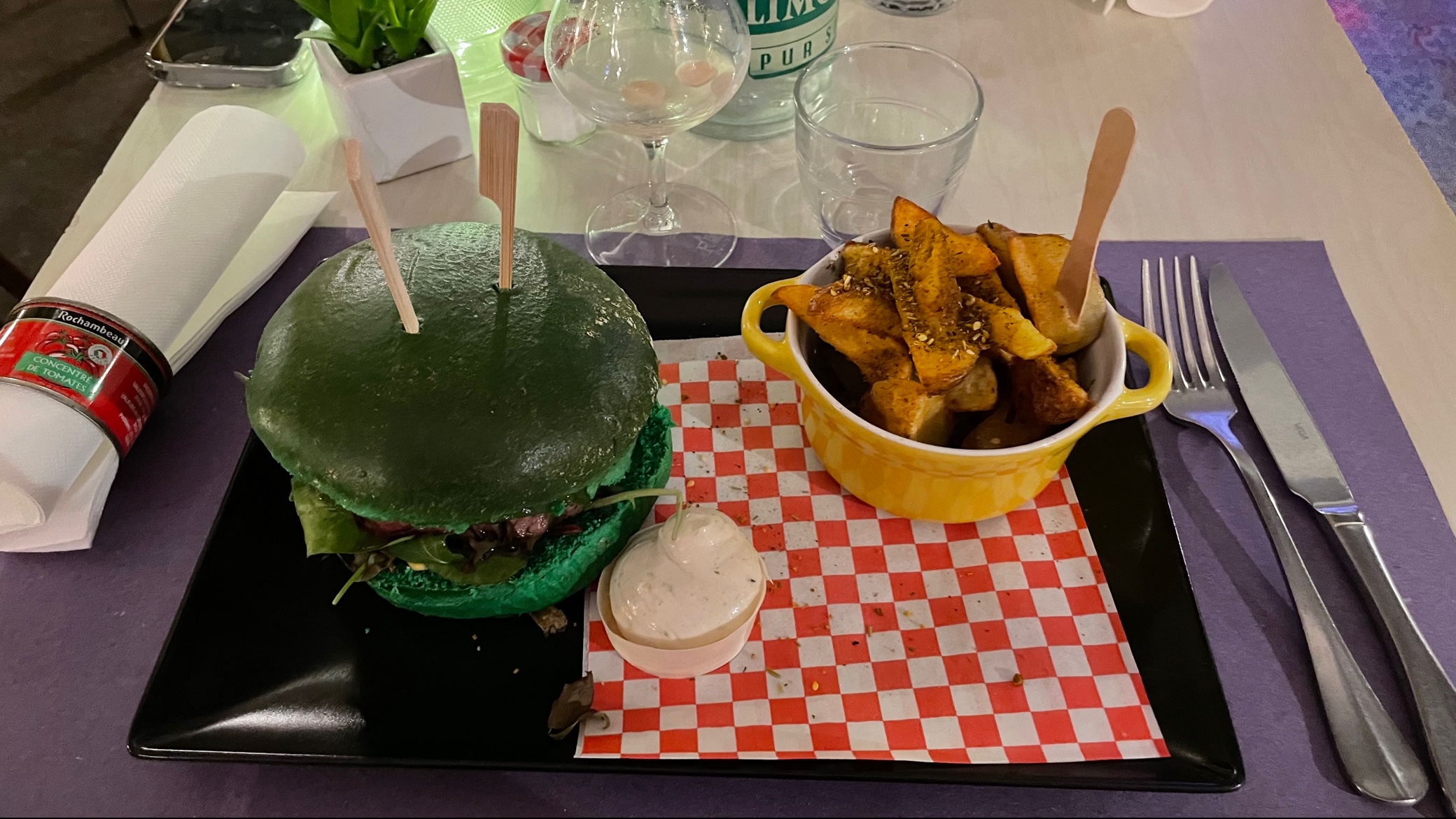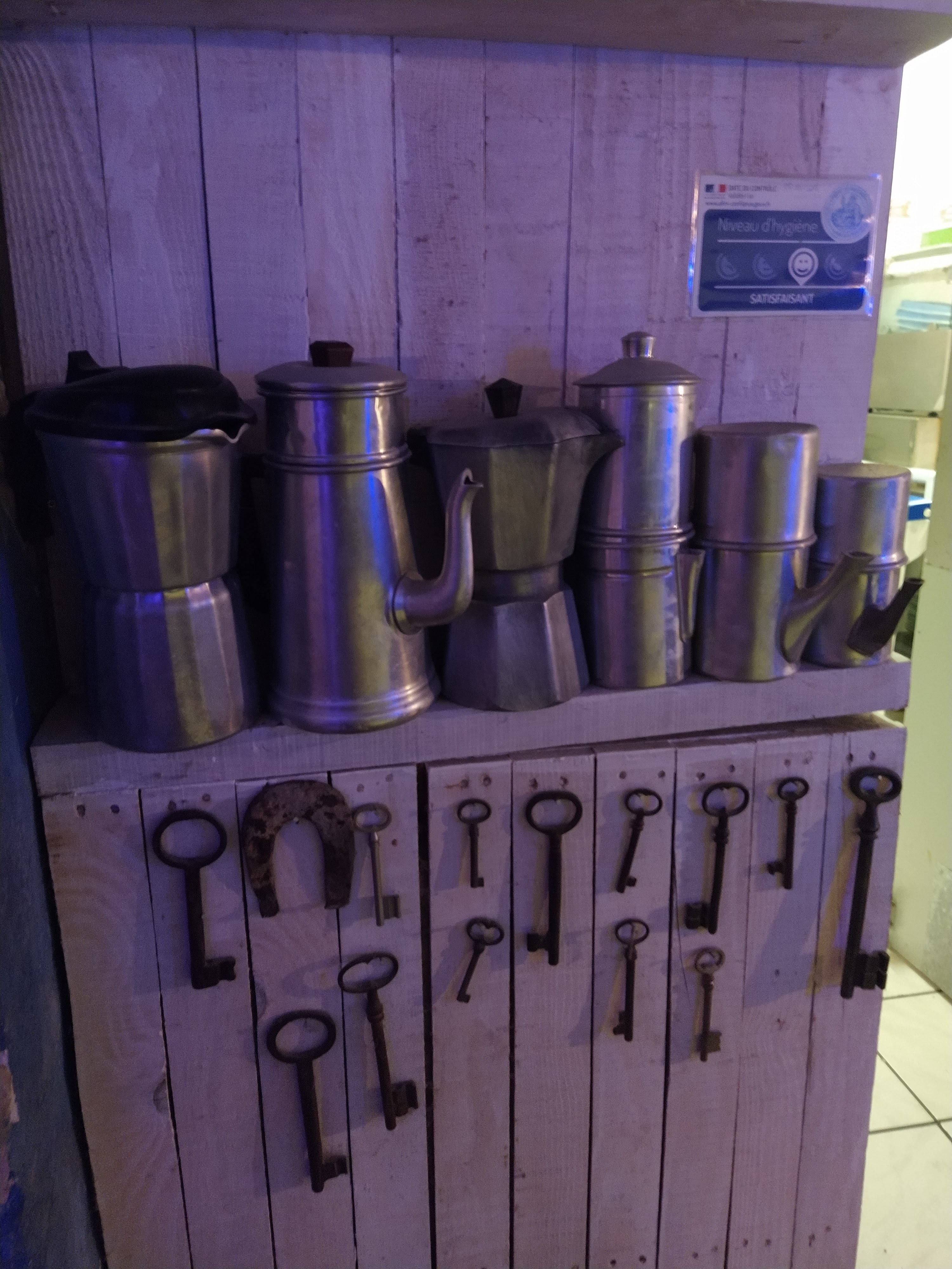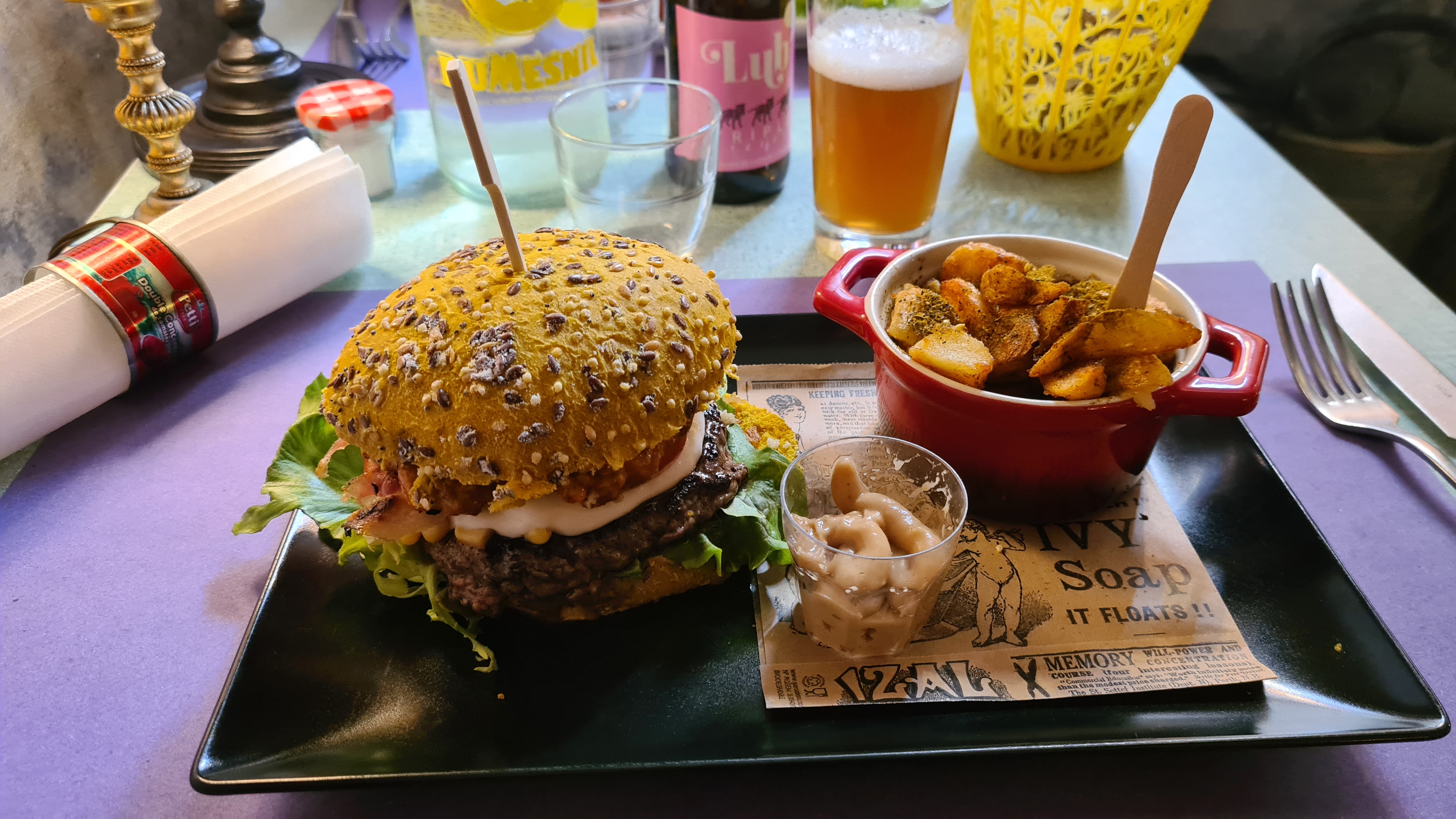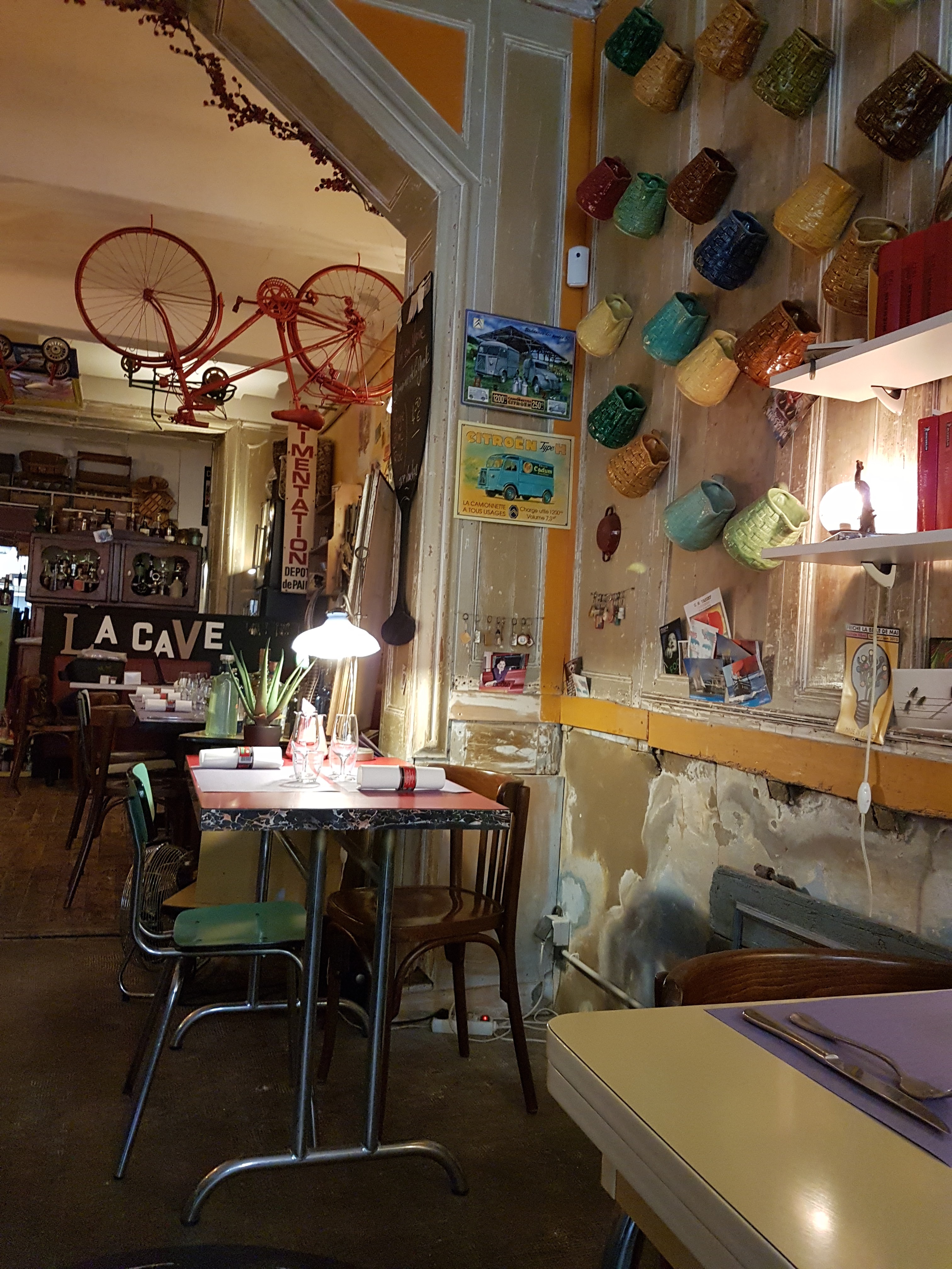 Sacrée découverte que l'intramuros dans Apt pour notre 1er jour de vacances dans le Lubéron ! D'abord vous entrez dans ce restaurant avec l'impression de s'installer au milieu d'une expo, objets divers et variés du sol au plafond, bicyclettes, sièges de tracteur, collection de cafetières et de presses purée, des boîtes de concentré de tomate transformées en rond de serviette, jusque dans les toilettes avec sa série de grenouilles et le Marcel pour s'essuyer les mains......😄 Ensuite, vous êtes accueilli par le patron qui a son franc parlé et qui est loin d'être lisse et conventionnel. Ce qui est excellent ! Enfin, les plats se démarquent par leur originalité avec de bons produits, par exemple, le burger du moment avec pesto et provologne. Et pour terminer, une surprise avec la liste des rhums plus longue que le bras (+ de 400 rhums répertoriés) dont le fils a une connaissance passionnée. Nous avons adoré passer ce 1er moment de nos vacances dans ce lieu. Je recommande vivement ce restaurant qui ne laisse pas indifférent. Pensez à réserver 😉.